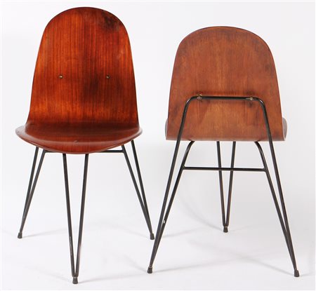 STRADA ENZO Coppia di sedie. Compensato curvo e ferro. Cm 45,00 x 82,00 x 41,00. Prodotto per Mobili Barovero, Torino. Anni '50. Bibliografia: Artecasa n.15, Dicembre 1960.