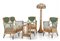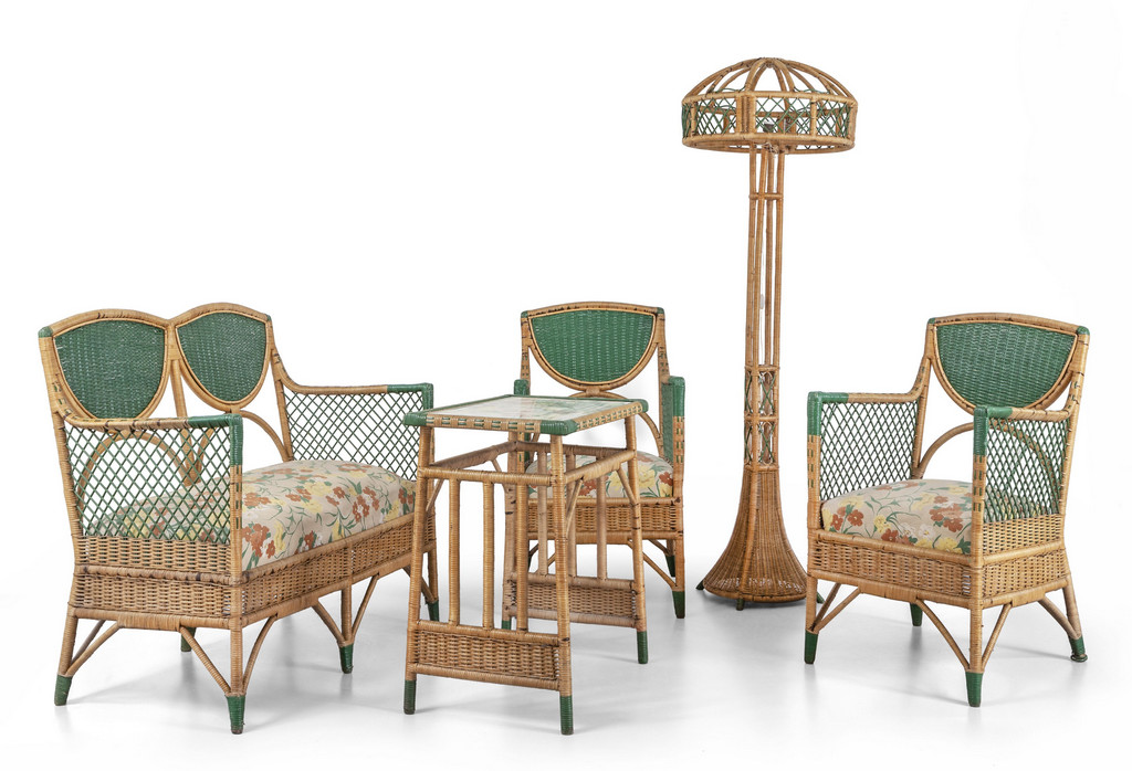 Composto da un divanetto due poltroncine un tavolino e una lampada da terra.
