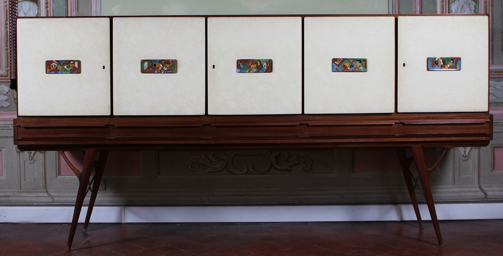 PARISI ICO (1916 - 1996) (Attribuito a.) Mobile da soggiorno. Legno di ciliegio. Cm 299,00 x 148,00 x 54,00. Prodotto per Paleari. Ante ricoperte in skai e frontalini dipinti con soggetti figurativi.
