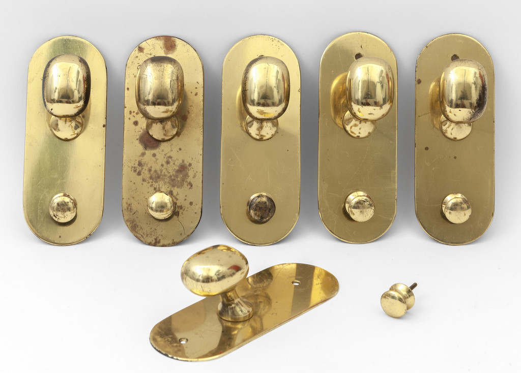 Sei maniglie 'M3' trasformate in appendiabiti e sei pomoli per mobili anni '50.