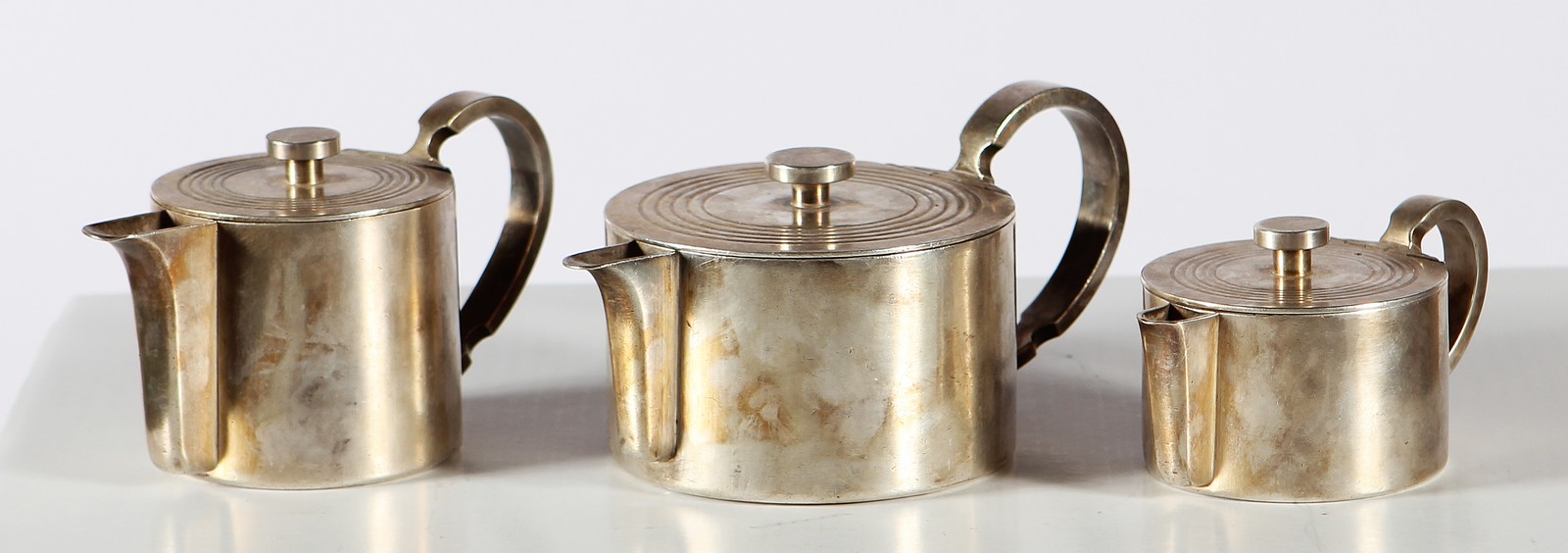 PONTI GIO' (1891 - 1979) Tre teiere. Metallo argentato. . Dimensioni: cm 9x20; 9x16; 13.5x7. Anni '30.
