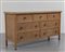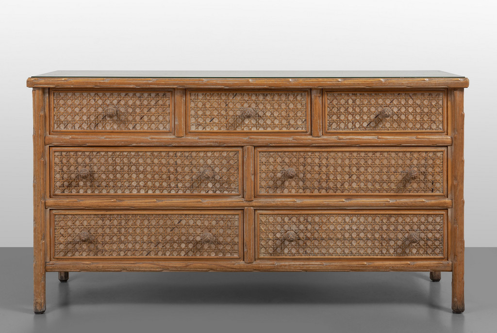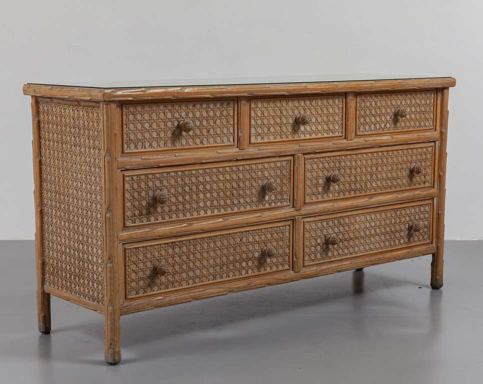 Legno di faggio piano e cassetti rivestiti in canna d'India intrecciata maniglie di legno intagliato.