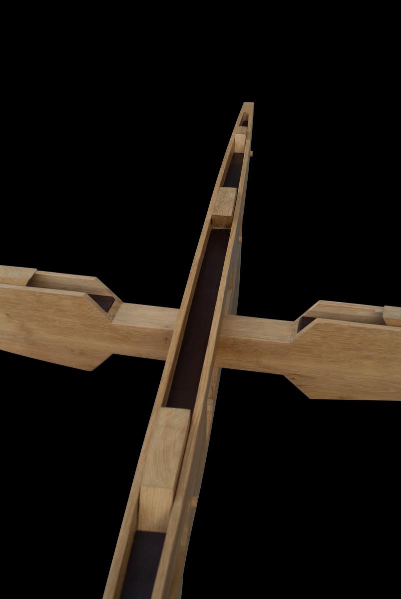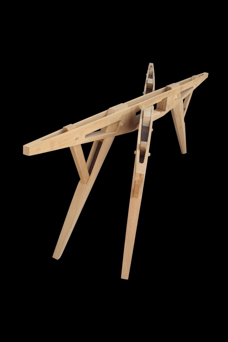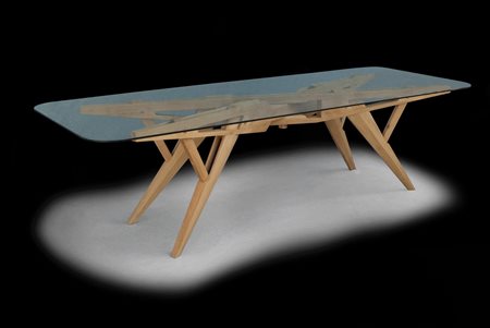 LE OPERE E I GIORNI Tavolo Forfe. Legno. Cm 260,00 x 76,00 x 120,00. Esemplare n.5 di 10. Tavolo di ebanisteria in rovere castagno e palissandro.