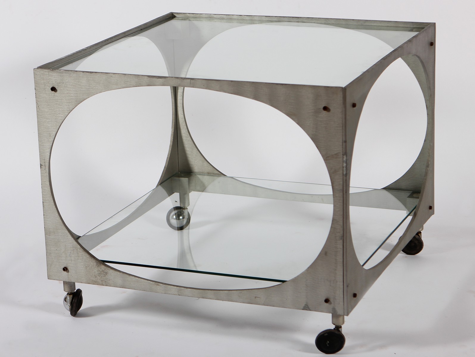 BURCHIELLARO LORENZO (n. 1933) Carrello portavivande. Alluminio e vetro. Cm 65,00 x 54,00 x 65,00. Anni '60. Firma a lato.