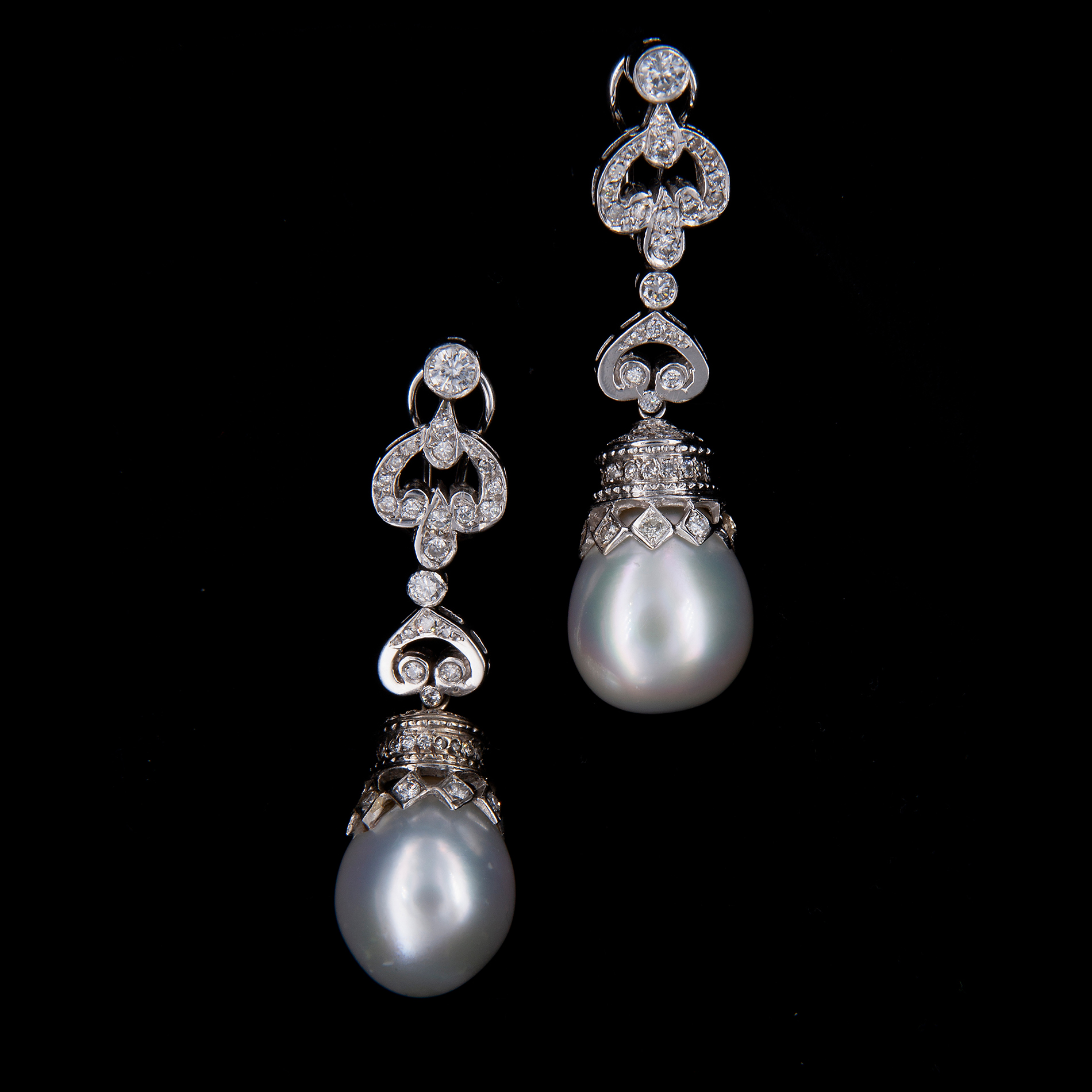 Coppia di orecchini pendenti in oro bianco, diamanti e perle South Sea