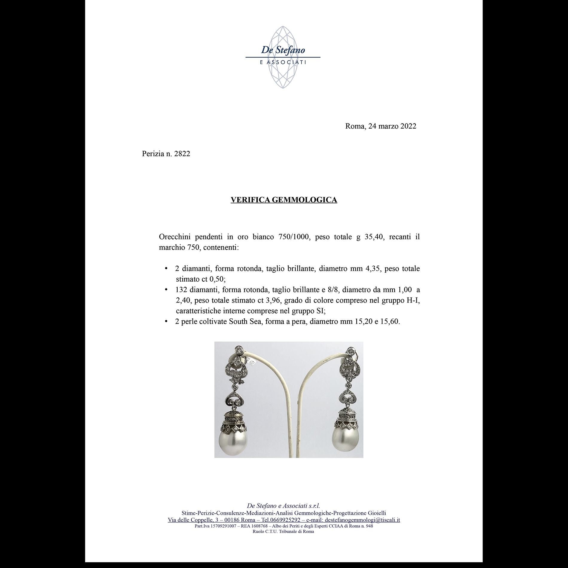 Coppia di orecchini pendenti in oro bianco, diamanti e perle South Sea Presente marchio oro bianco 118 kt, 134 diamanti rotondi, taglio brillante e 8/8, peso totale stimato 4,46 ct; 2 perle coltivate South Sea, forma a pera. Peso complessivo gr. 35,40