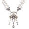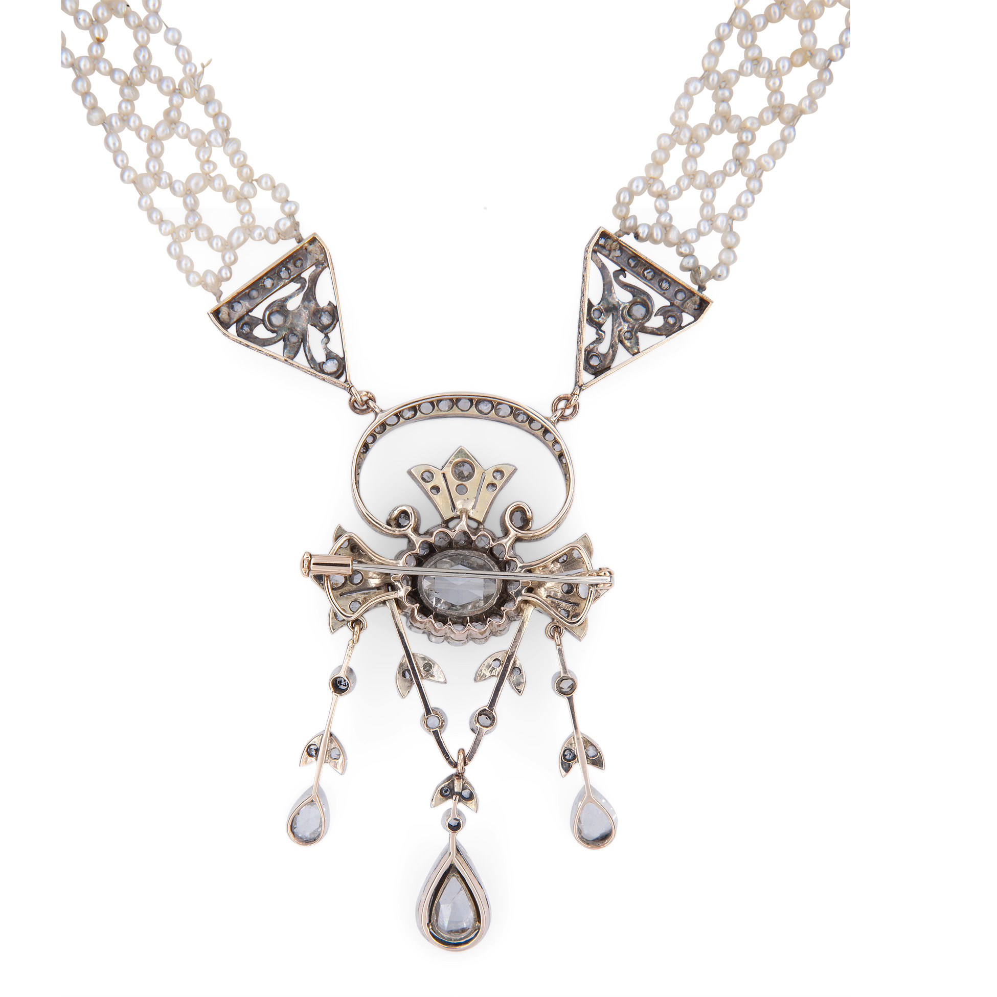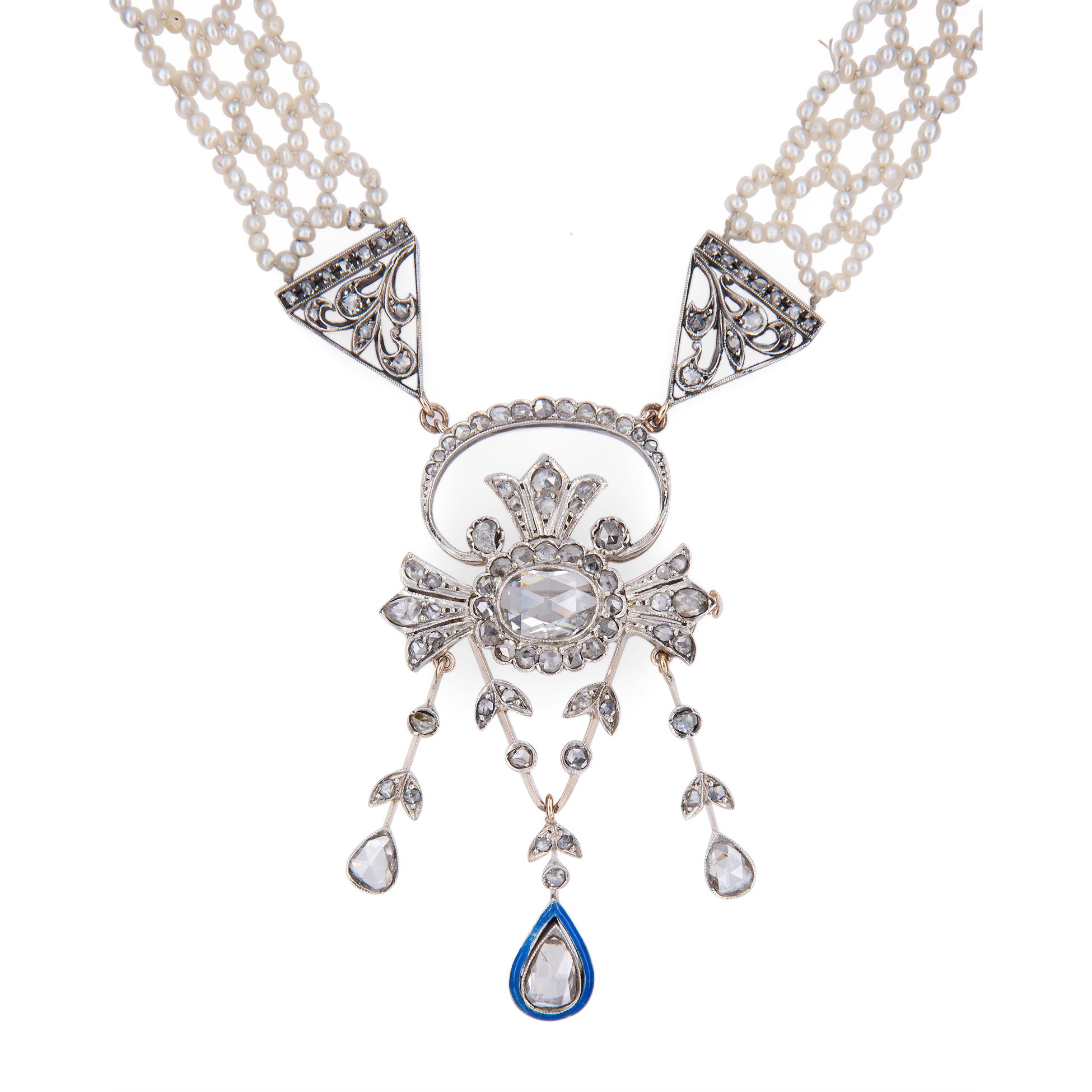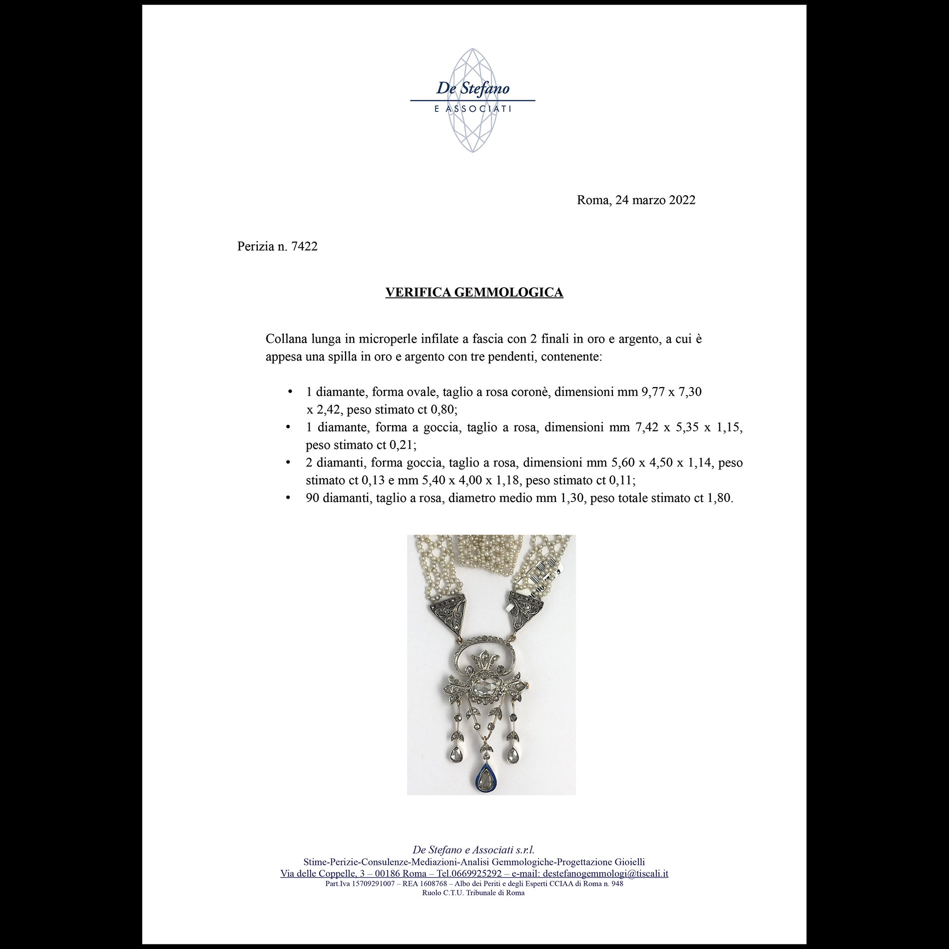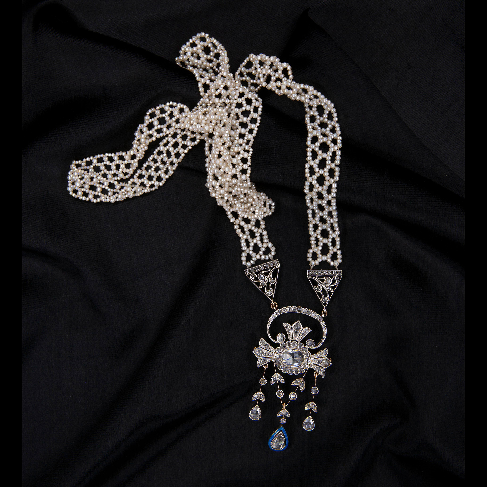 Antica collana lunga in microperle infilate a cui è appesa una spilla in oro, argento e diamanti con tre pendenti Collana a fascia con 2 finali in oro e argento, decorata da 93 diamanti taglio a rosa - di cui tre in forma di goccia - peso totale stimato
