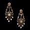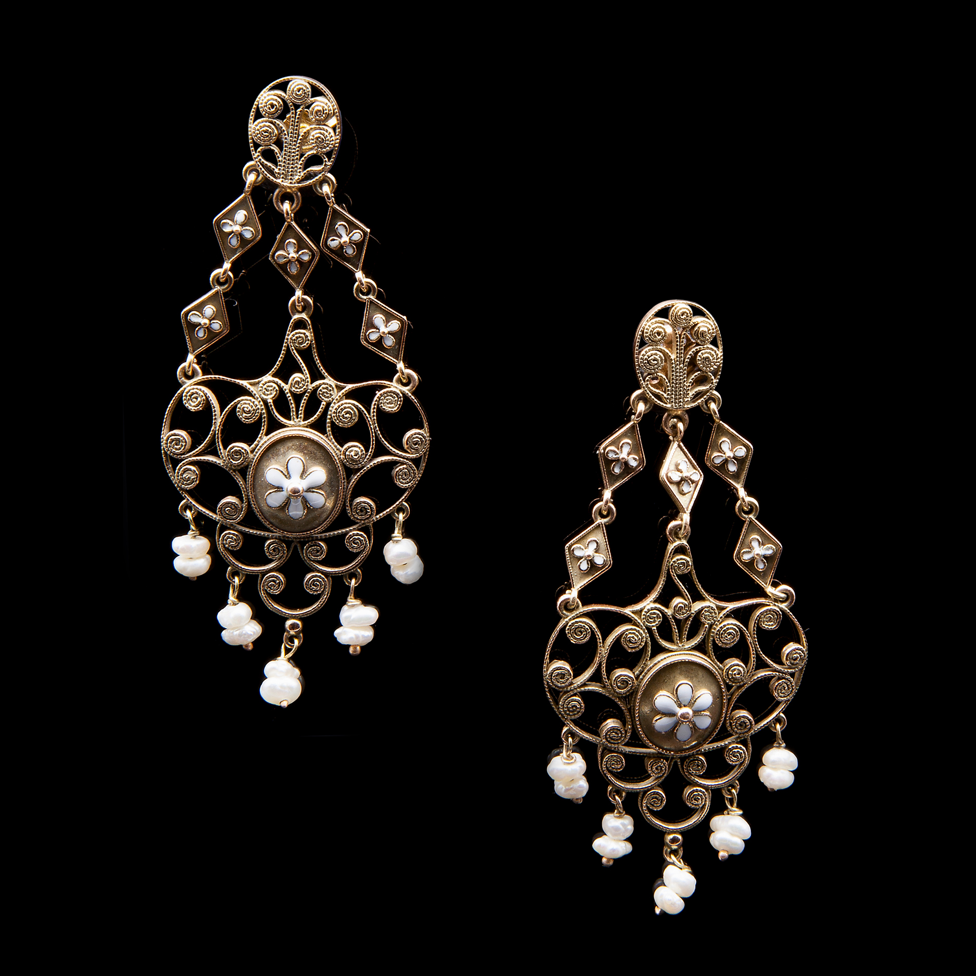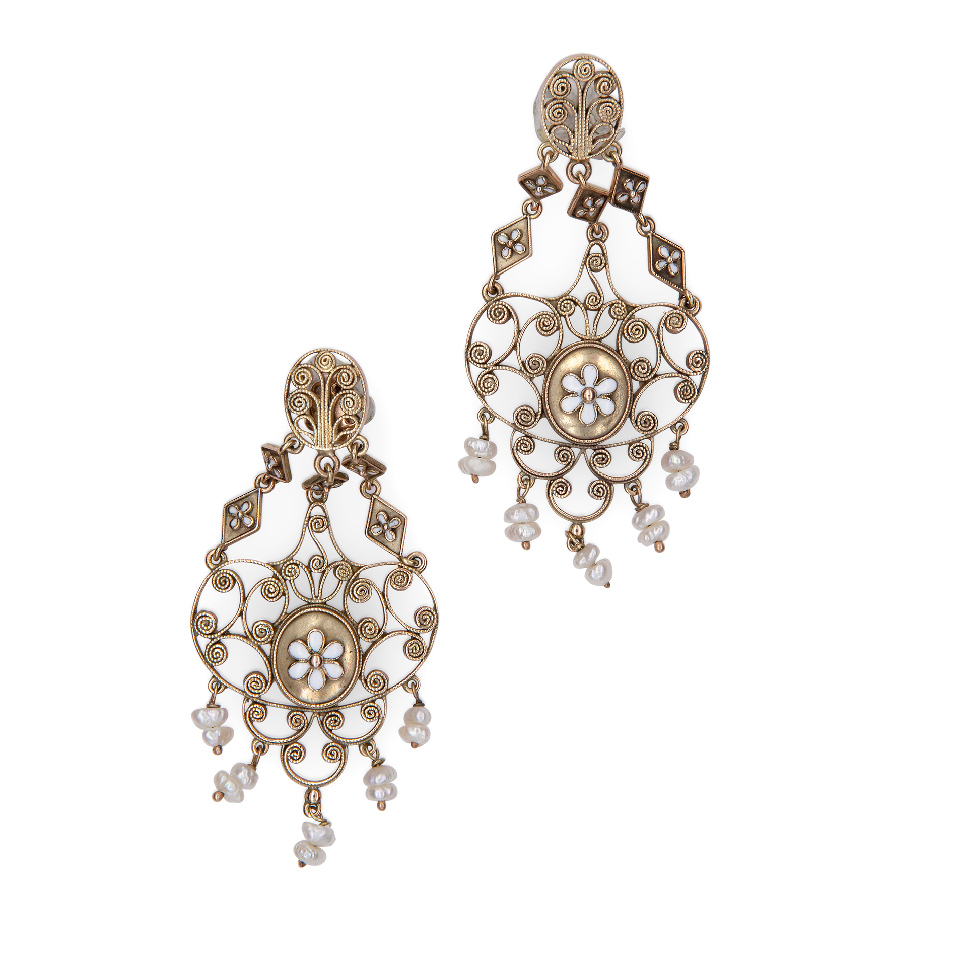 Antichi orecchini pendenti in filigrana di oro giallo, smalti e perle