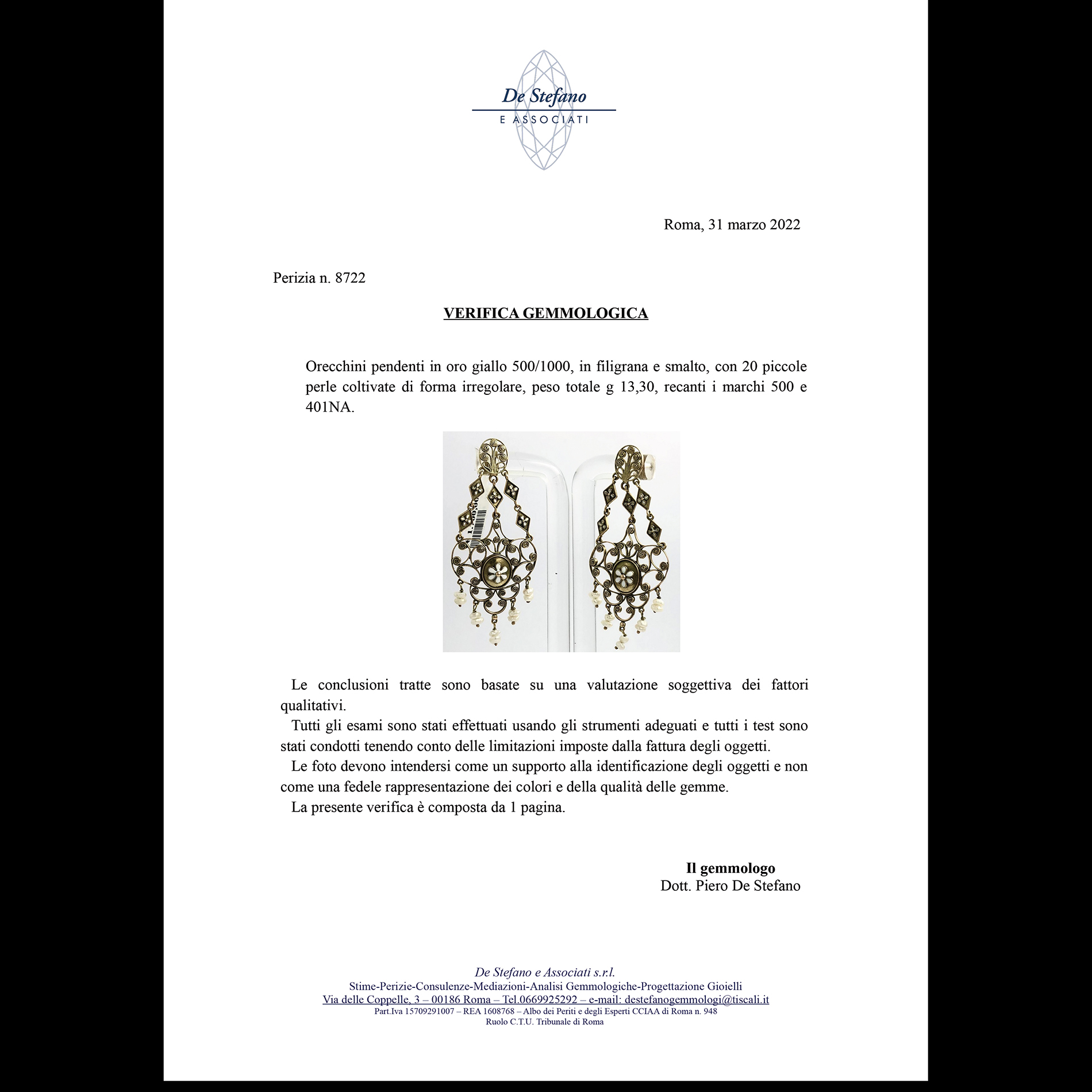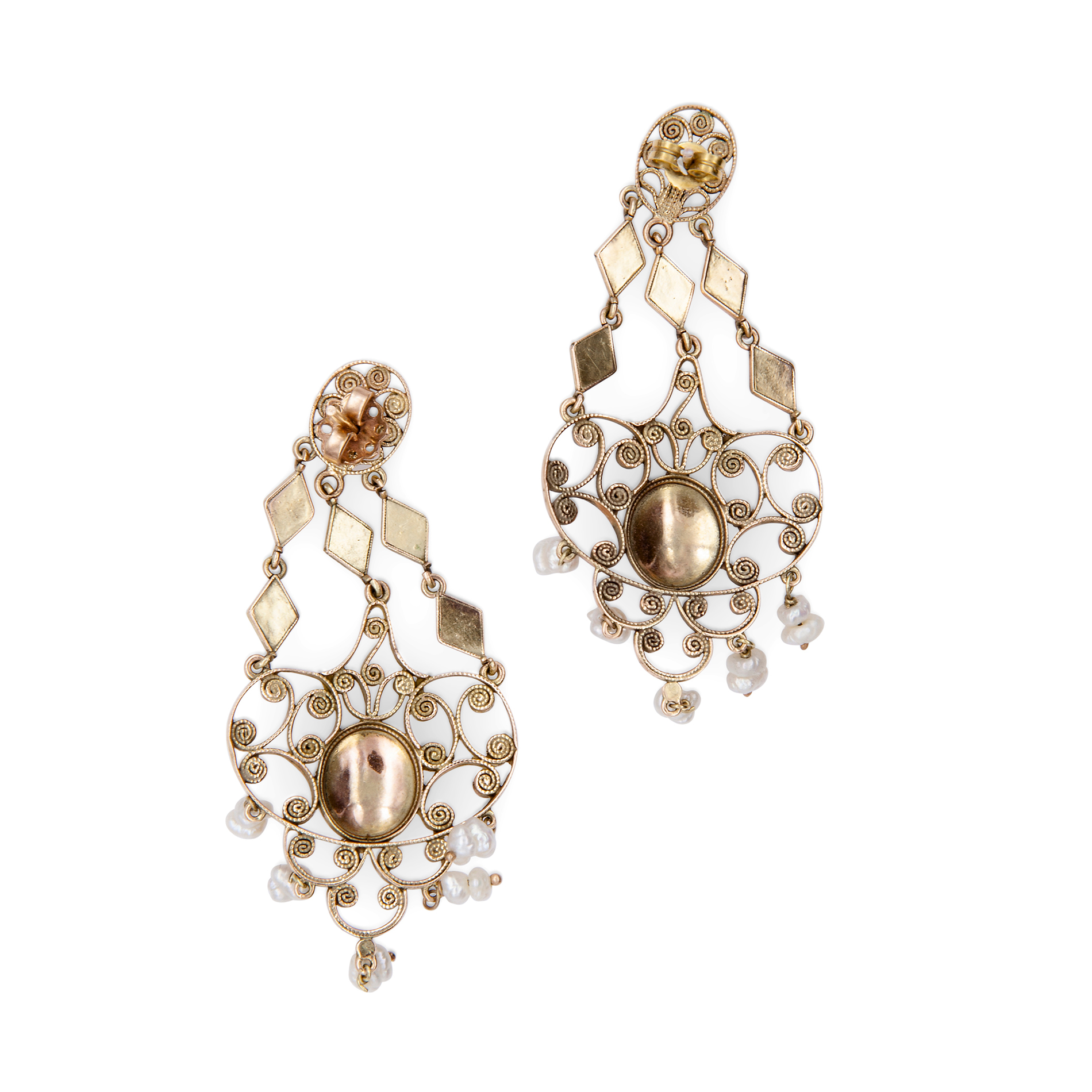 Antichi orecchini pendenti in filigrana di oro giallo, smalti e perle Oro giallo 12 kt, con 20 piccole perle di forma irregolare. Peso complessivo gr. 13,30, recanti i marchi 500 e 401NA.