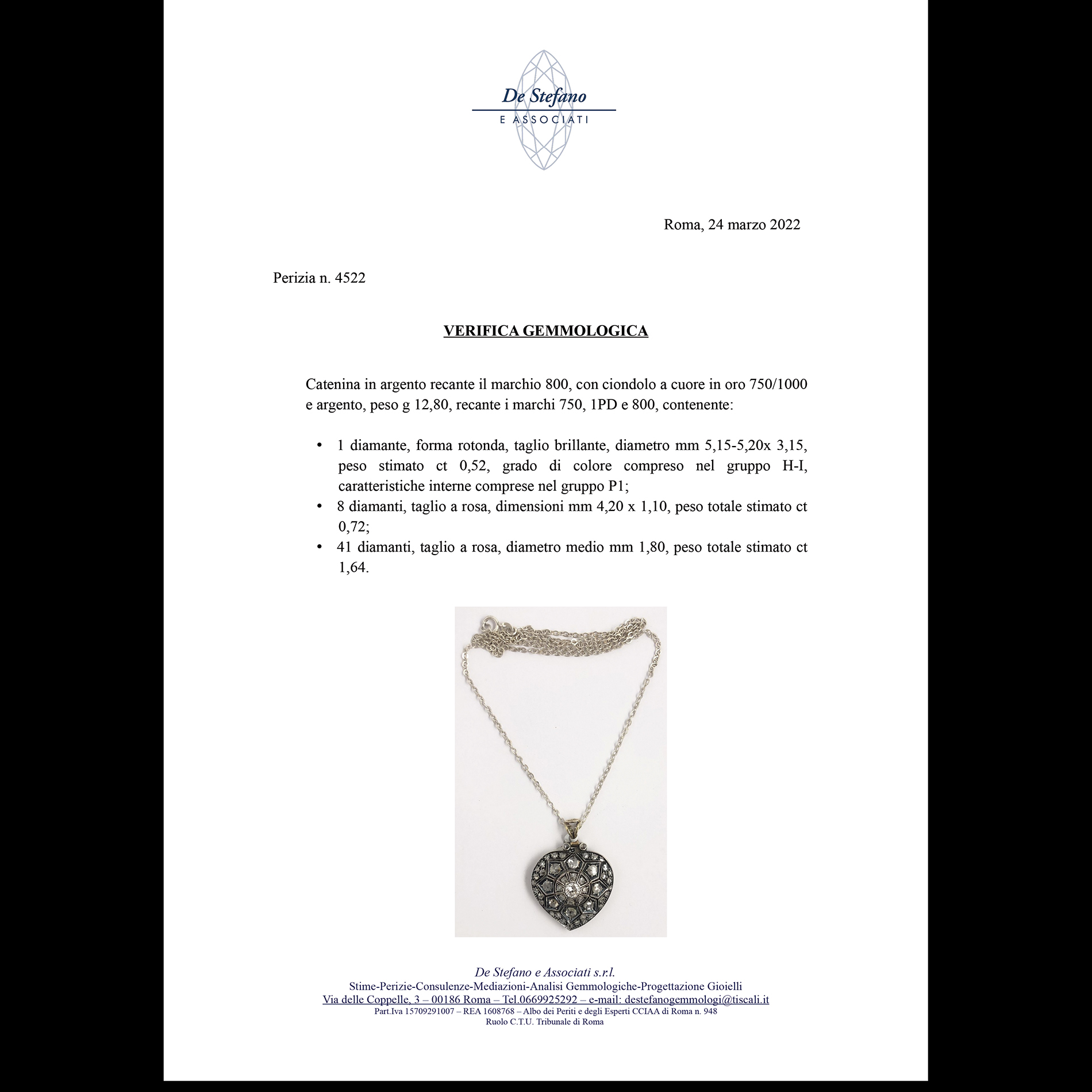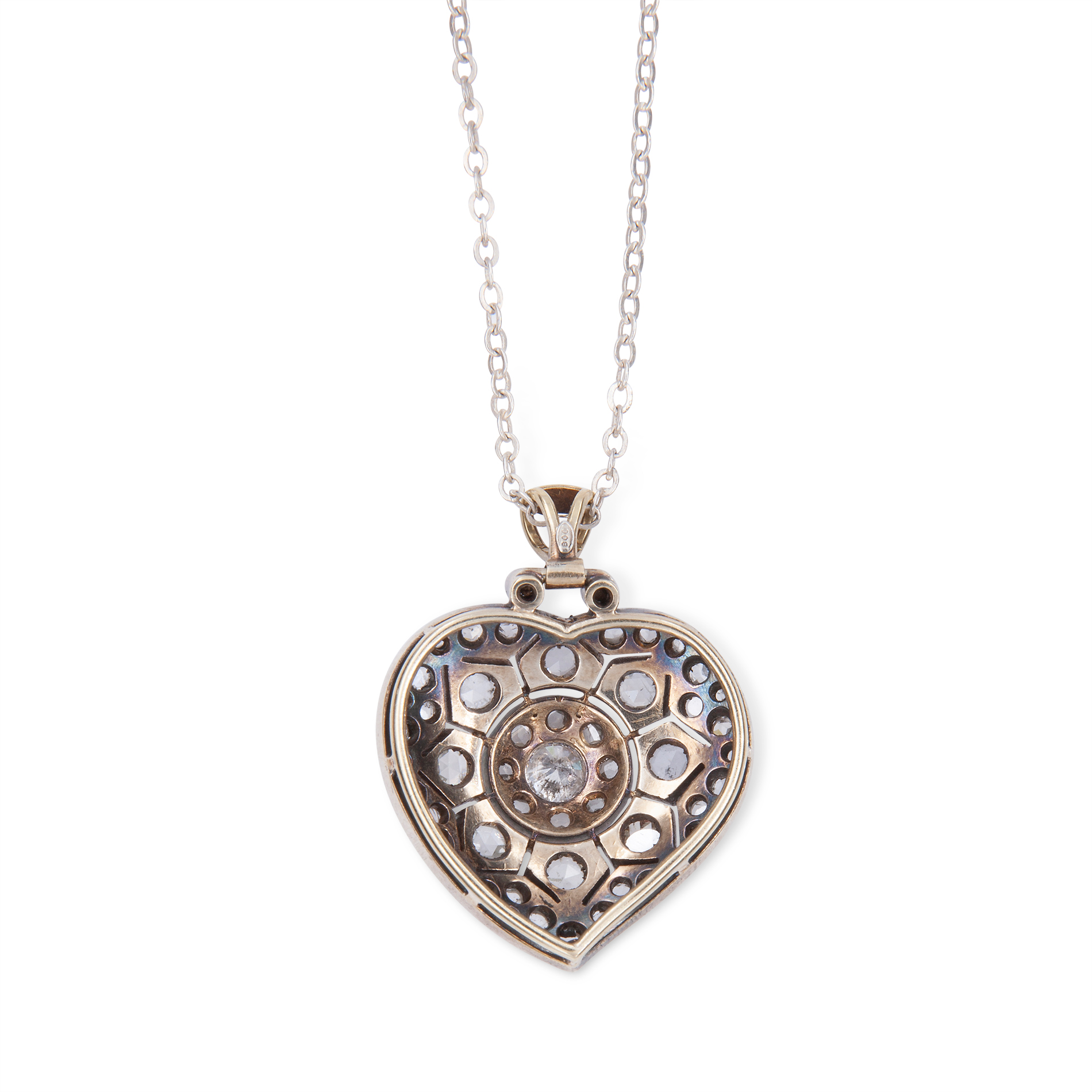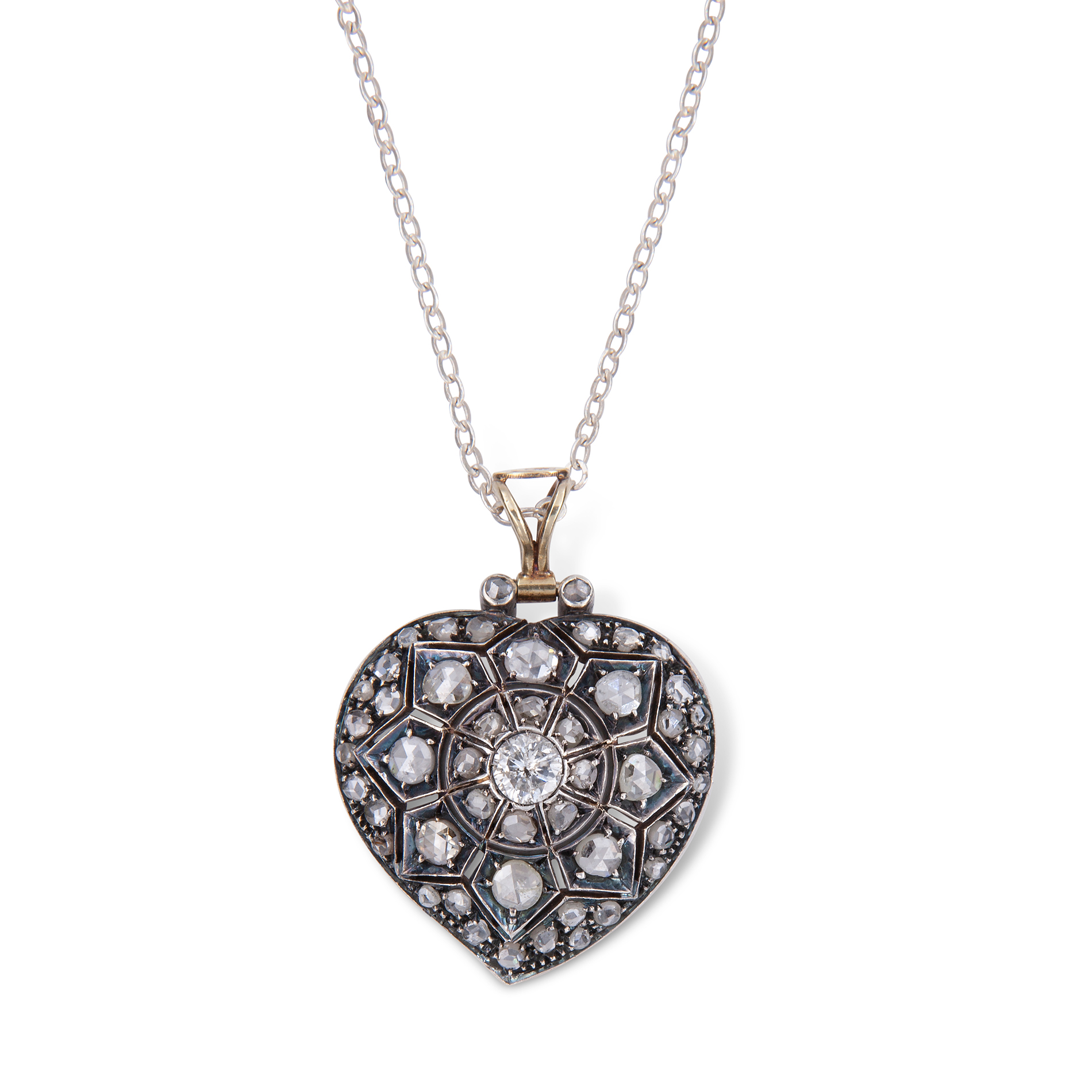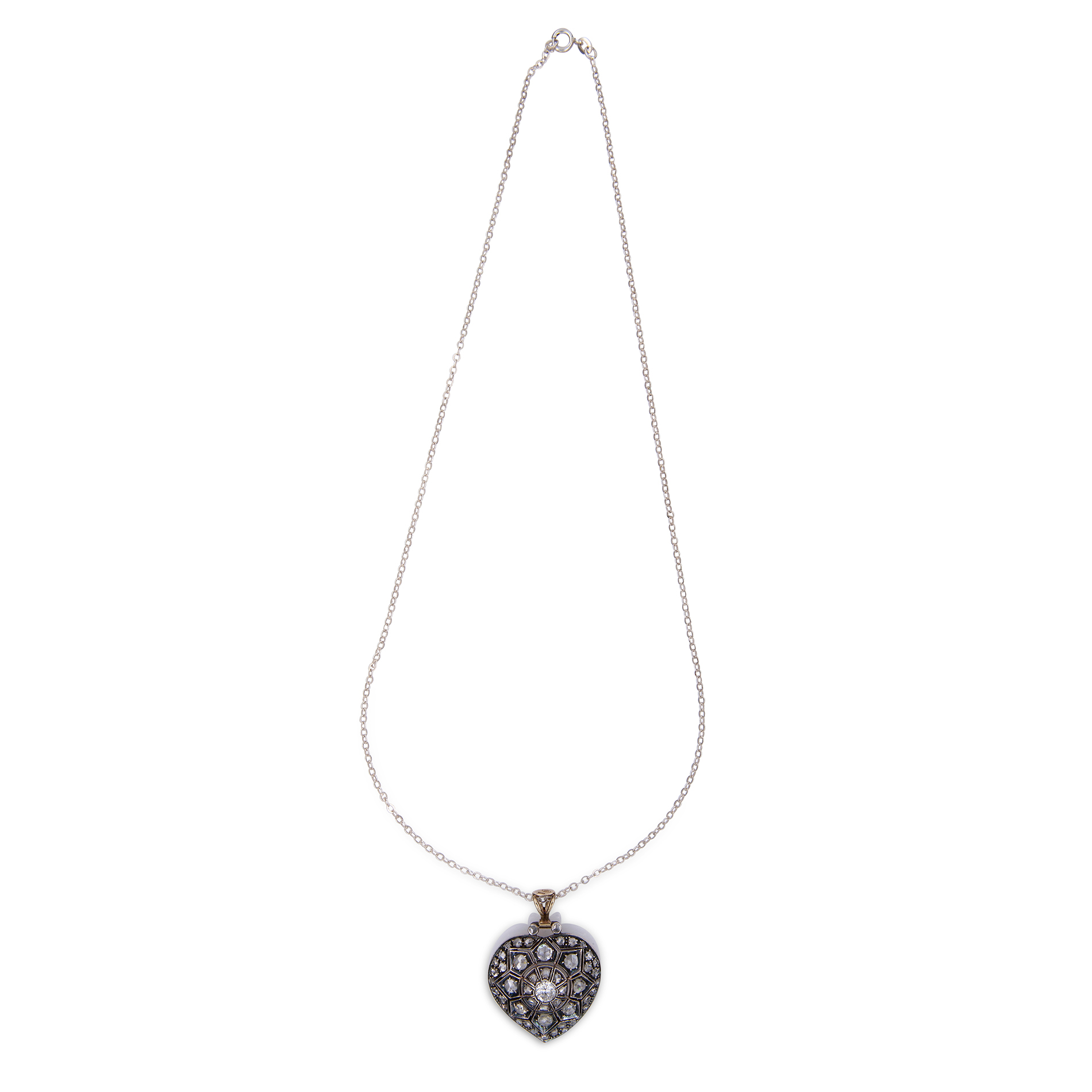 Catenina in argento con ciondolo a cuore in oro bianco e argento Oro 18 kt e argento, 1 diamante rotondo taglio brillante, peso stimato ct 0,52 e 49 diamanti taglio a rosa, peso totale stimato 2,36 ct. Peso complessivo gr. 12,80, recante i marchi 750, 1