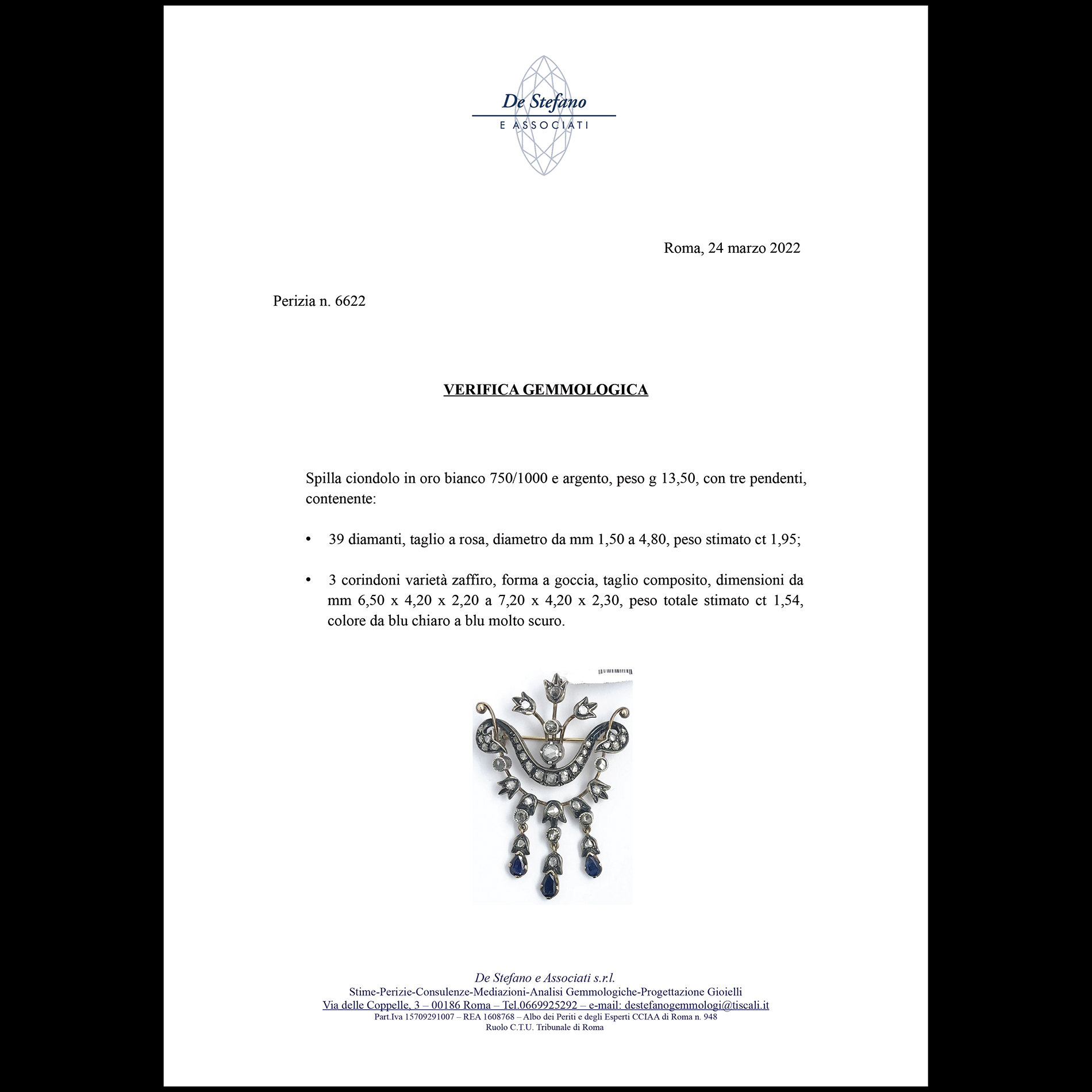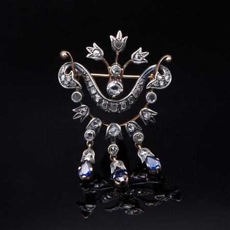 Antica spilla in oro bianco e argento a tre pendenti con zaffiri Oro bianco 18 kt e argento, 39 diamanti taglio a rosa, peso stimato 1,95 ct. 3 zaffiri a goccia, taglio composito, peso totale stimato ct 1,54. Peso complessivo gr. 13,50