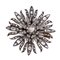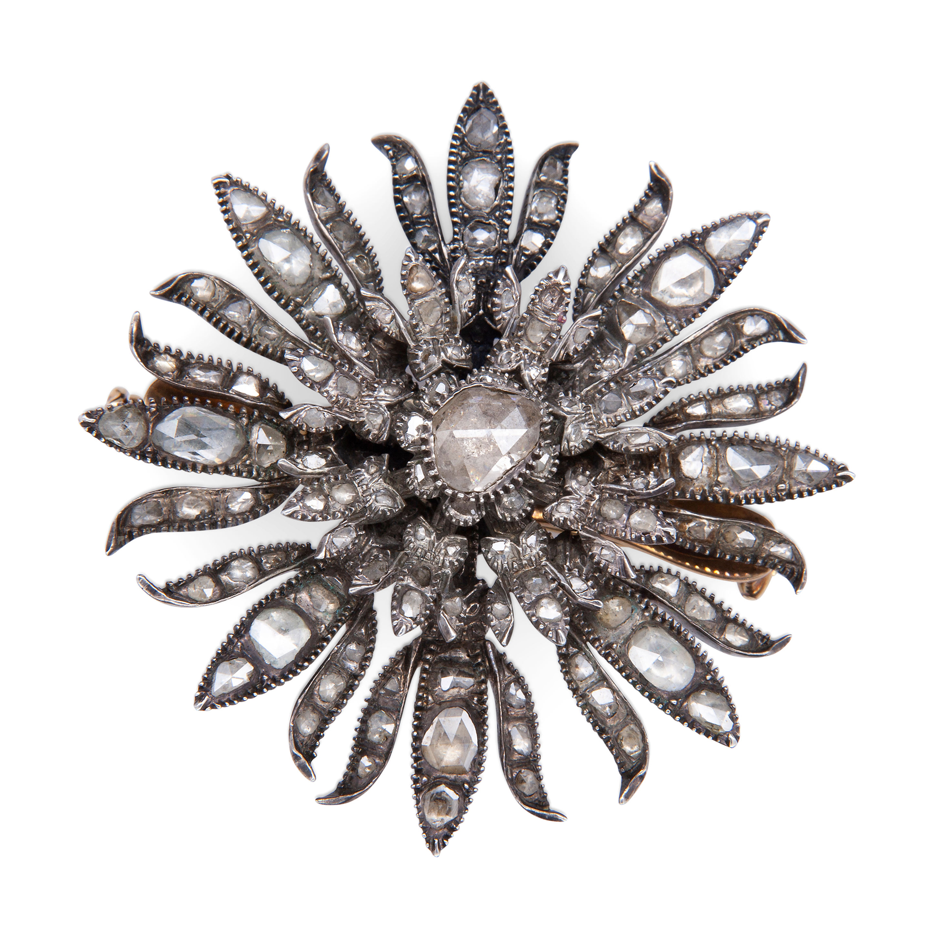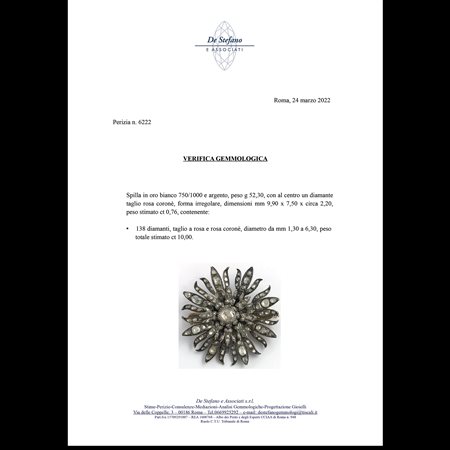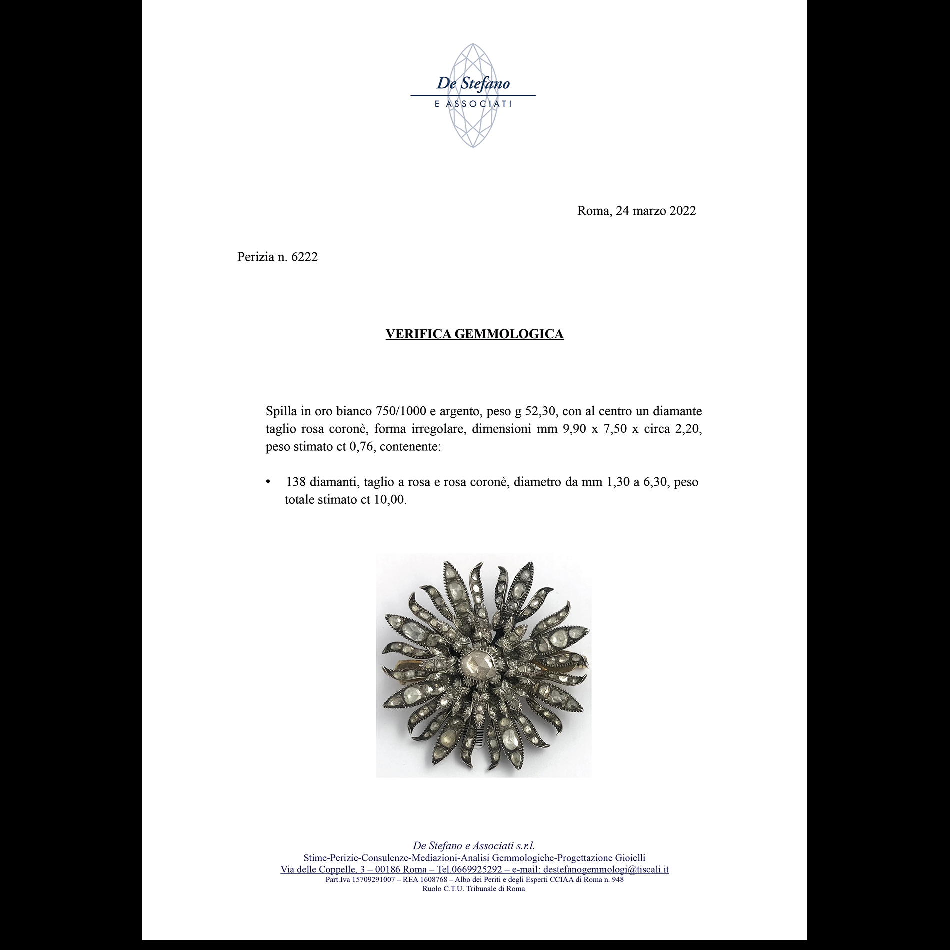 Spilla in oro bianco, argento e diamanti Oro bianco 18 kt e argento; 138 diamanti, taglio a rosa e al centro un diamante taglio rosa coronè, peso totale stimato 10,76 ct. Peso complessivo gr. 52,30