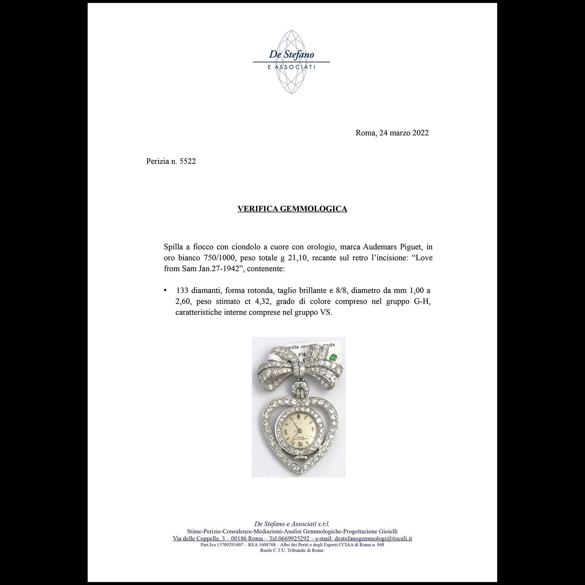 Spilla a fiocco con ciondolo a cuore con orologio Audemars Piguet in oro bianco e diamanti Oro bianco 18 kt, 133 diamanti rotondi taglio brillante e 8/8, peso stimato ct 4,32. Peso complessivo gr. 21,10, recante sul retro l’incisione: 'Love from Sam Jan