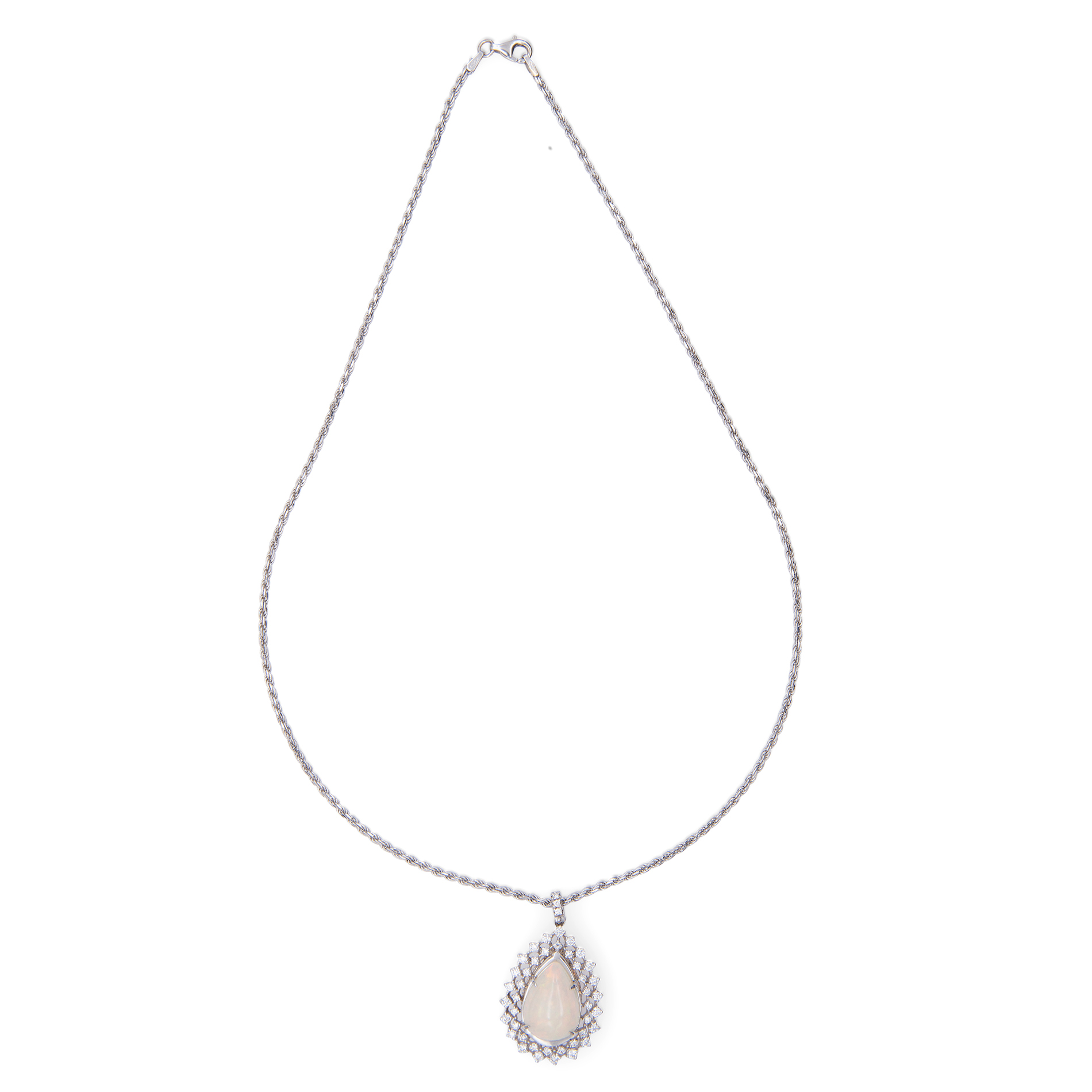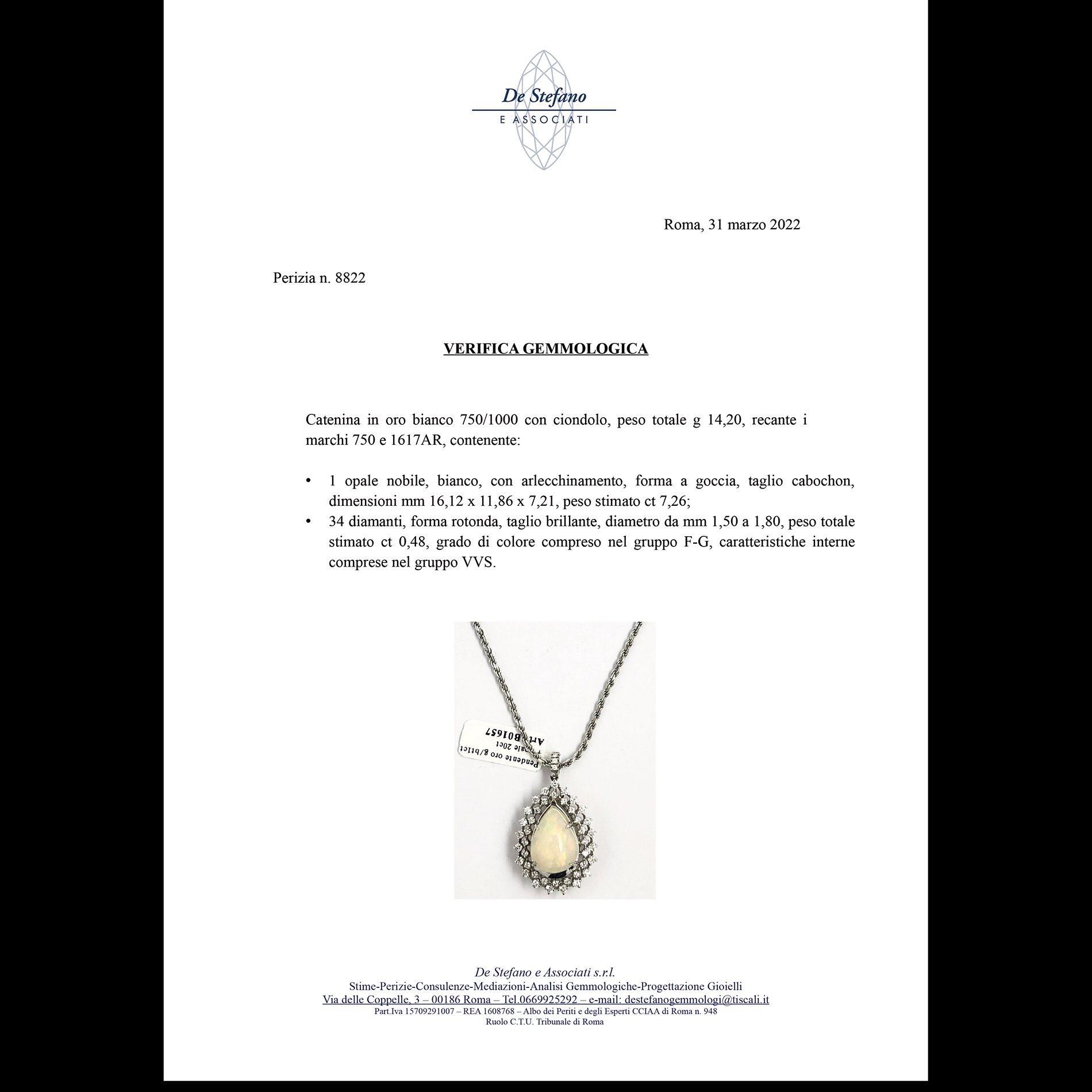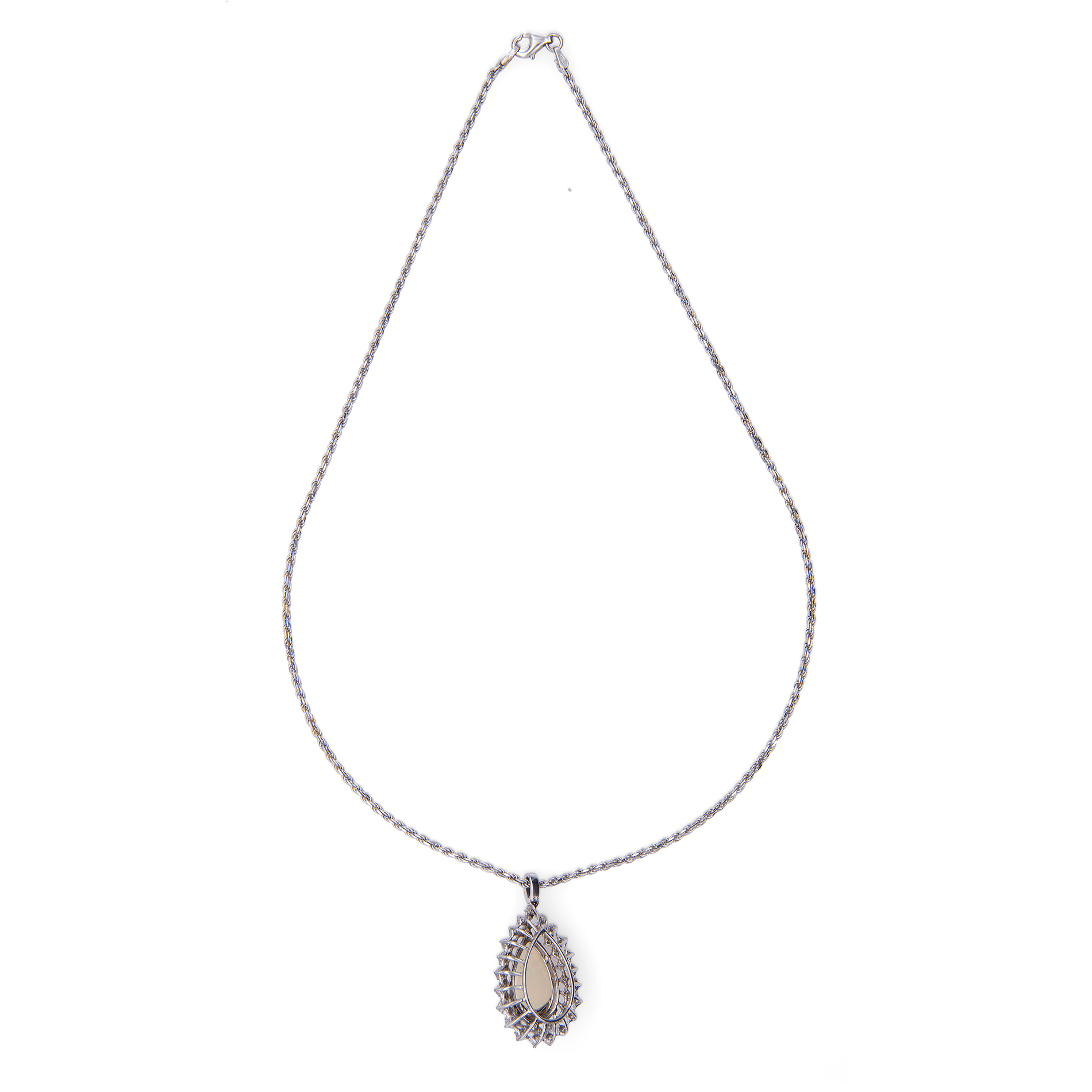 Catenina con ciondolo in oro bianco, opale e diamanti Oro bianco 18 kt, opale nobile a goccia bianco taglio cabochon,peso stimato 7,26 ct; 34 diamanti rotondi taglio brillante, peso totale