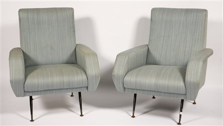 RADICE GIGI Coppia di poltrone. Metallo e tessuto. Cm 73,00 x 87,00 x 75,00. Prodotto per Minotti. Anni '50.