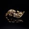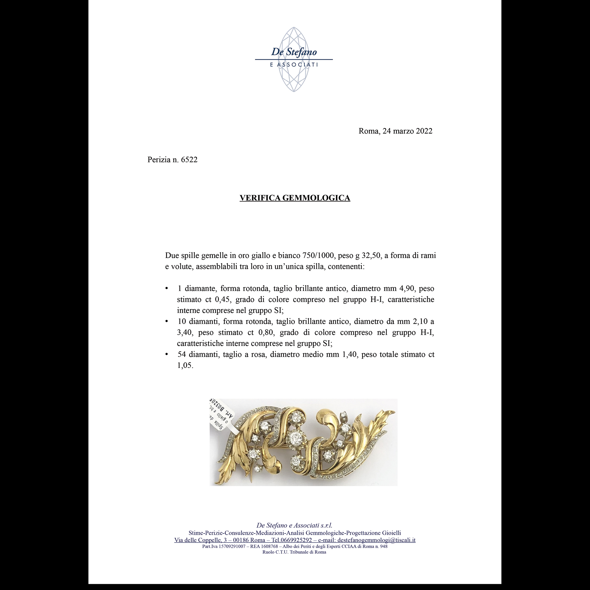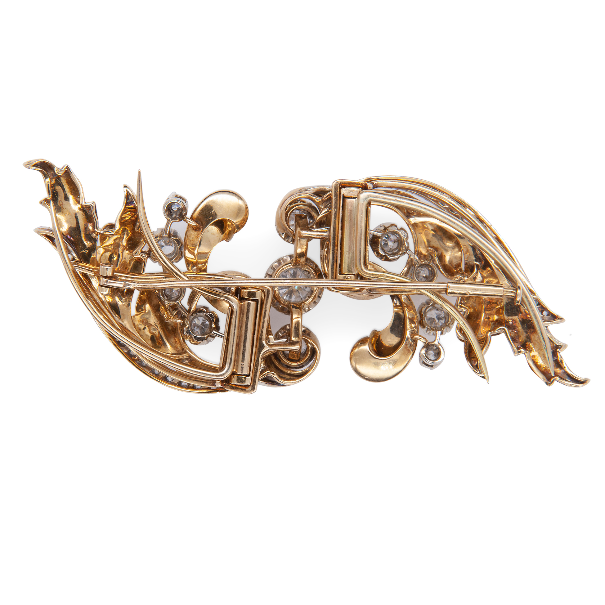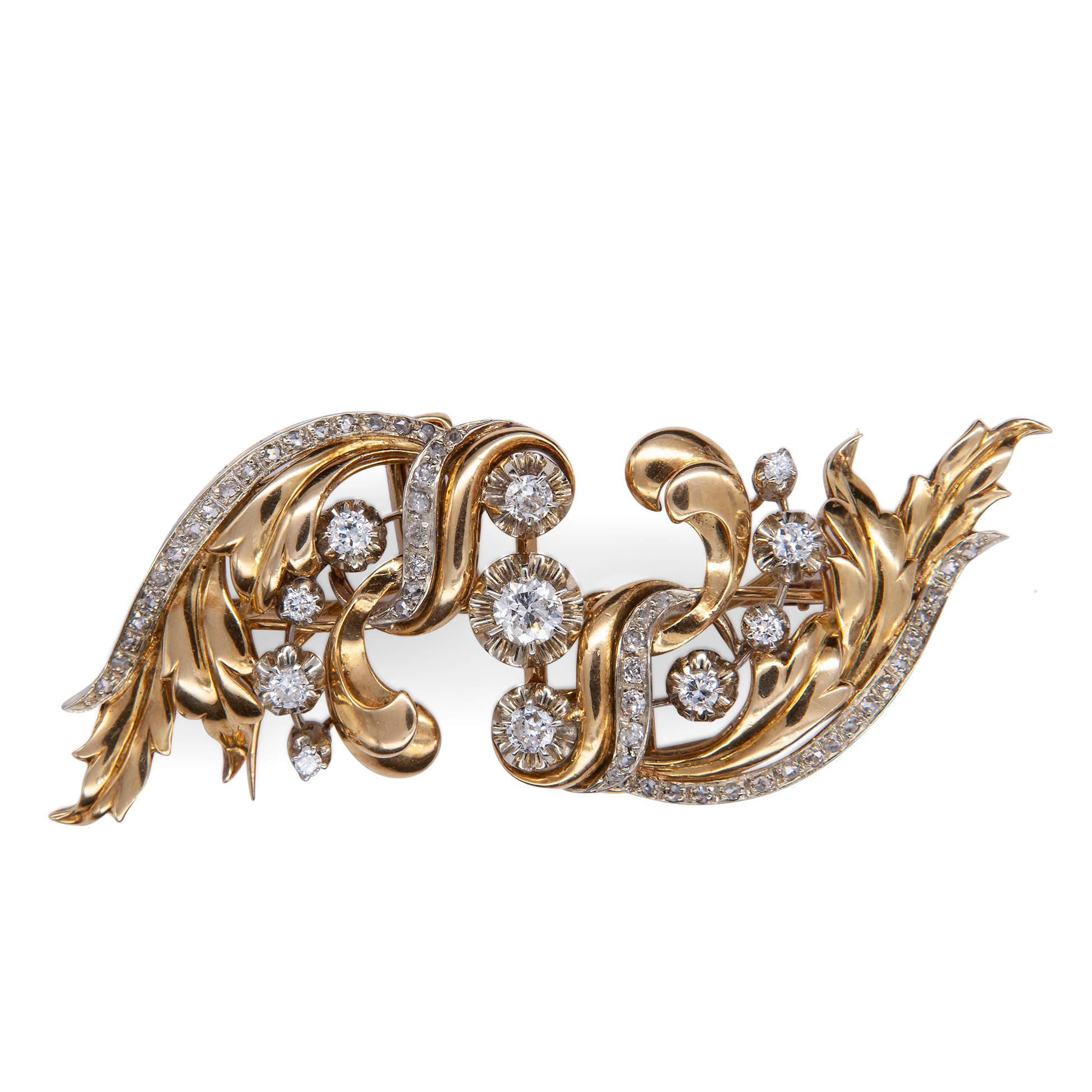 Duette in oro giallo e bianco con diamanti Spilla in forma di rami e volute, oro giallo e bianco 18 kt; 11 diamanti rotondi taglio brillante antico, peso totale stimato 3,07 ct. Peso complessivo gr. 32,50