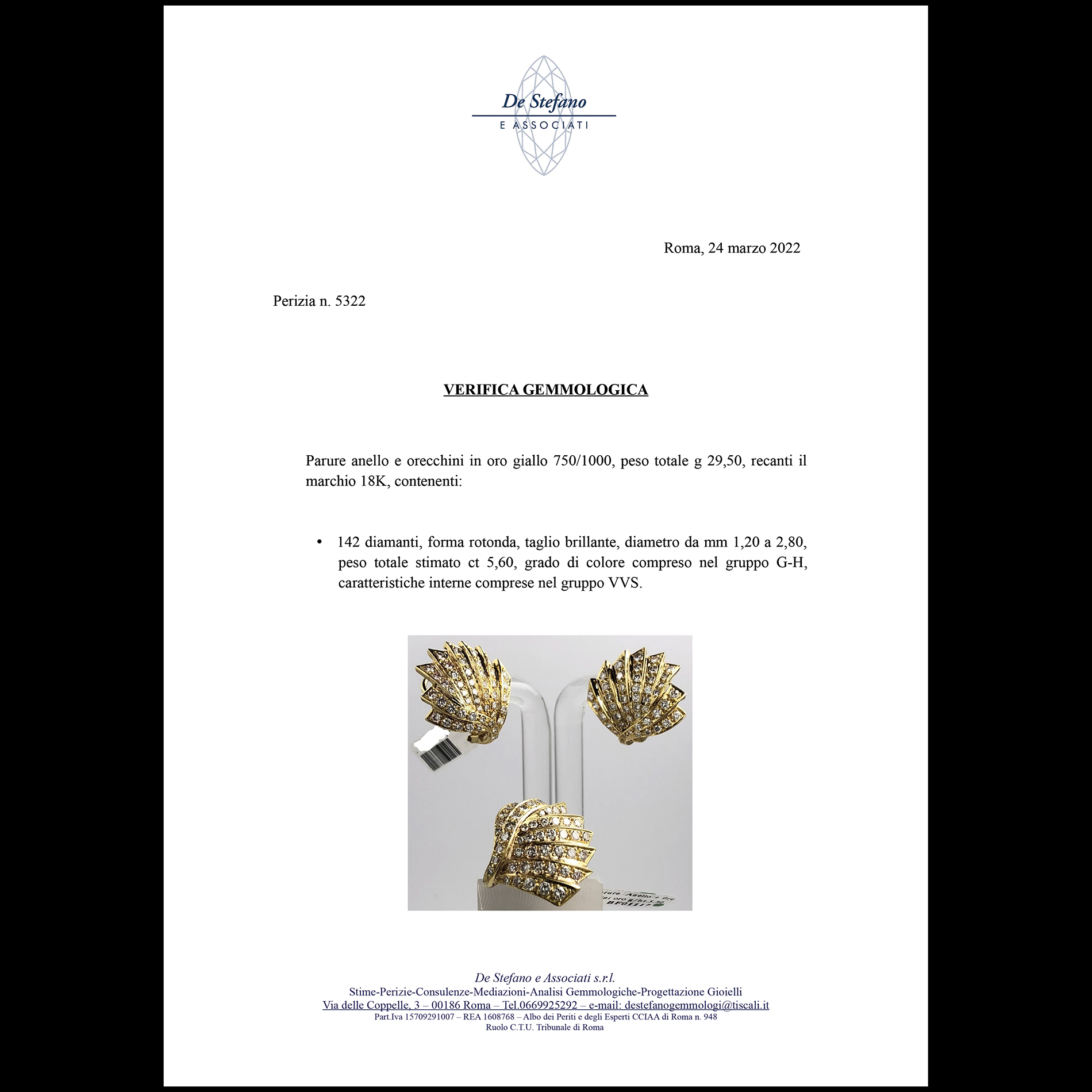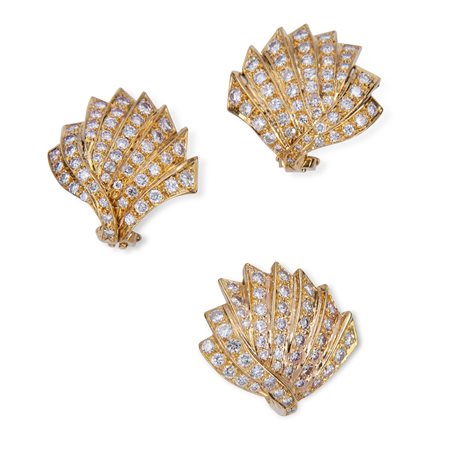 Parure anello e orecchini in oro giallo e diamanti Parure decorata da 142 diamanti rotondi taglio brillante, del peso totale stimato 5,60 ct. Peso complessivo gr. 29,50, presente timbro oro 18 kt; misura anello 16