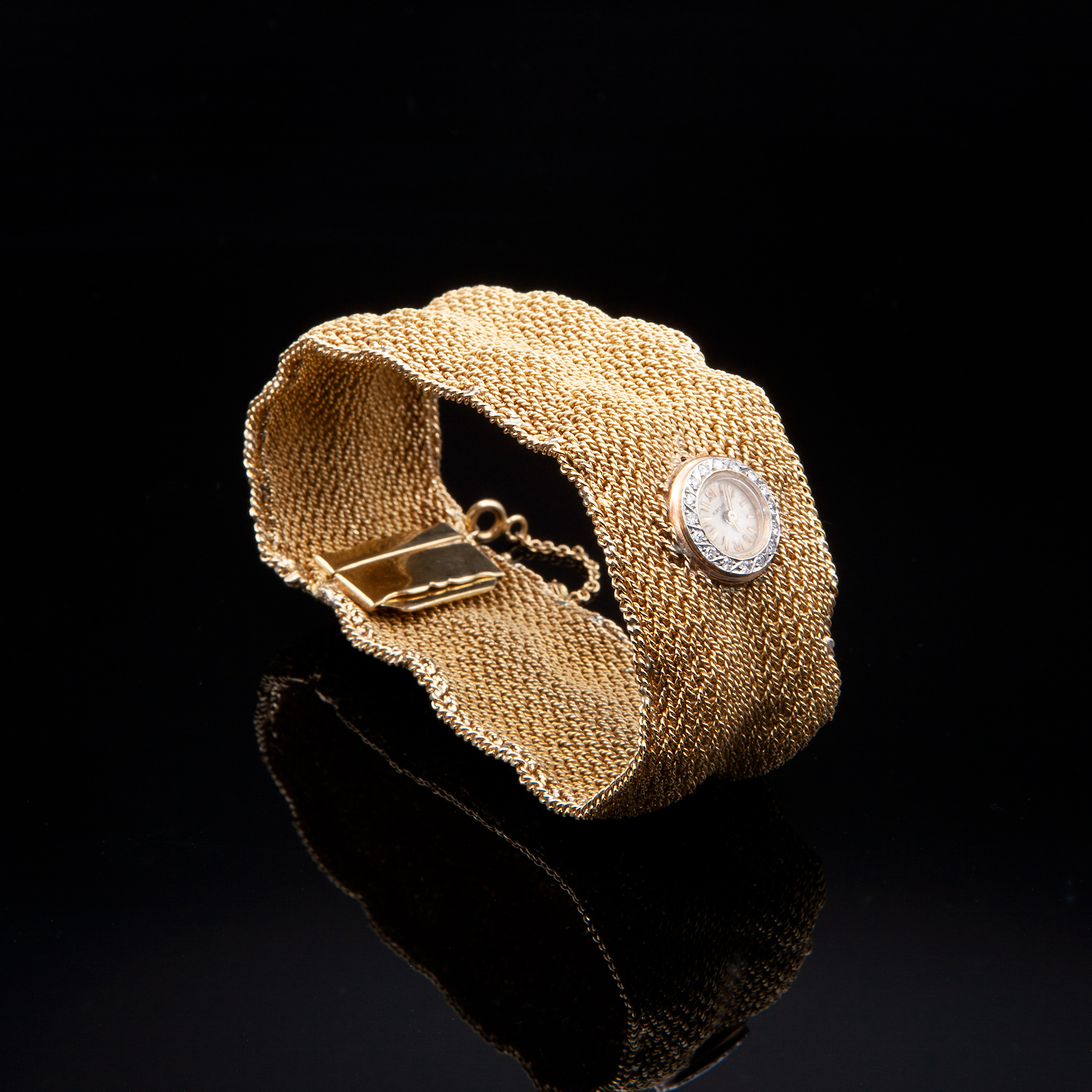 Bracciale in oro e diamanti con orologio Blancpain Oro giallo 18 kt, 16 diamanti rotondi taglio brillante; peso complessivo gr. 73,3, presente timbro oro 18 kt