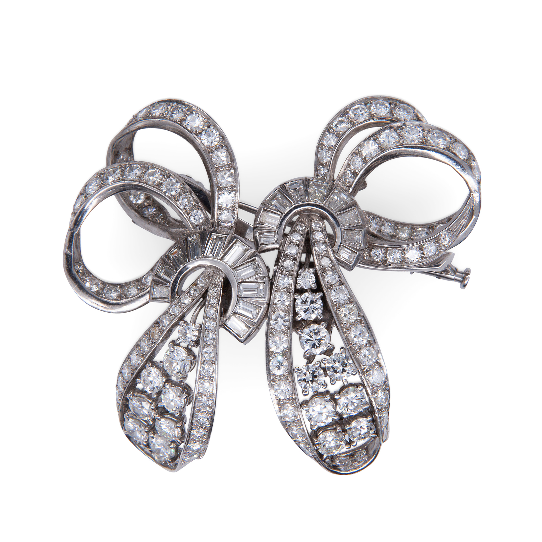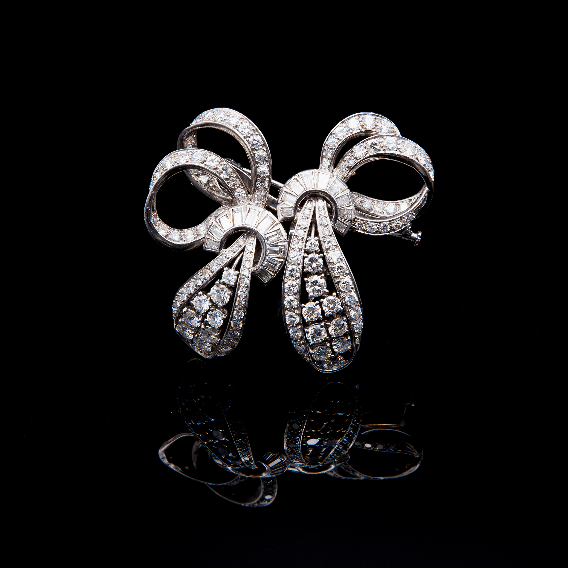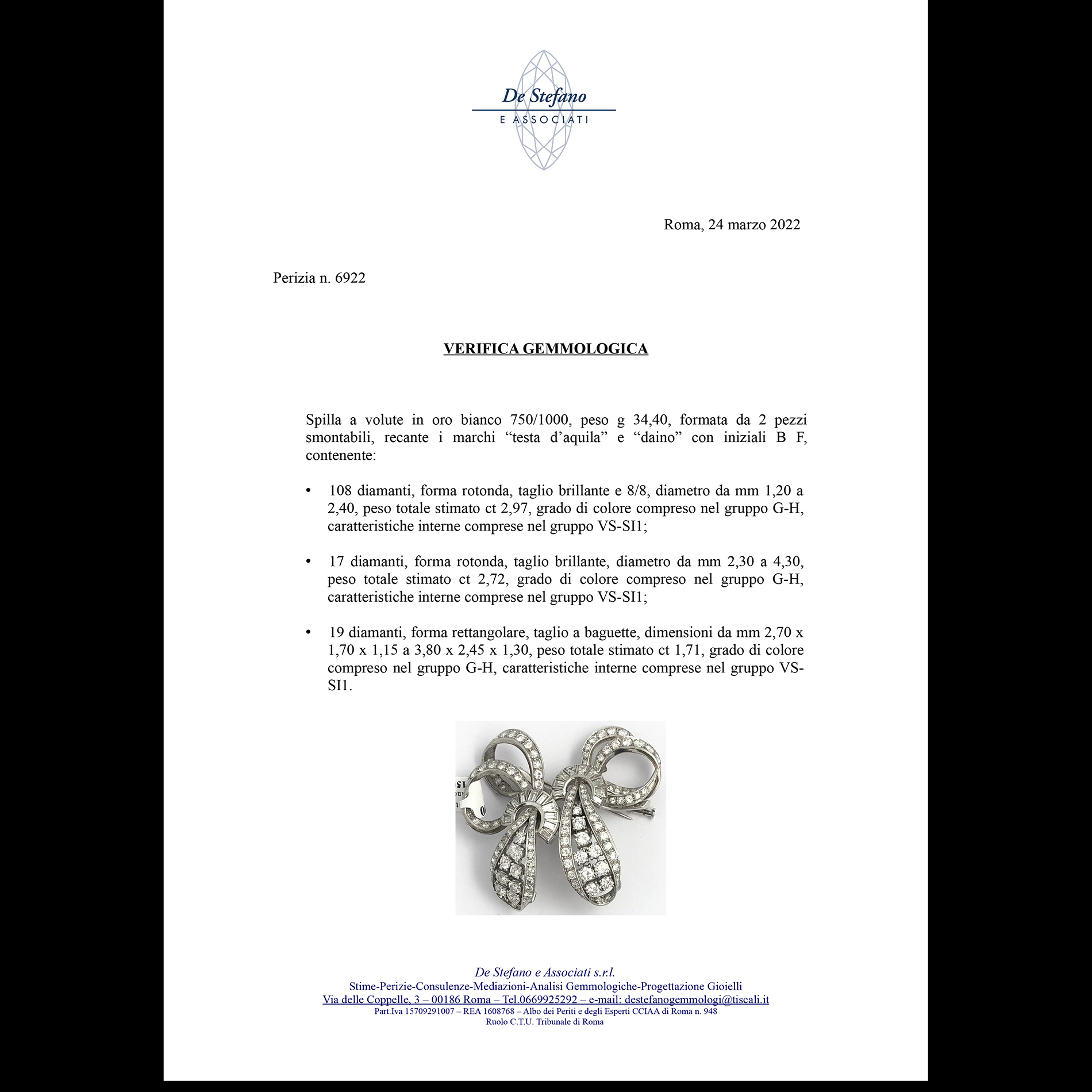 Duette a volute in oro bianco e diamanti Oro bianco 18 kt, 125 diamanti rotondi taglio brillante e 8/8, peso totale stimato 5,69 ct. 19 diamanti rettangolari taglio a baguette, peso totale stimato 1,71 ct. Peso complessivo gr. 34,40, recante i marchi “t