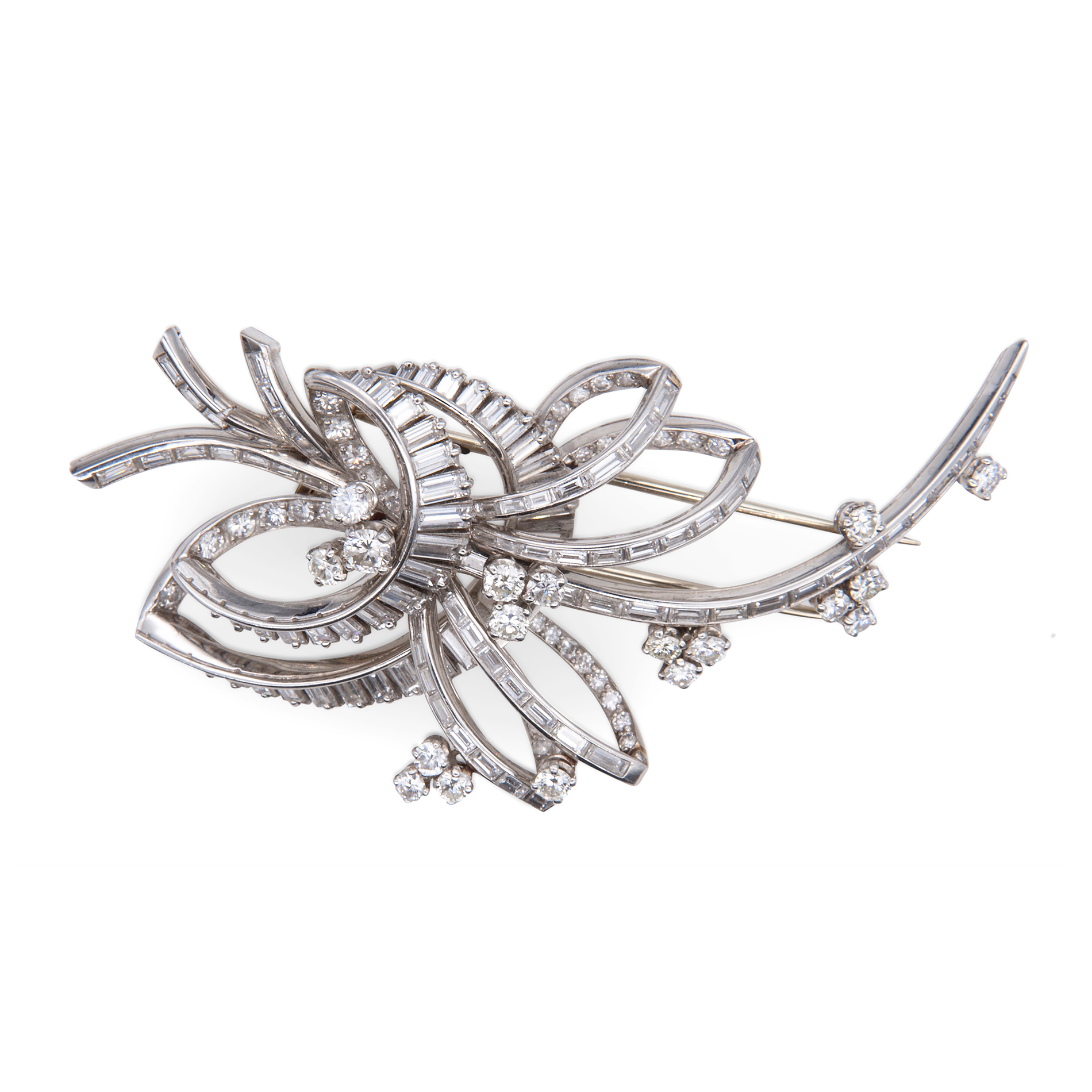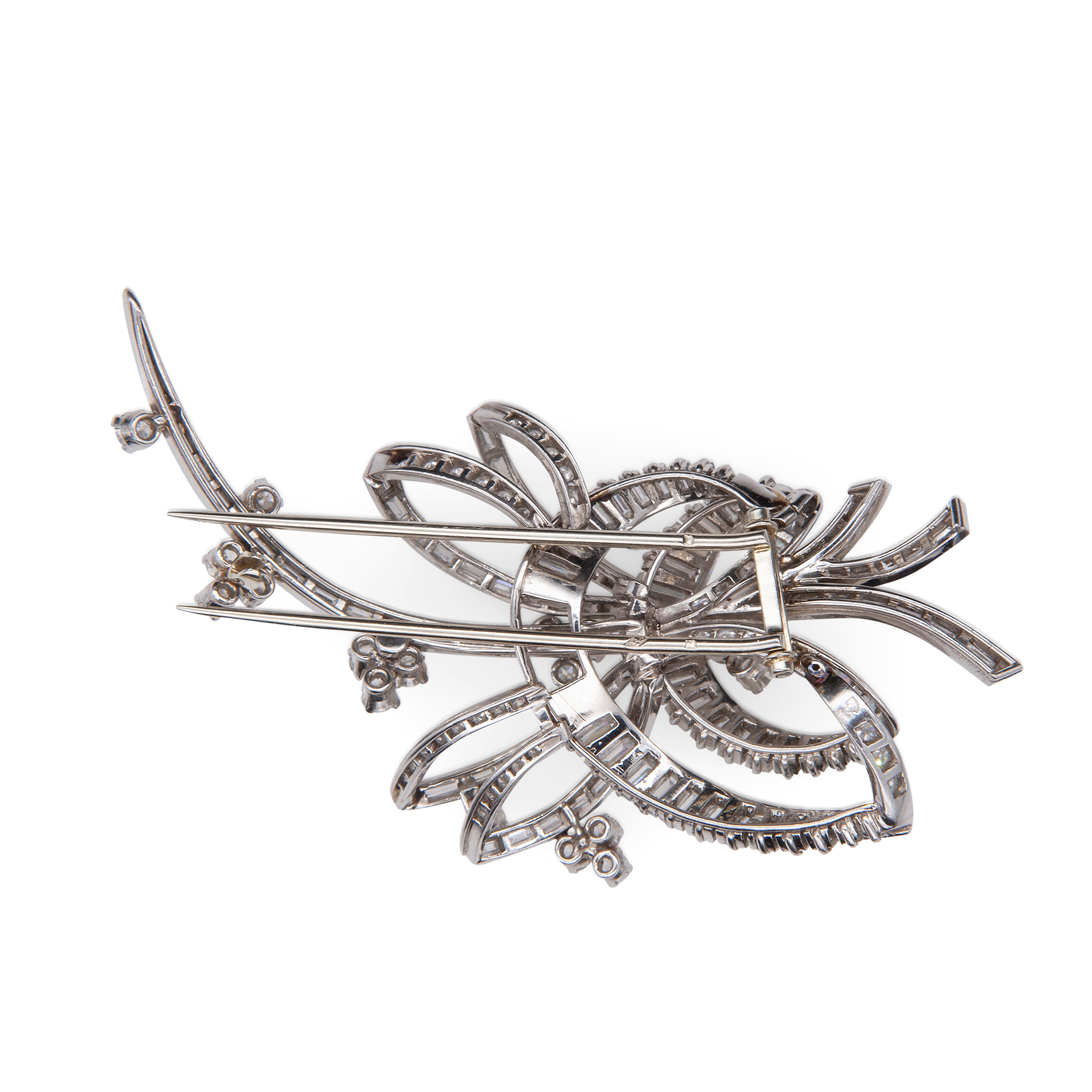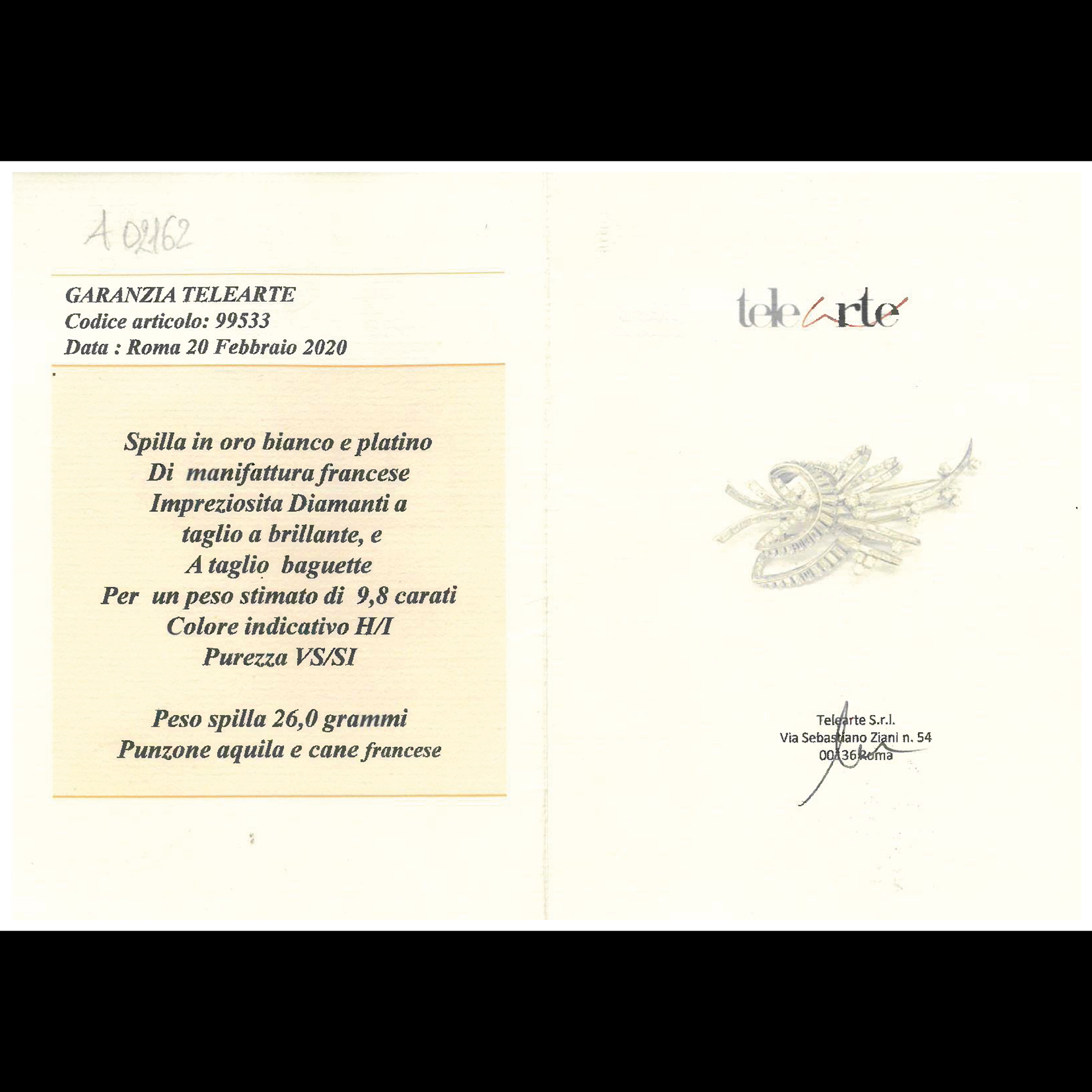 Spilla francese in oro bianco, platino e diamanti Oro bianco 18 kt, diamanti a taglio brillante e taglio baguette per un peso stimato di 9,8 ct. La spilla reca due punzoni in forma di cane francese e di aquila; il peso complessivo è di gr. 26