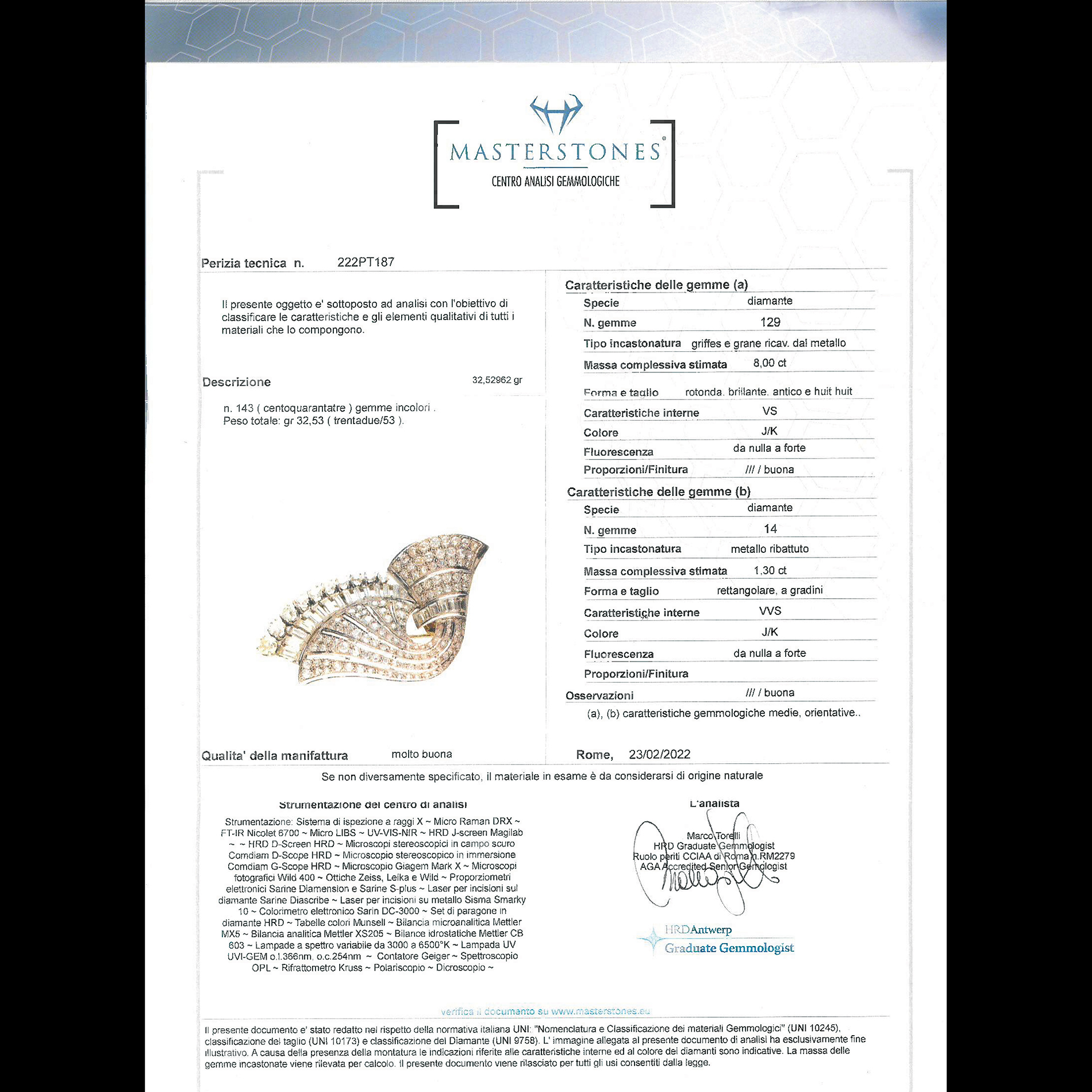 Spilla cornucopia in oro bianco e diamanti Oro bianco 18 kt, decorata da 143 diamanti di taglio composito, per un peso stimato di 9,30 ct. Peso complessivo gr. 32,53