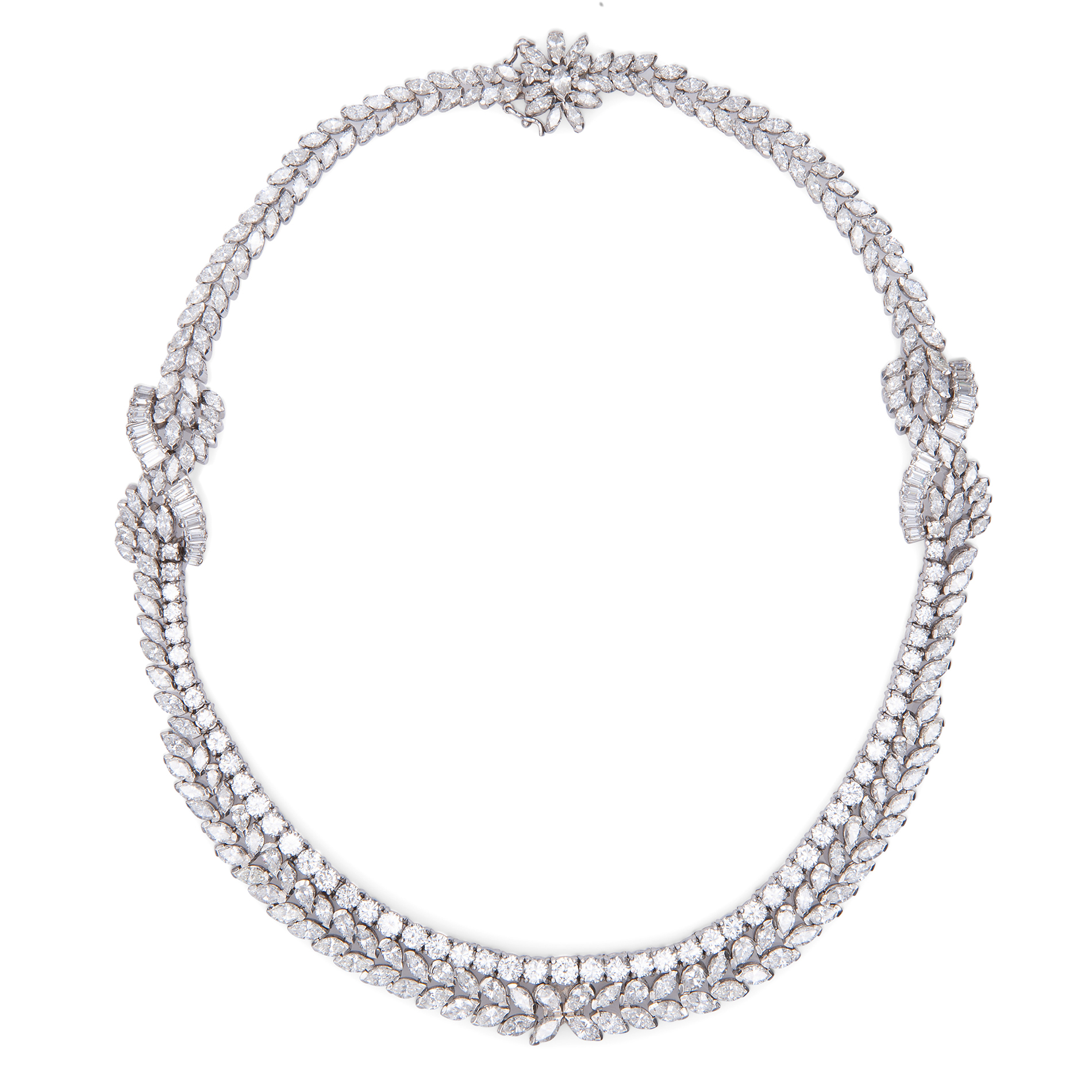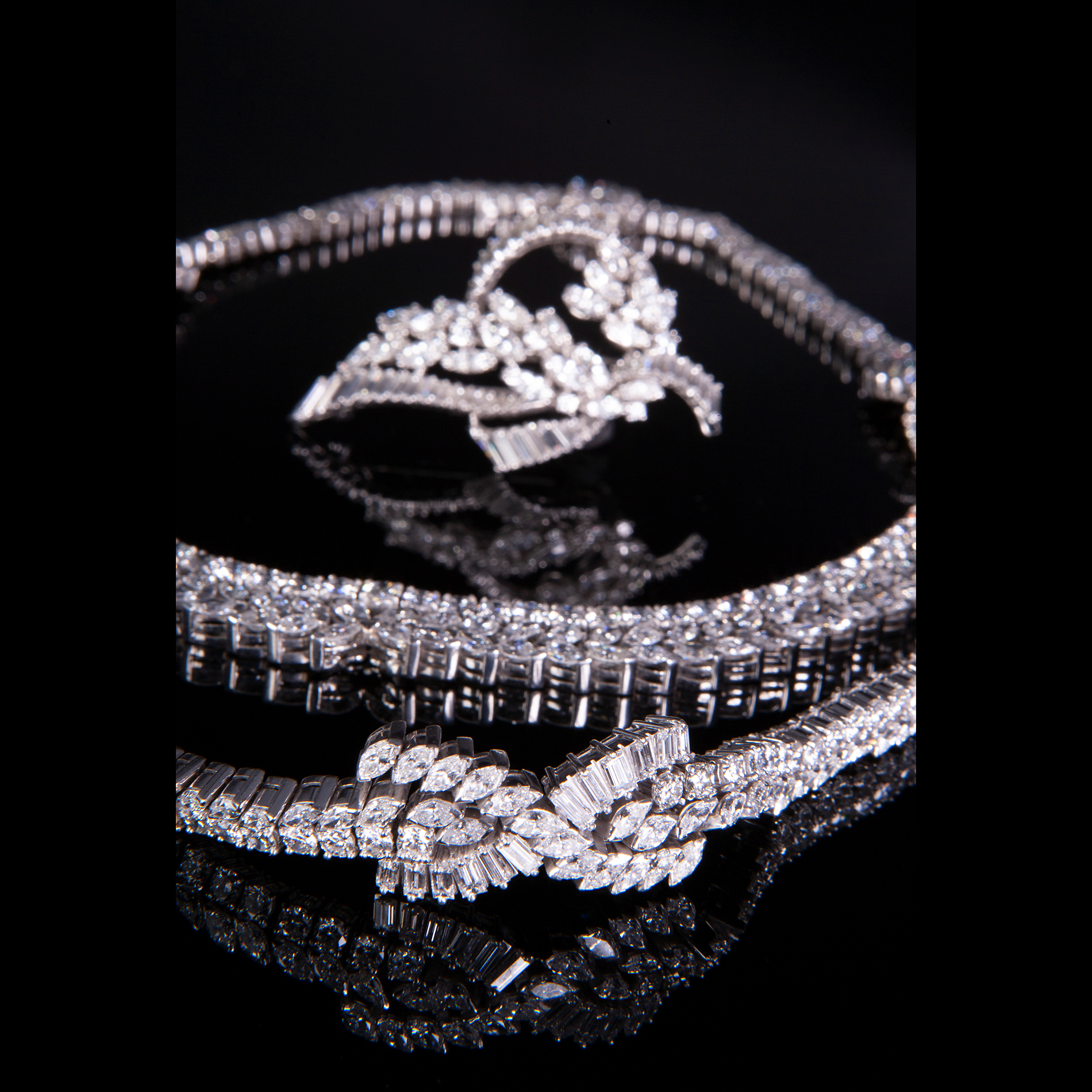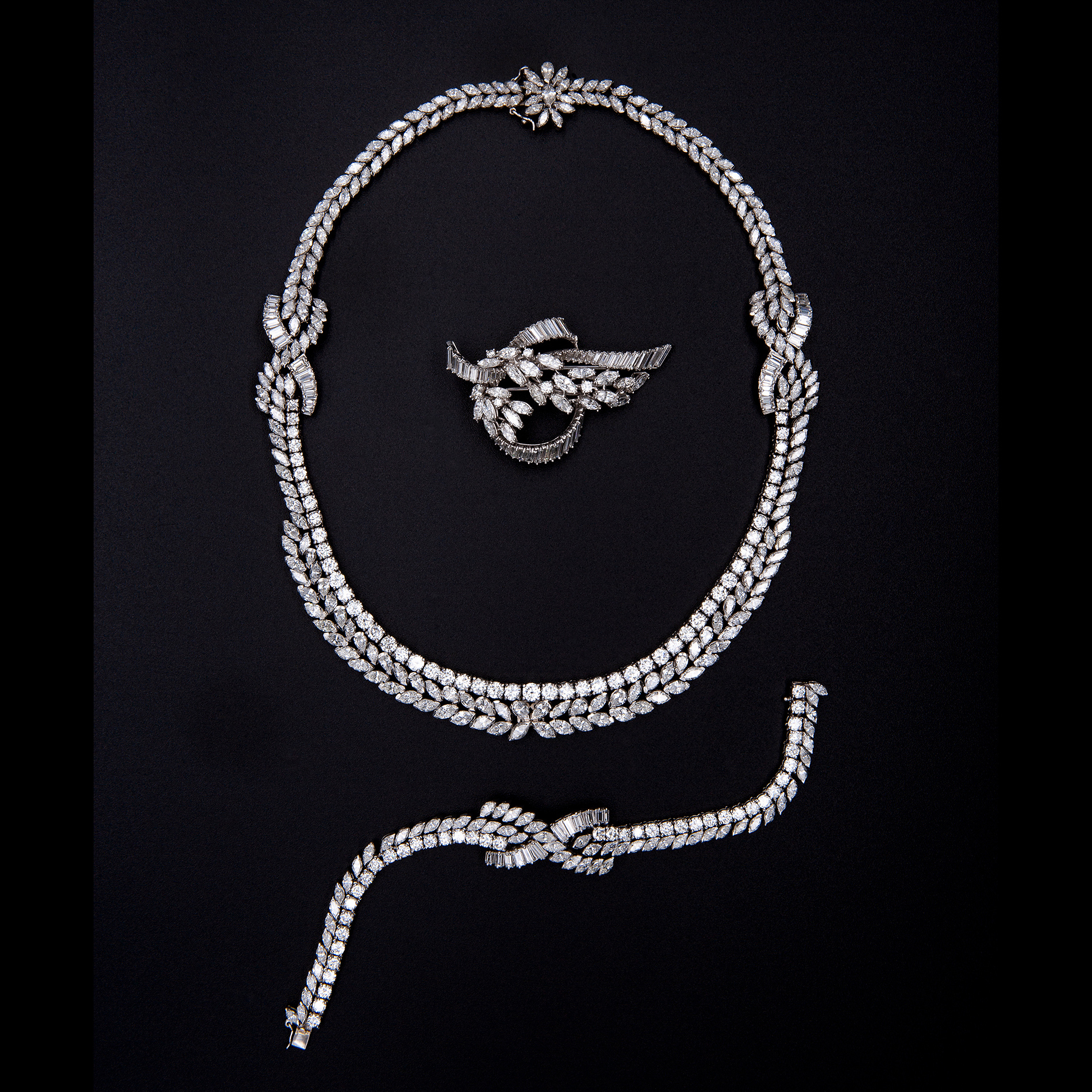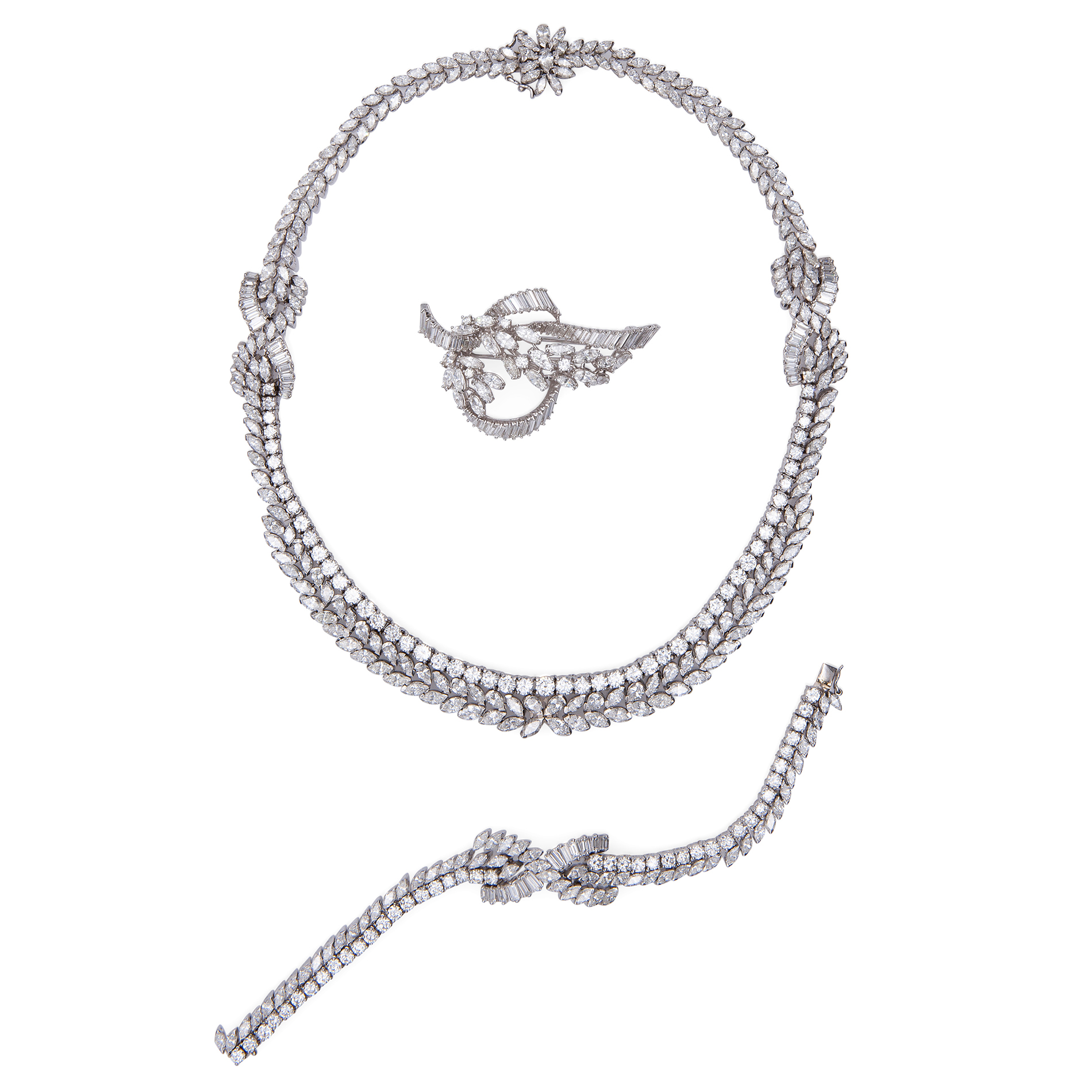 Importante parure in oro bianco e diamanti Composta da bracciale: 112 diamanti di taglio brillante e a gradini, peso totale stimato circa 13,5 ct. Girocollo: 301 diamanti di taglio brillante e a gradini peso totale stimato circa 43 ct. Spilla: 86 diama
