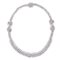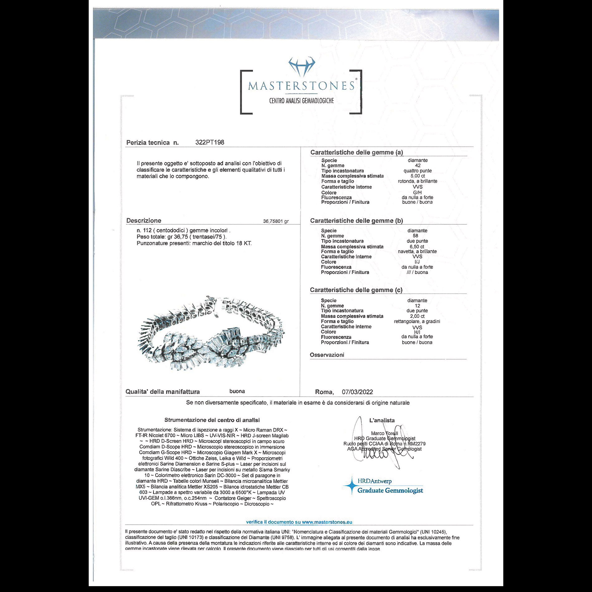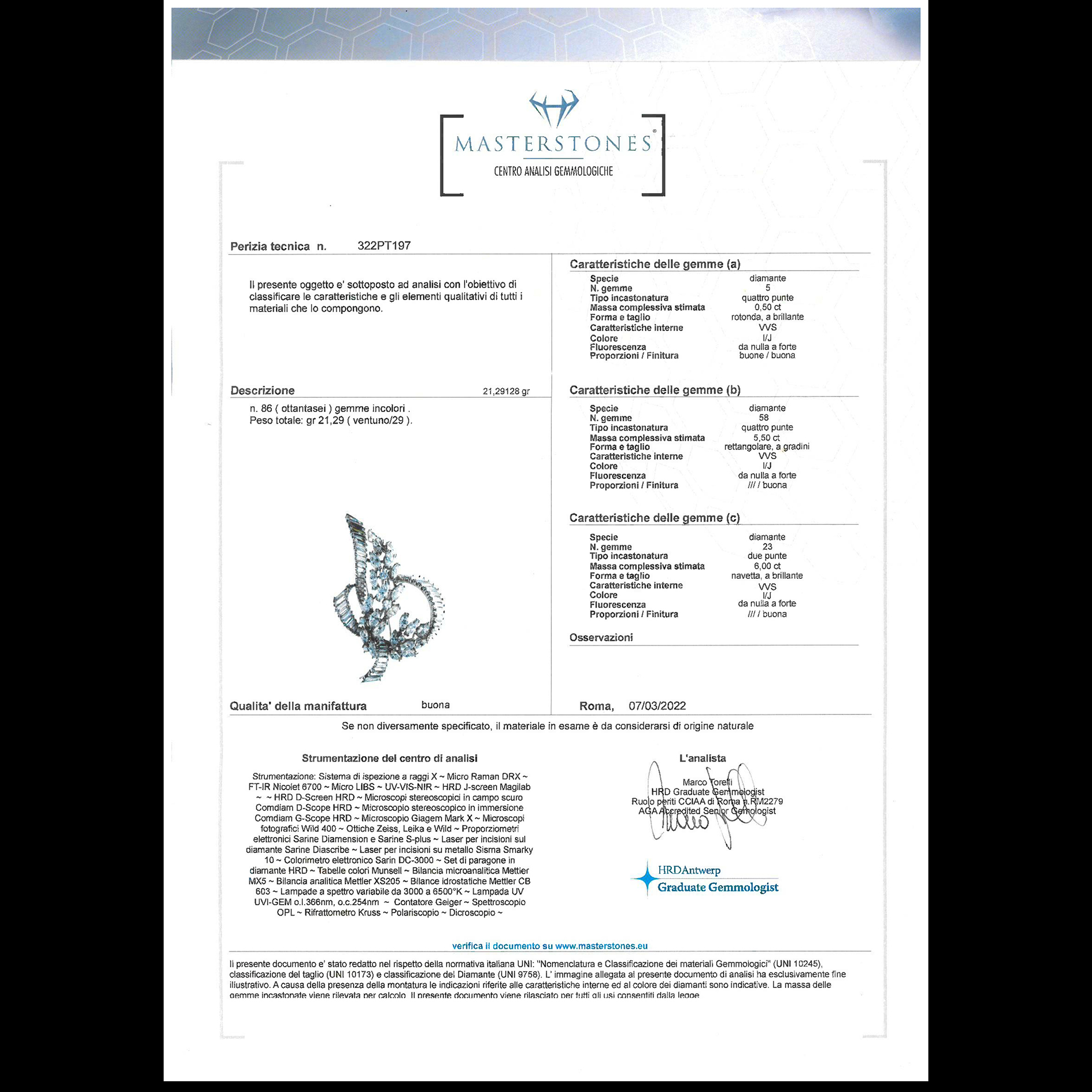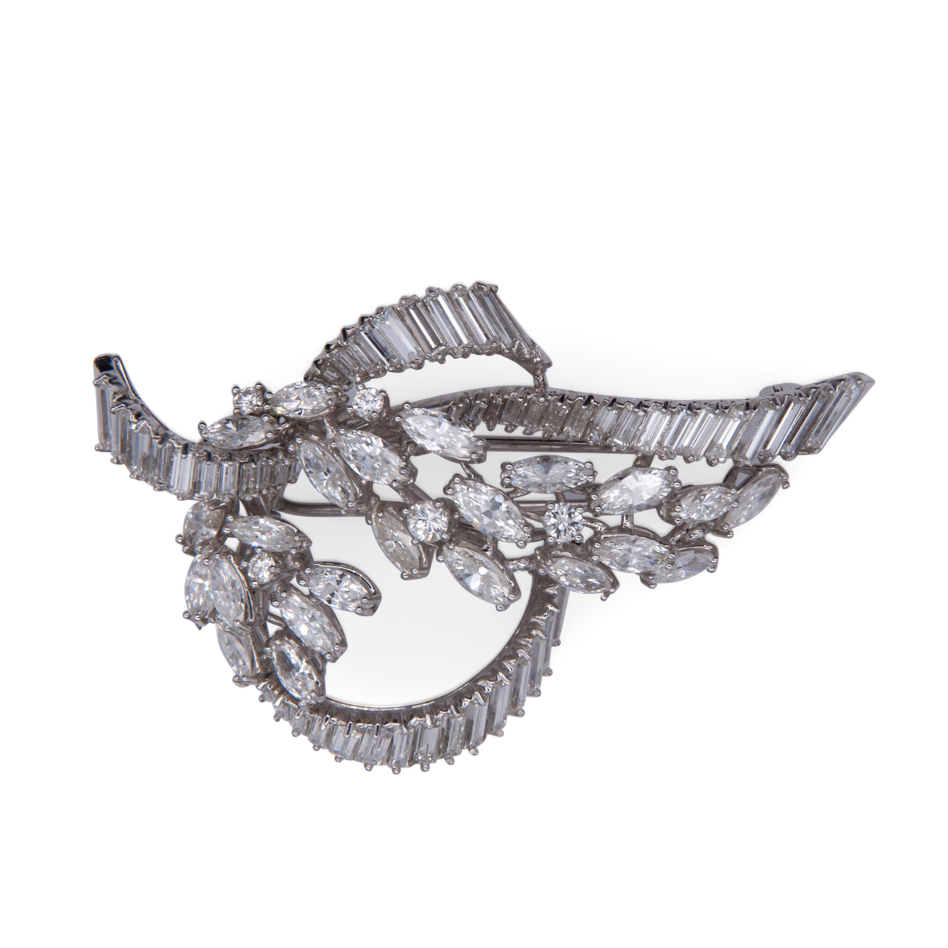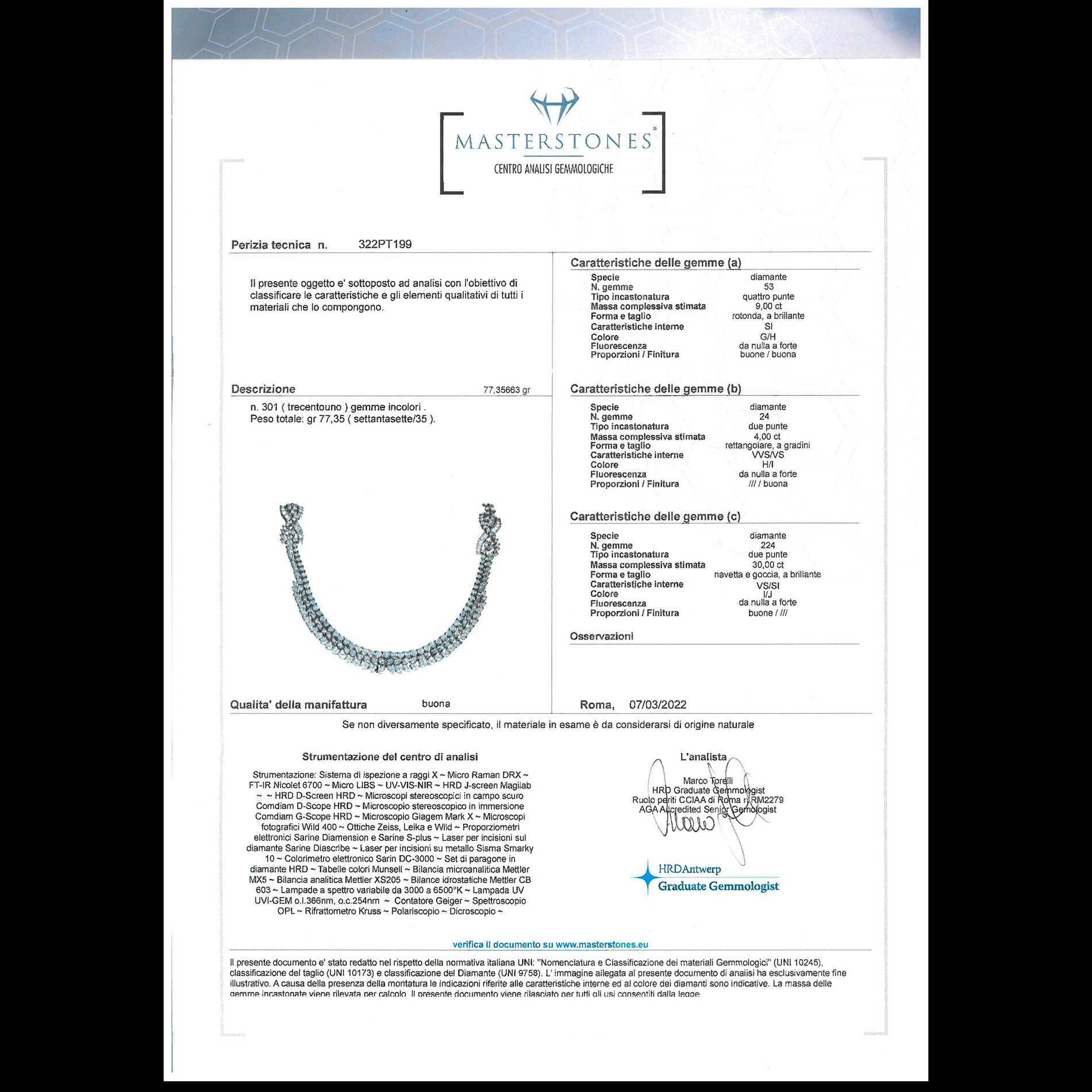 Importante parure in oro bianco e diamanti Composta da bracciale: 112 diamanti di taglio brillante e a gradini, peso totale stimato circa 13,5 ct. Girocollo: 301 diamanti di taglio brillante e a gradini peso totale stimato circa 43 ct. Spilla: 86 diama