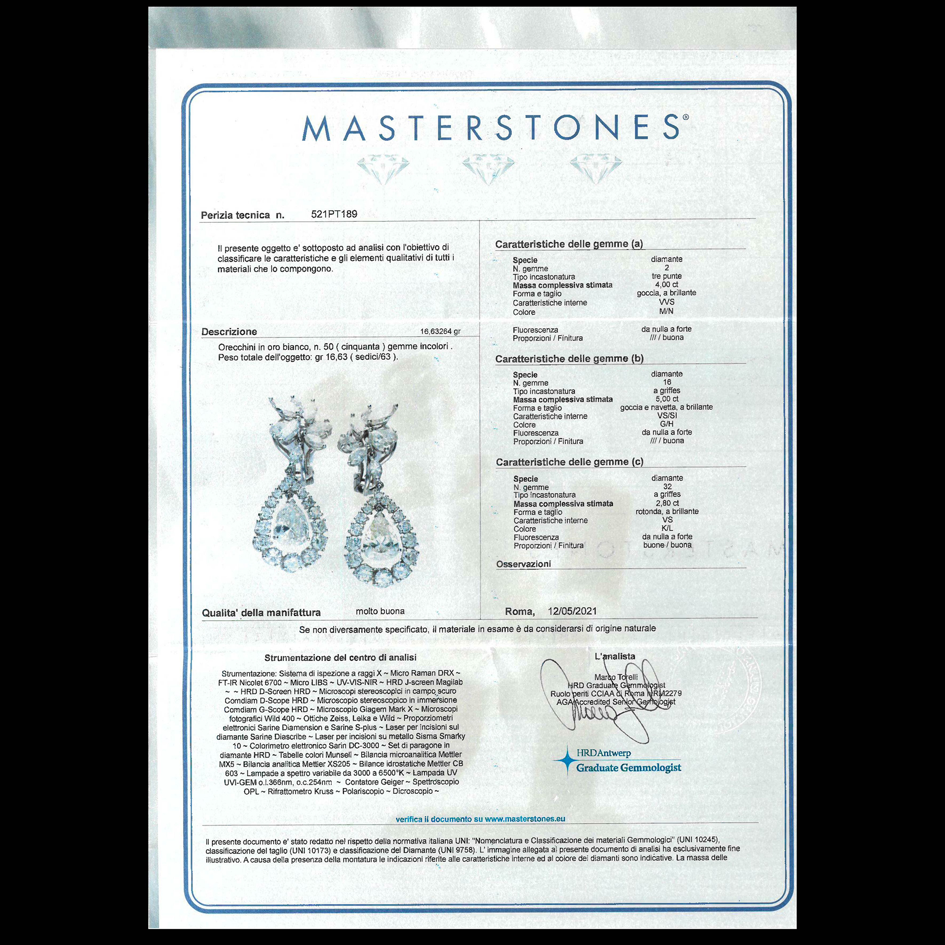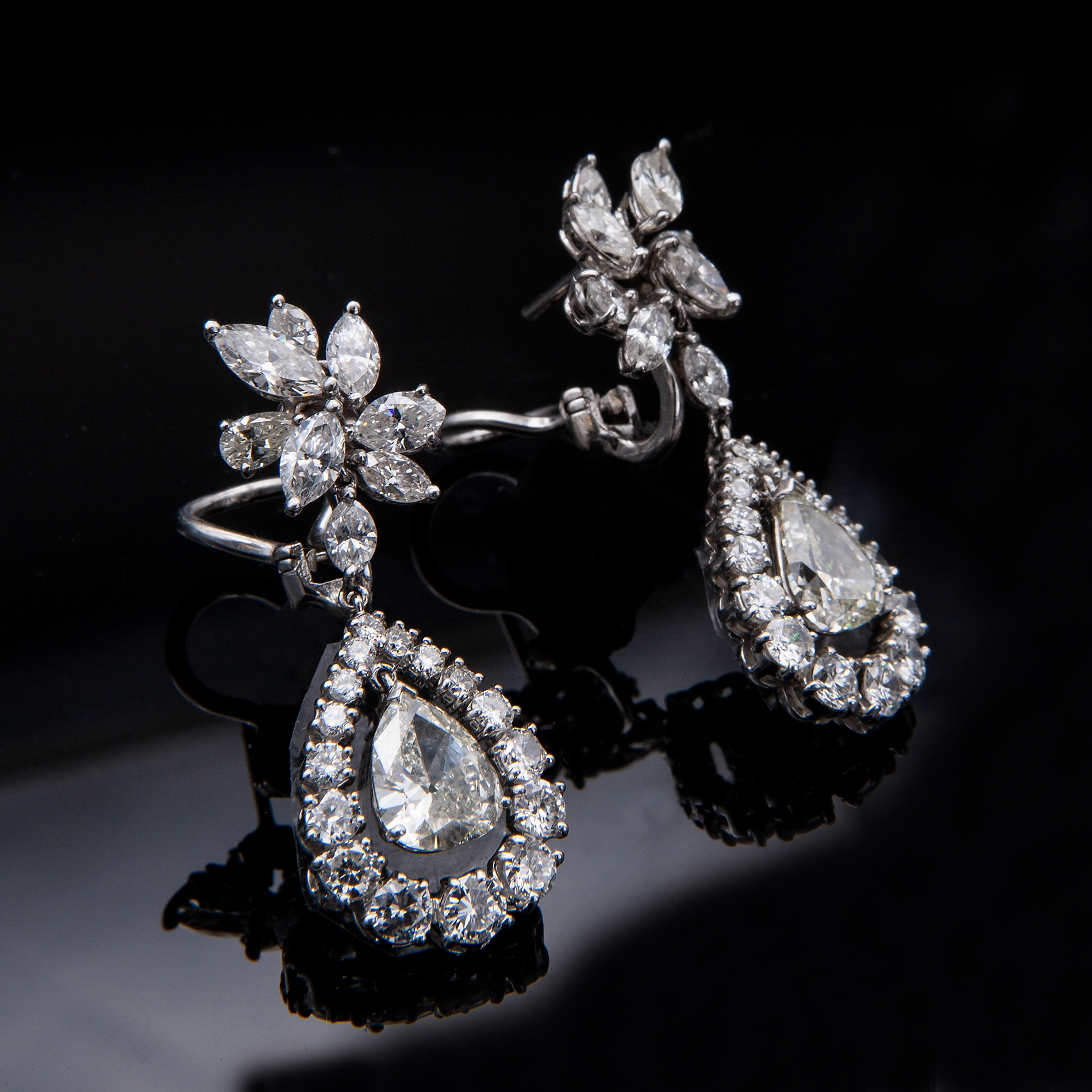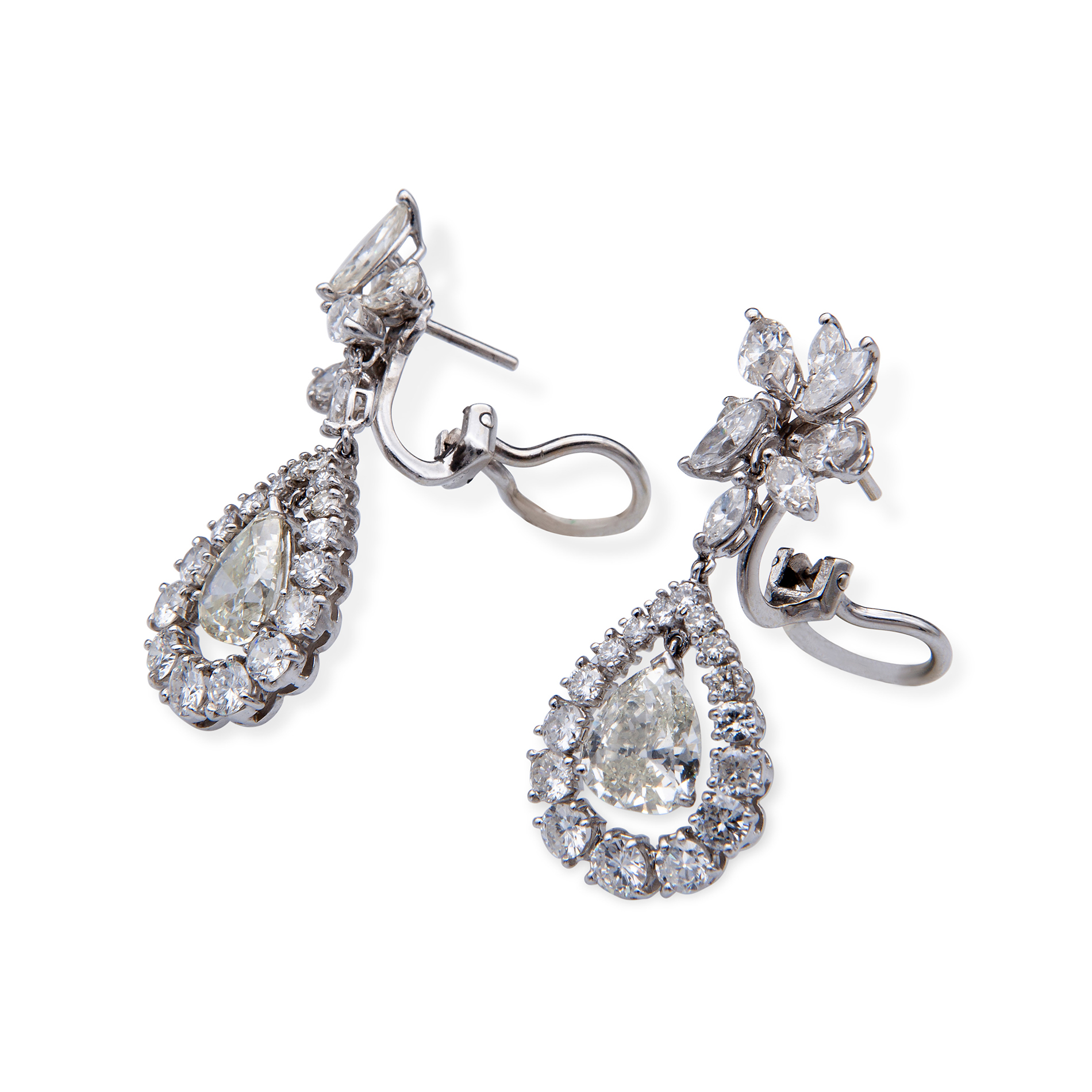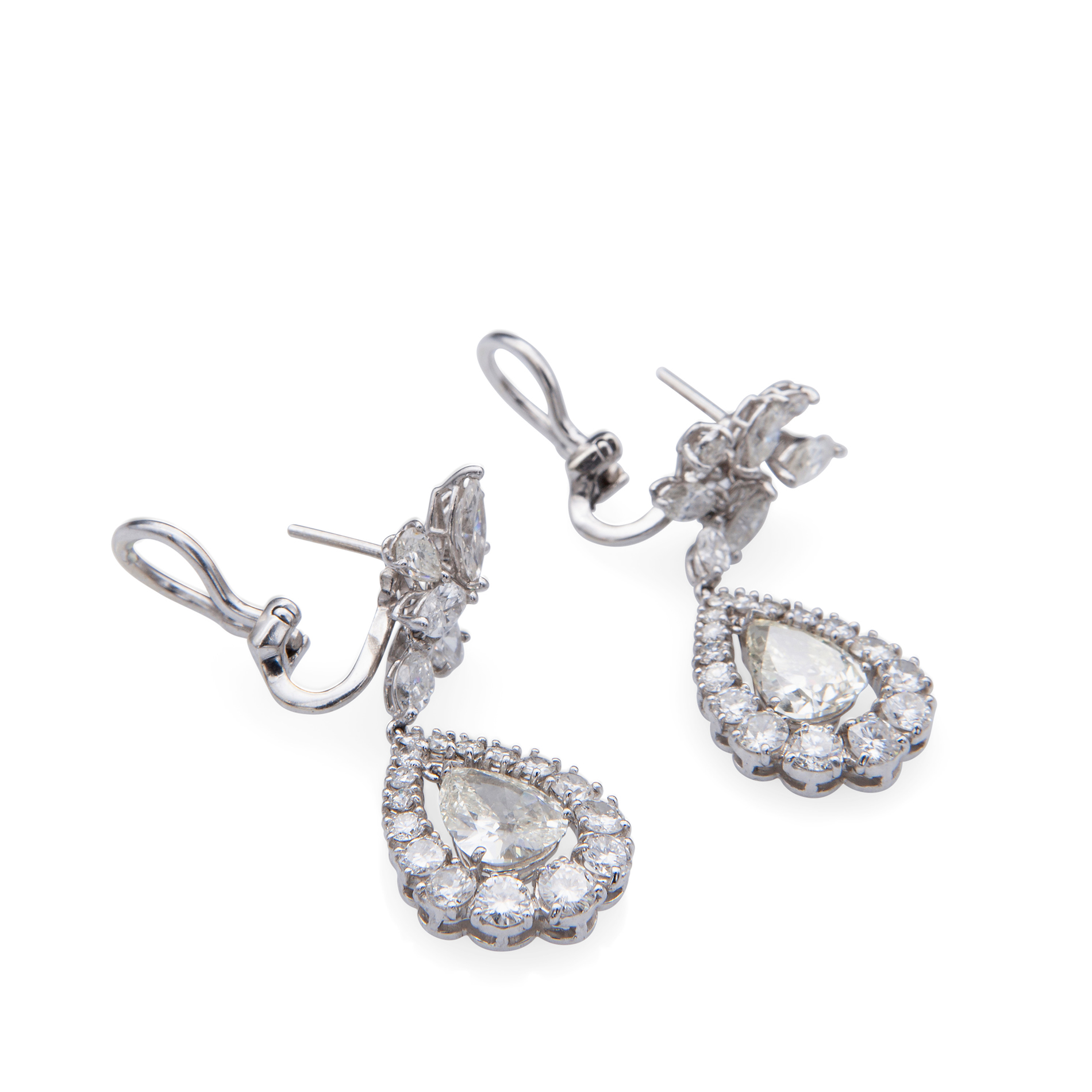 Coppia di orecchini in oro bianco e diamanti Oro bianco 18 kt, 50 diamanti taglio brillante, peso totale di circa 11,80 ct; le gemme sono di forma tonda, a navette e a goccia, per un peso complessivo di gr. 16,63