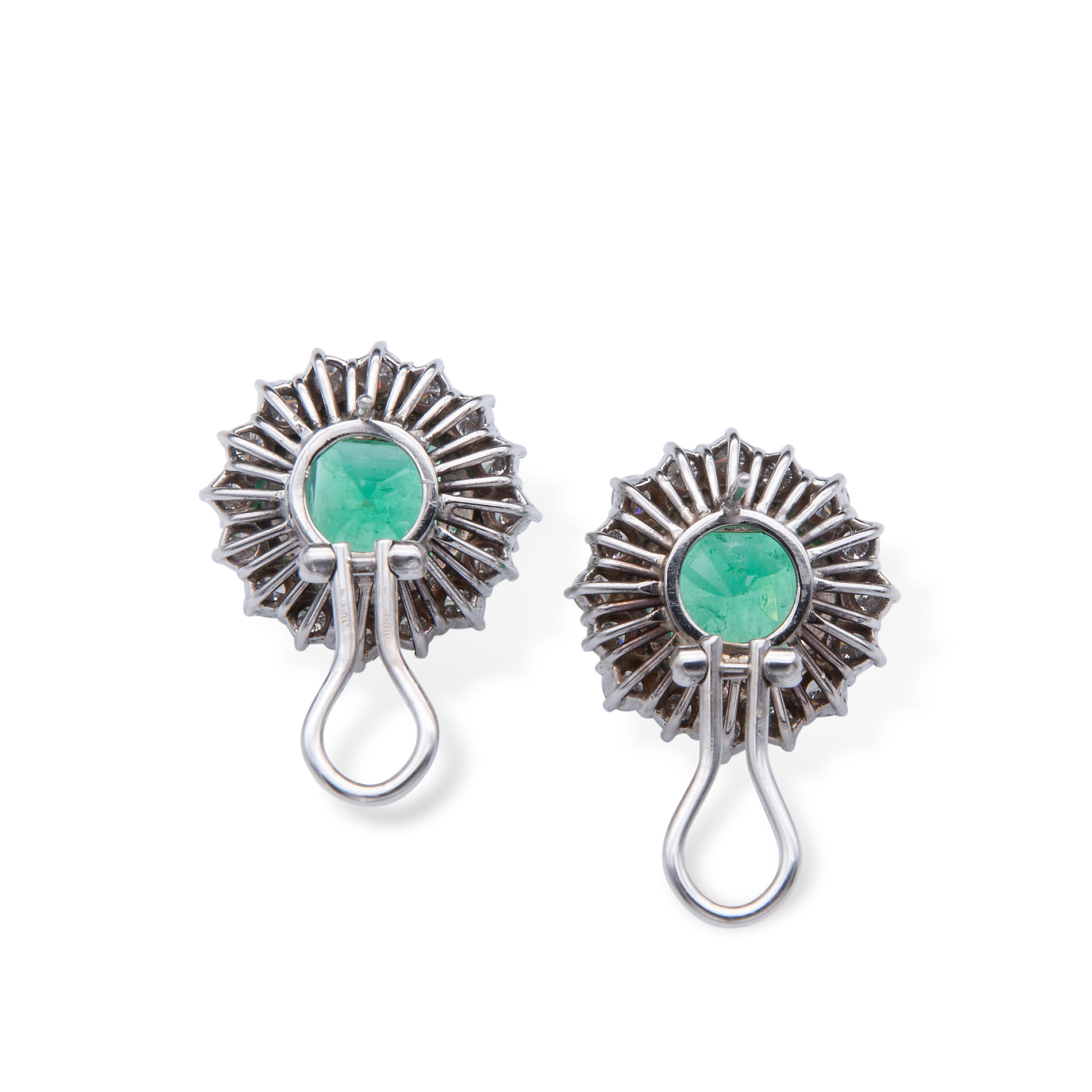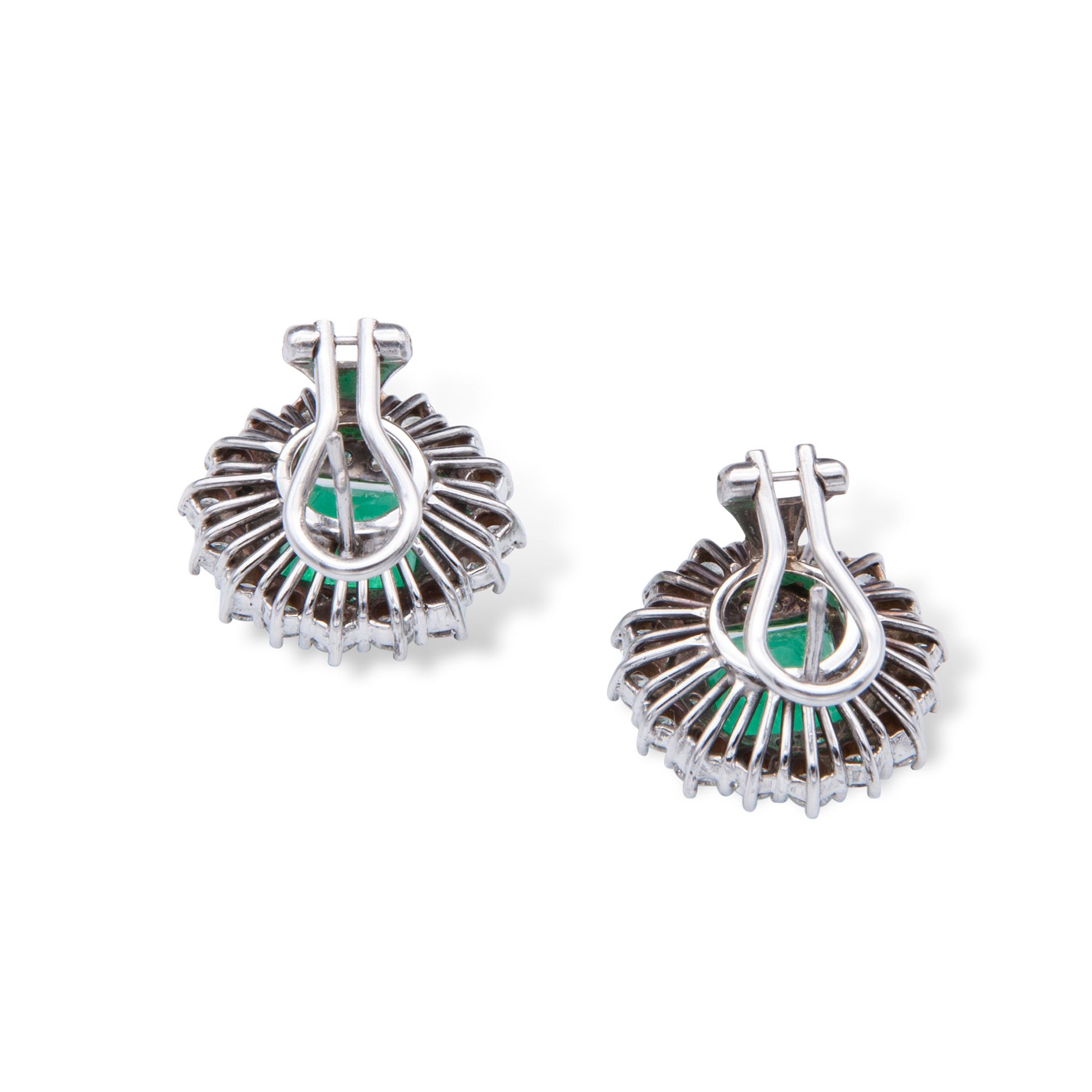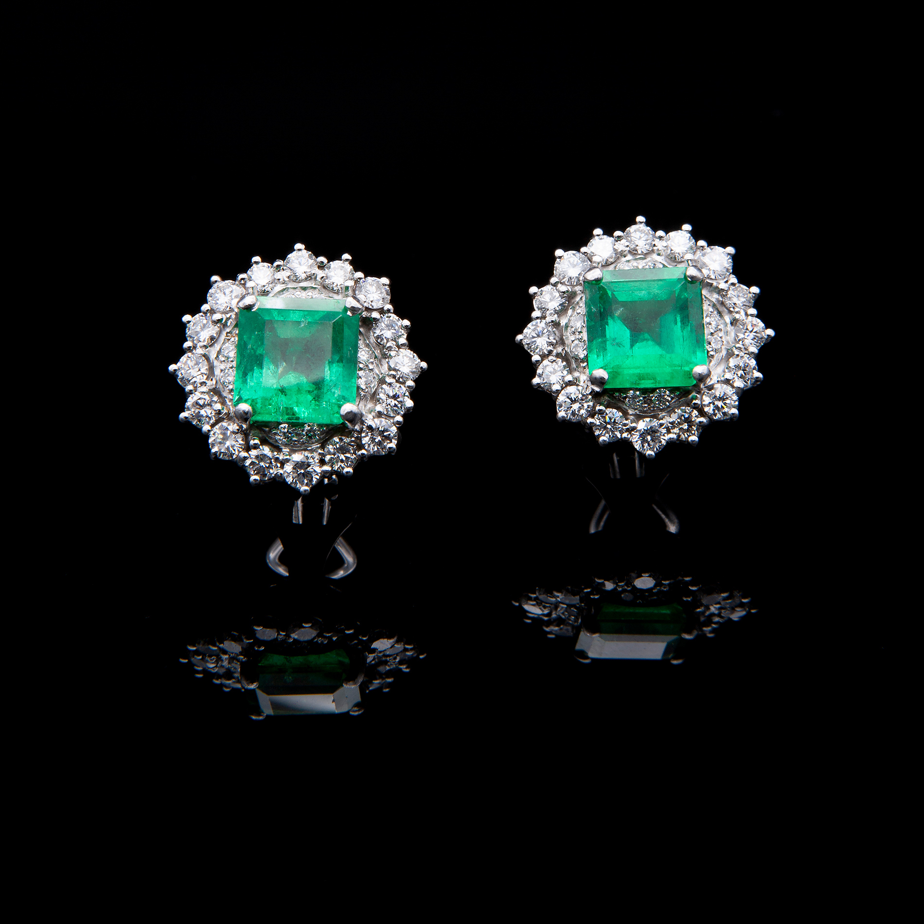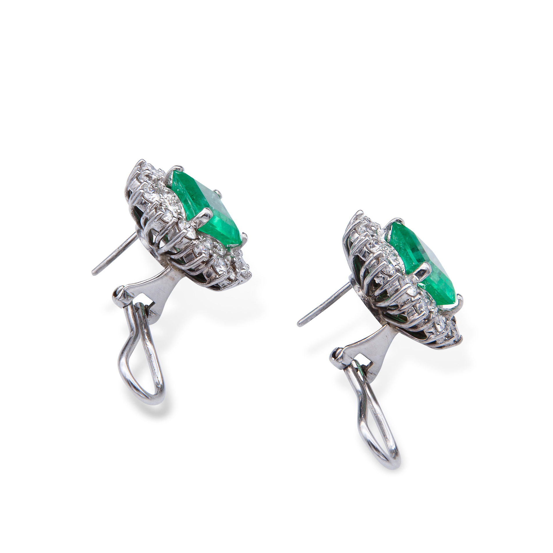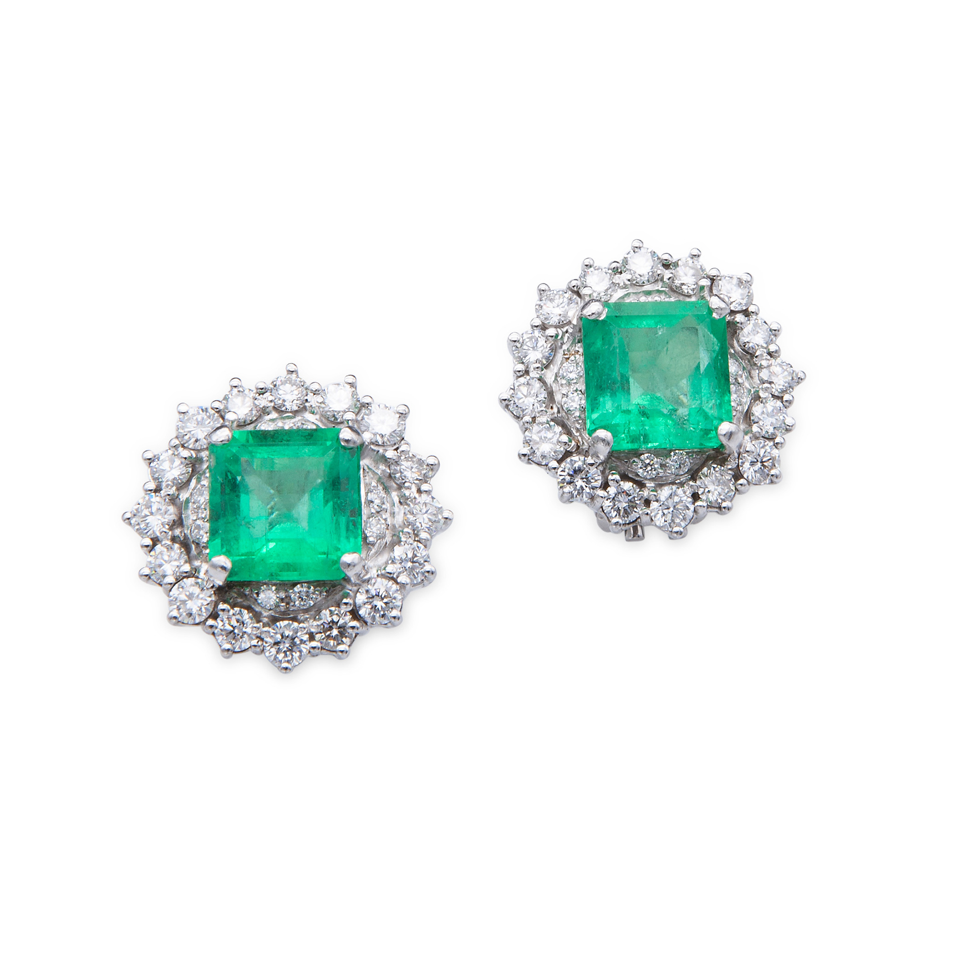 Orecchini in oro bianco, diamanti e smeraldi Oro bianco 18 kt, due smeraldi quadrati ad angoli tronchi di circa 6,60 ct, contornati da 48 diamanti a griffes. Peso complessivo gr. 14,40