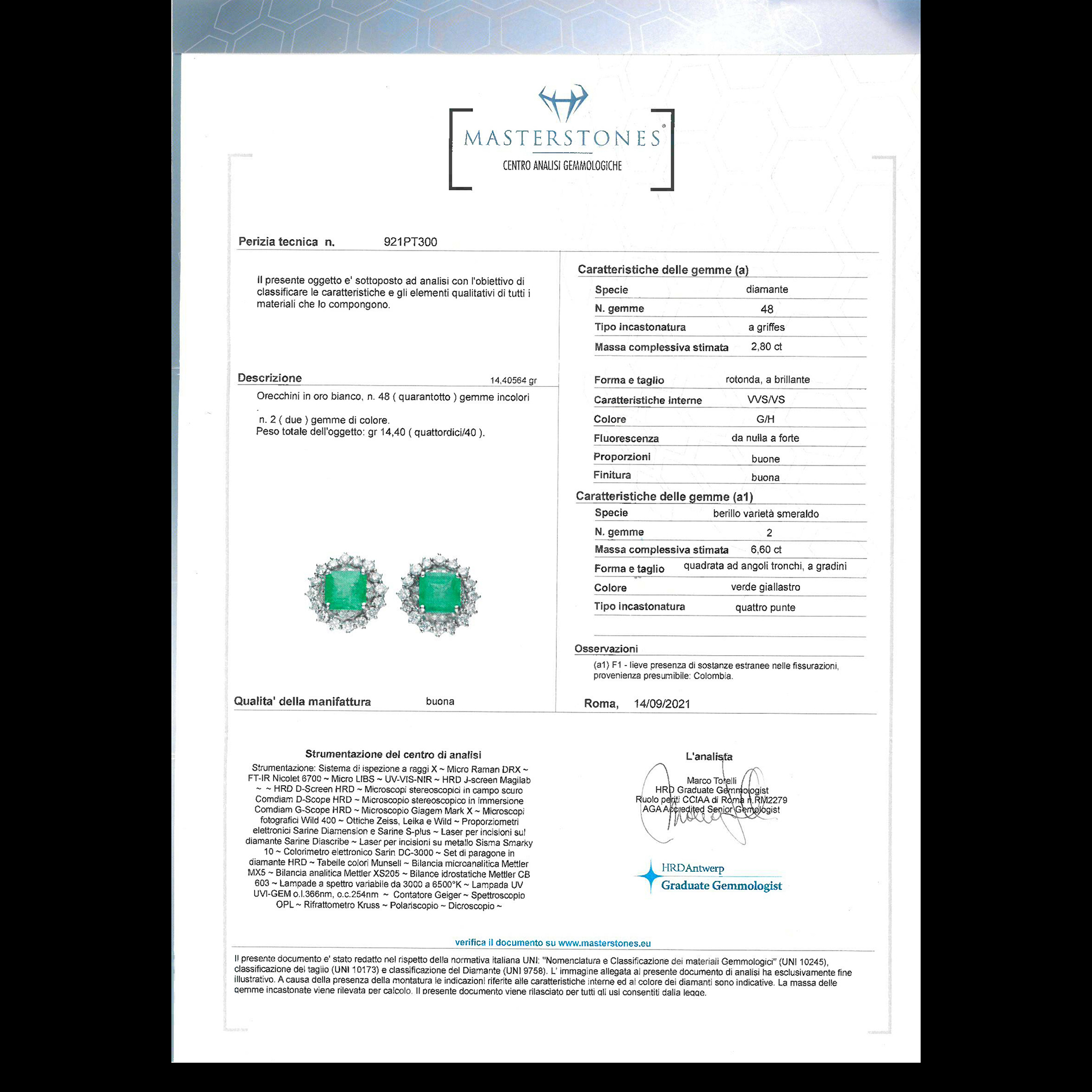 Orecchini in oro bianco, diamanti e smeraldi