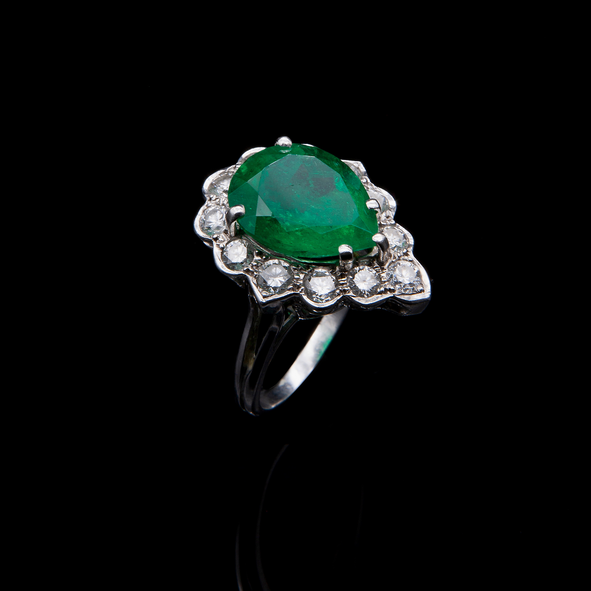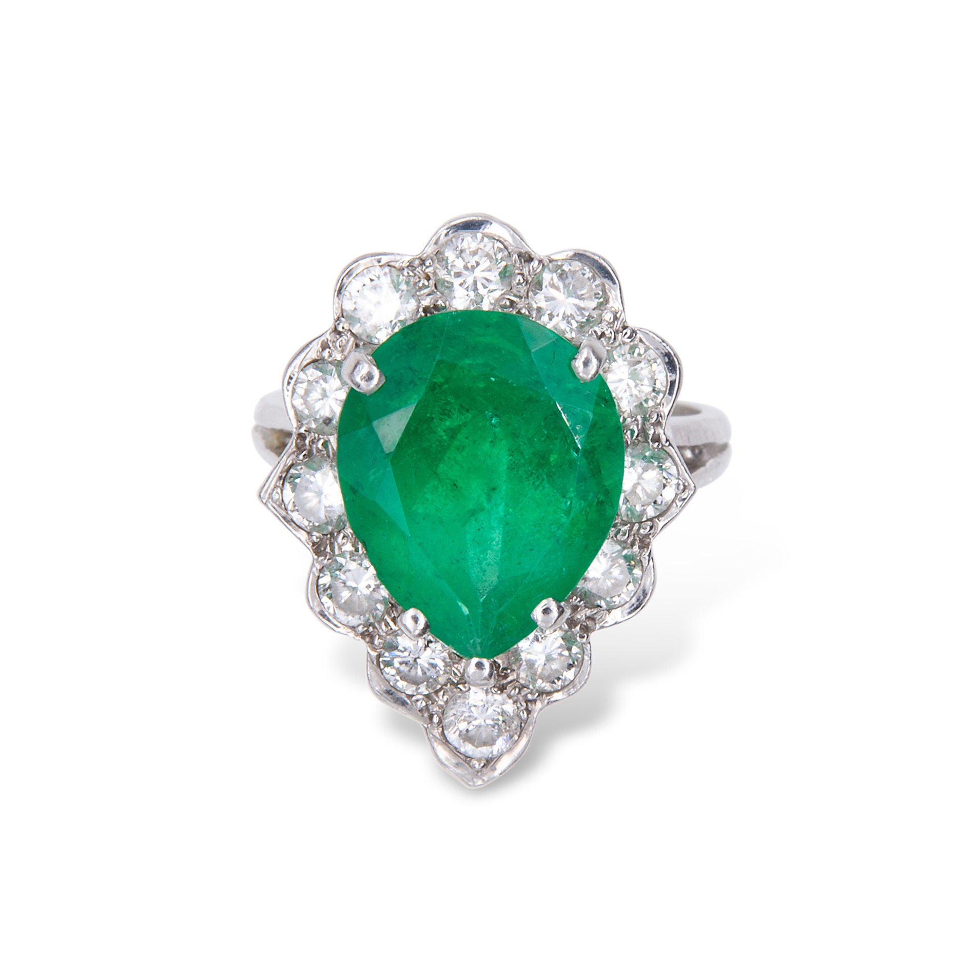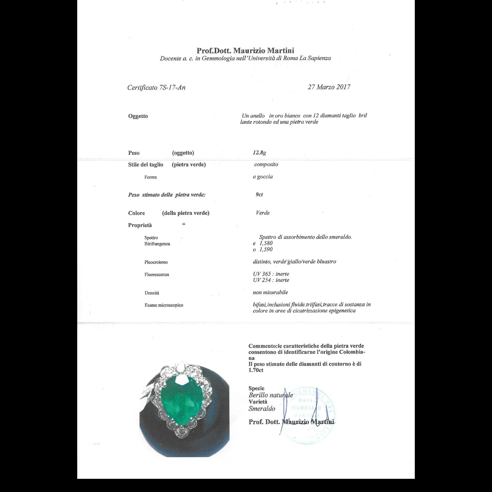 Anello in oro bianco, diamanti e grande smeraldo colombiano Oro bianco 18 kt, smeraldo centrale a forma di goccia di circa 9 ct, contornato da 12 diamanti rotondi taglio brillante, per un peso stimato di 1,70 ct. Peso complessivo gr. 12,80, misura 21