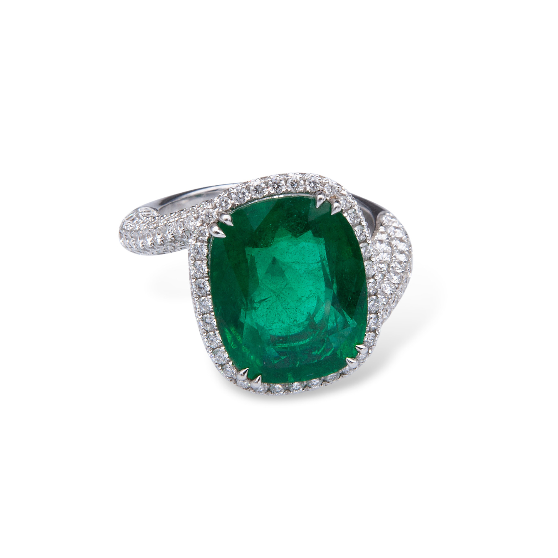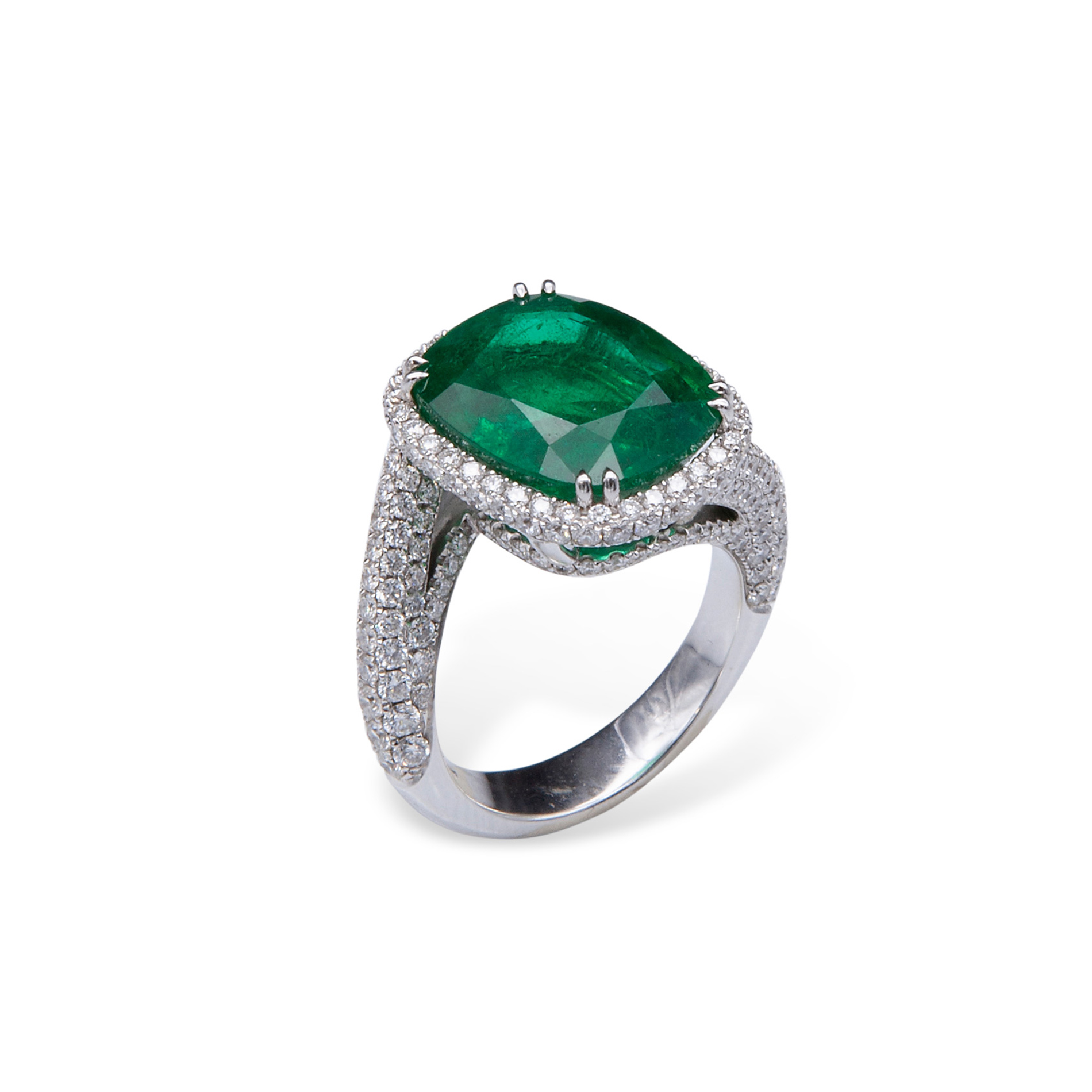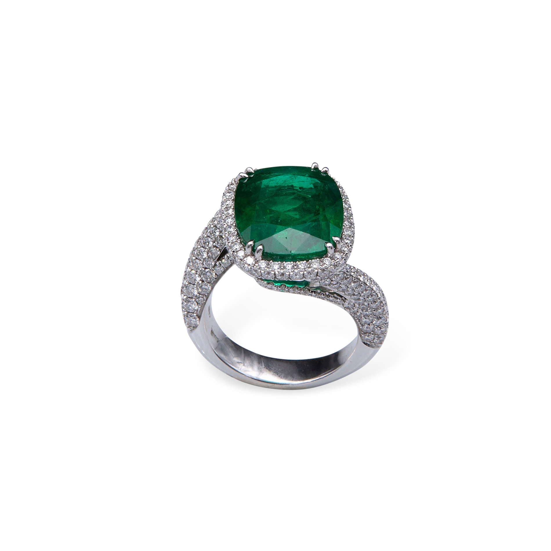 Anello in oro bianco, diamanti e smeraldo Oro bianco 18 kt, composto da brillanti per un totale di 2,50 ct circa e un grande smeraldo centrale taglio cuscino di 8,99 ct circa. Peso complessivo gr. 11,3, misura 14
