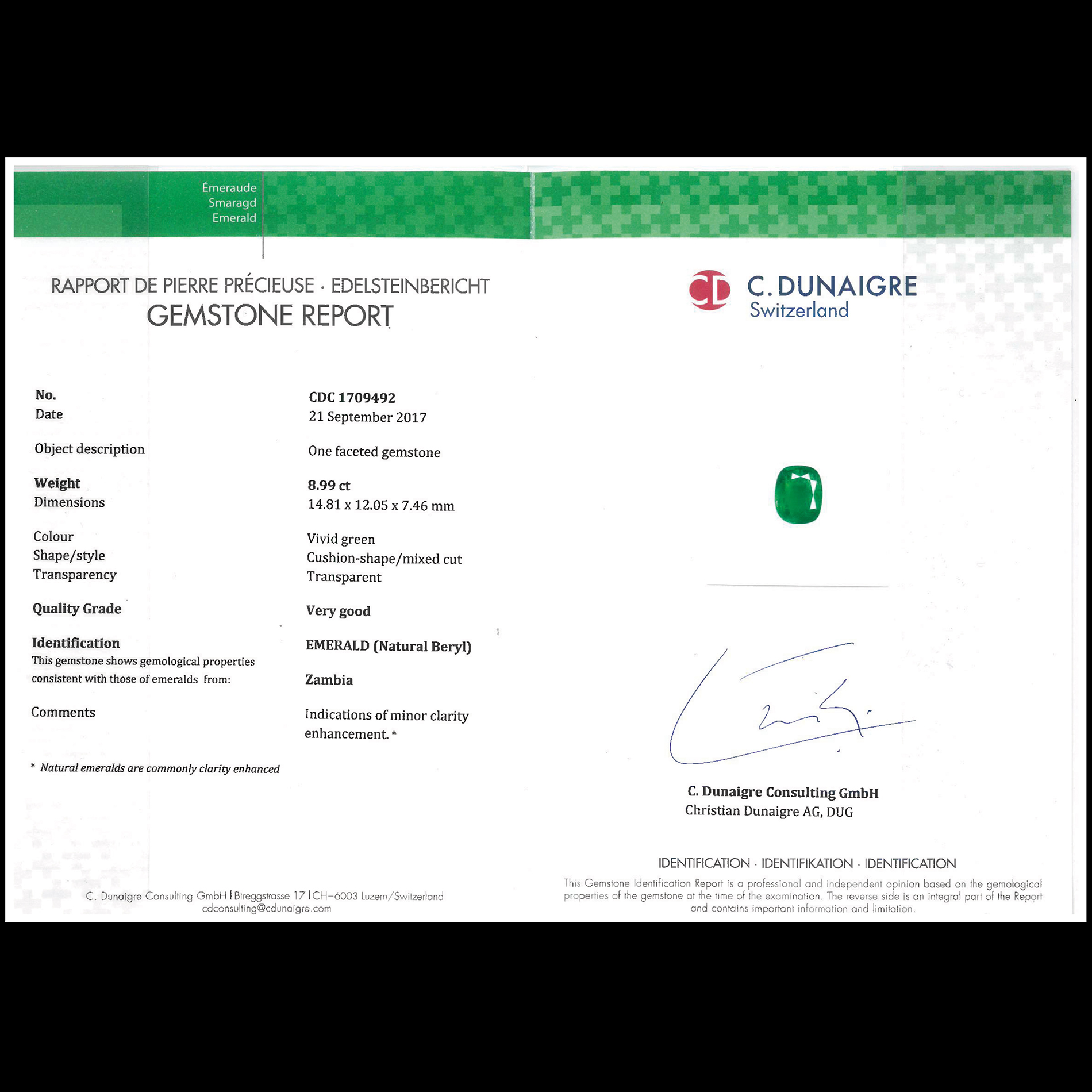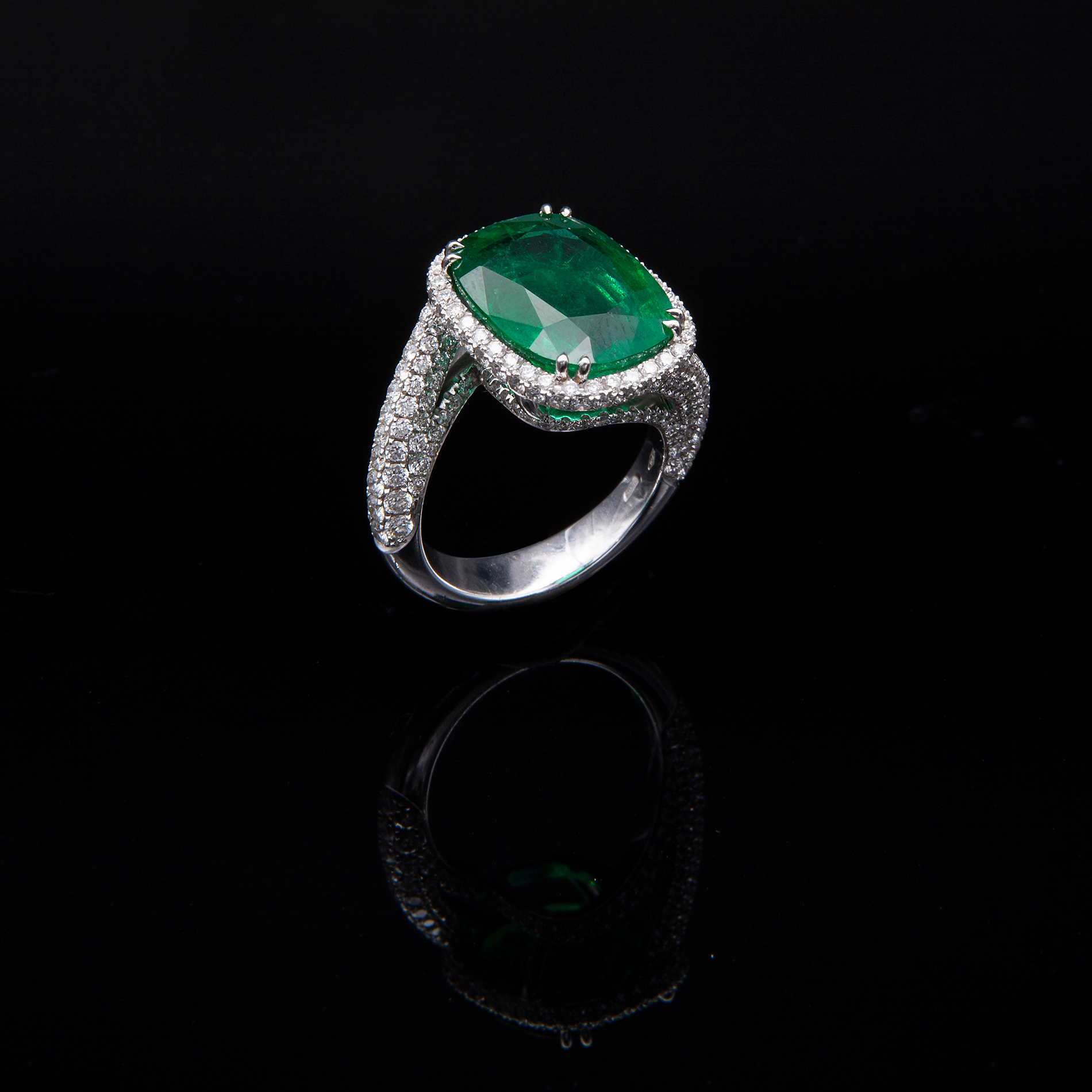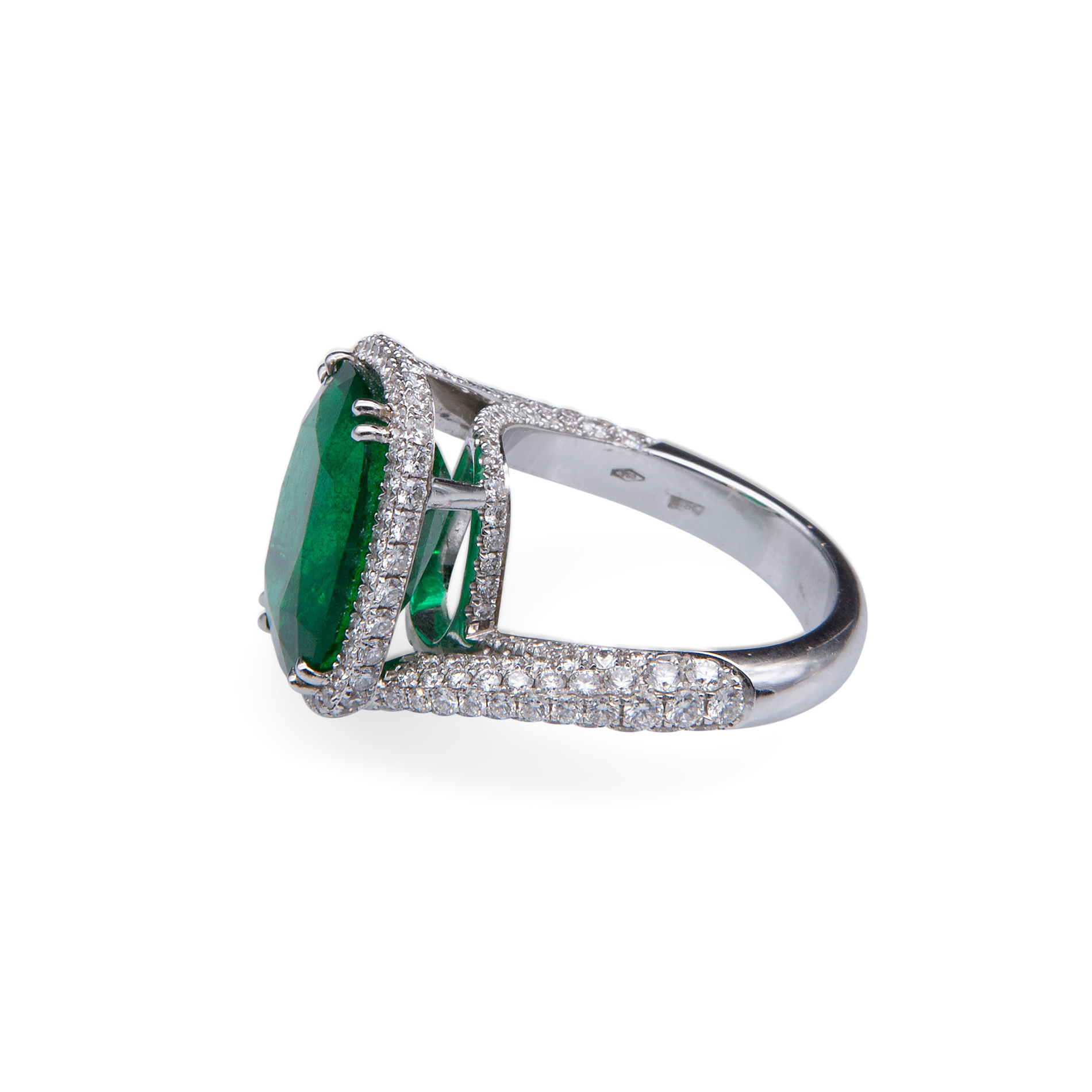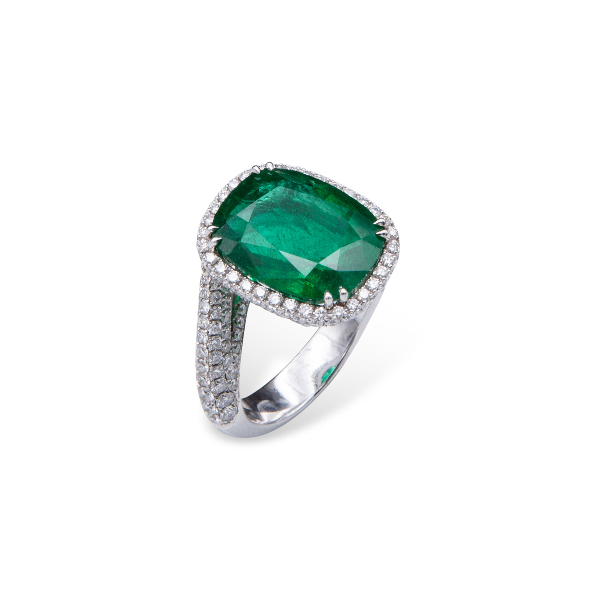 Anello in oro bianco, diamanti e smeraldo Oro bianco 18 kt, composto da brillanti per un totale di 2,50 ct circa e un grande smeraldo centrale taglio cuscino di 8,99 ct circa. Peso complessivo gr. 11,3, misura 14