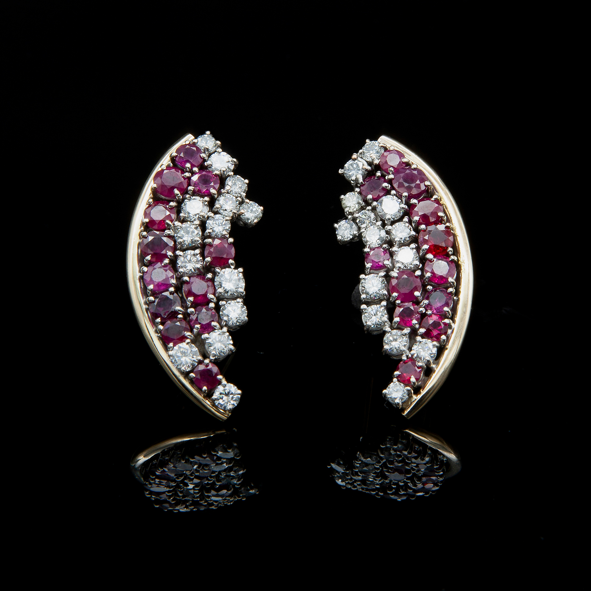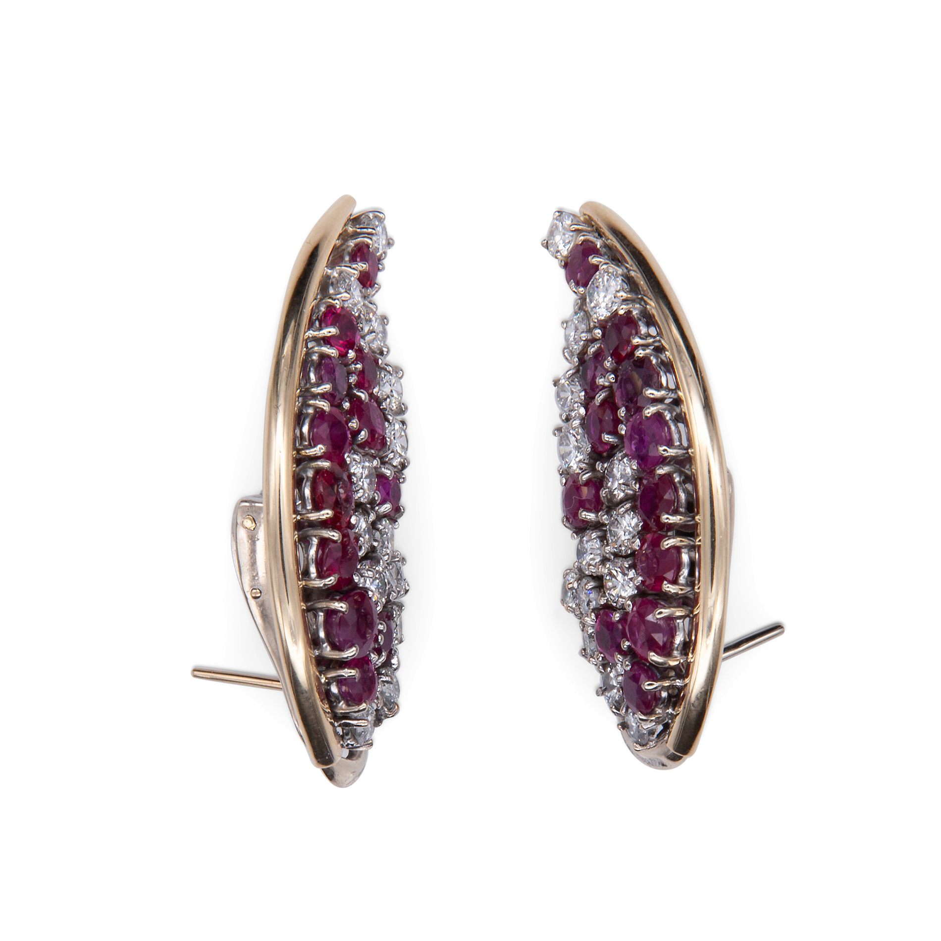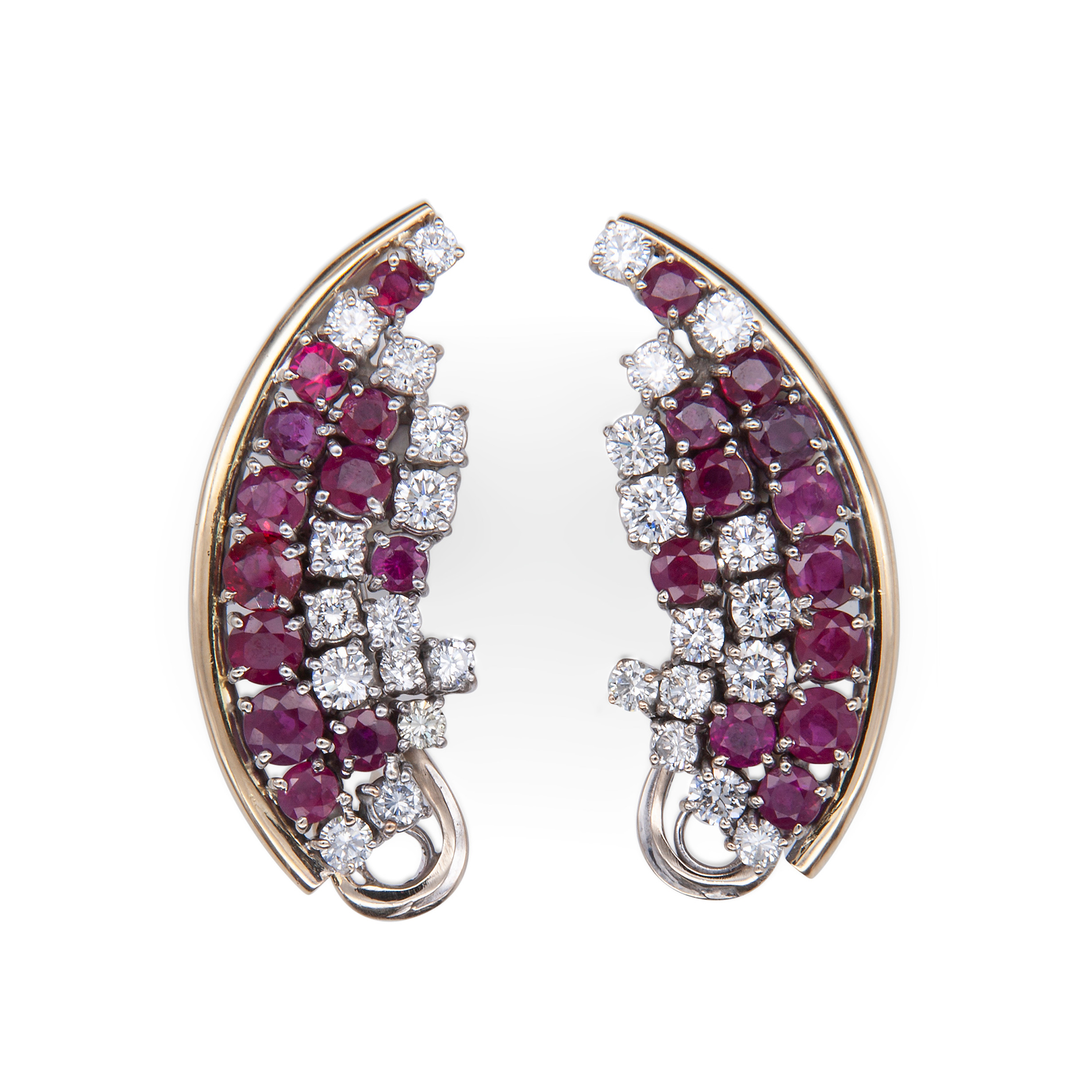 Orecchini in oro, rubini e diamanti Coppia di orecchini in oro giallo e bianco 18 kt, 24 rubini rotondi taglio brillante per un peso stimato di 2 ct; 28 diamanti rotondi taglio brillante per un peso stimato di 1,5 ct