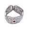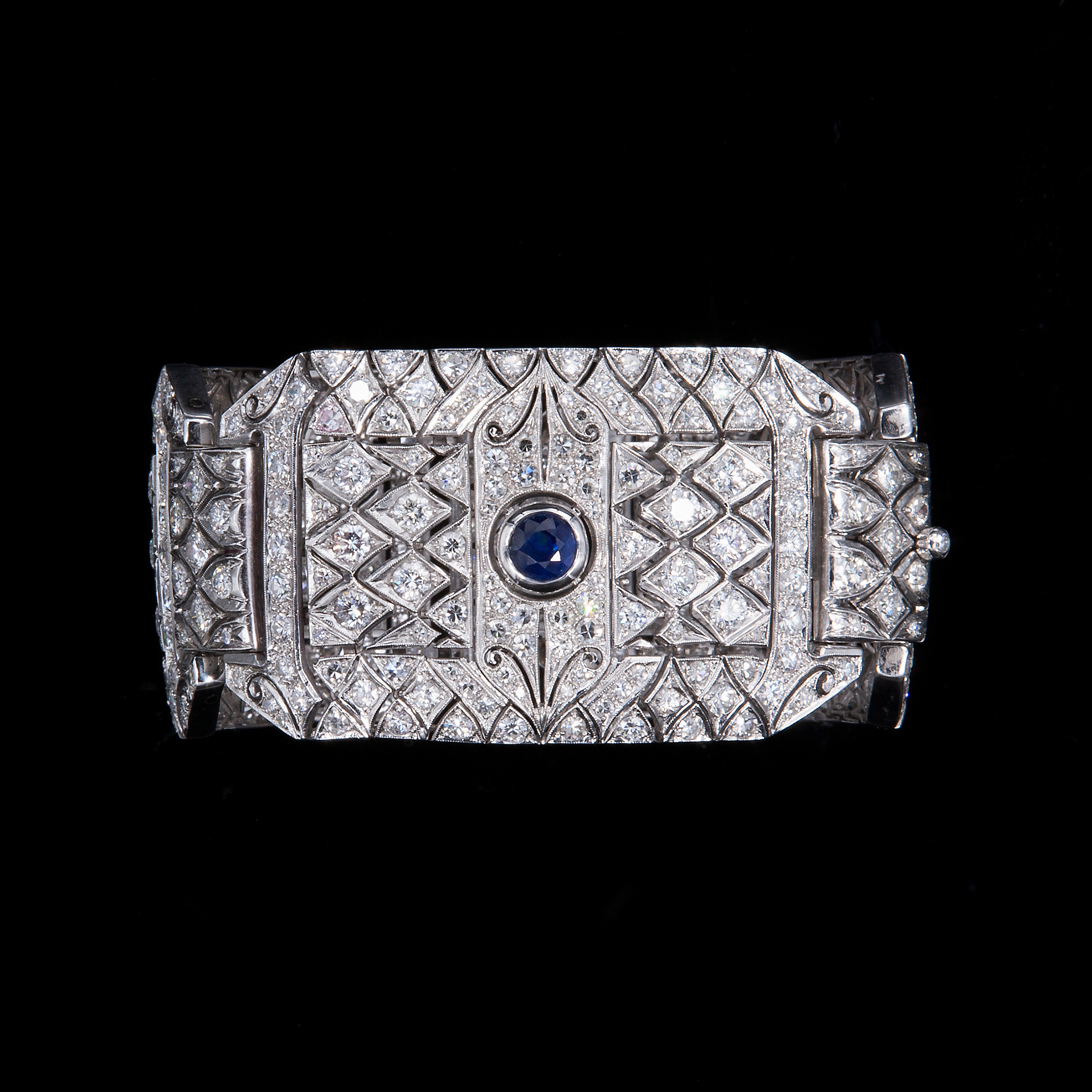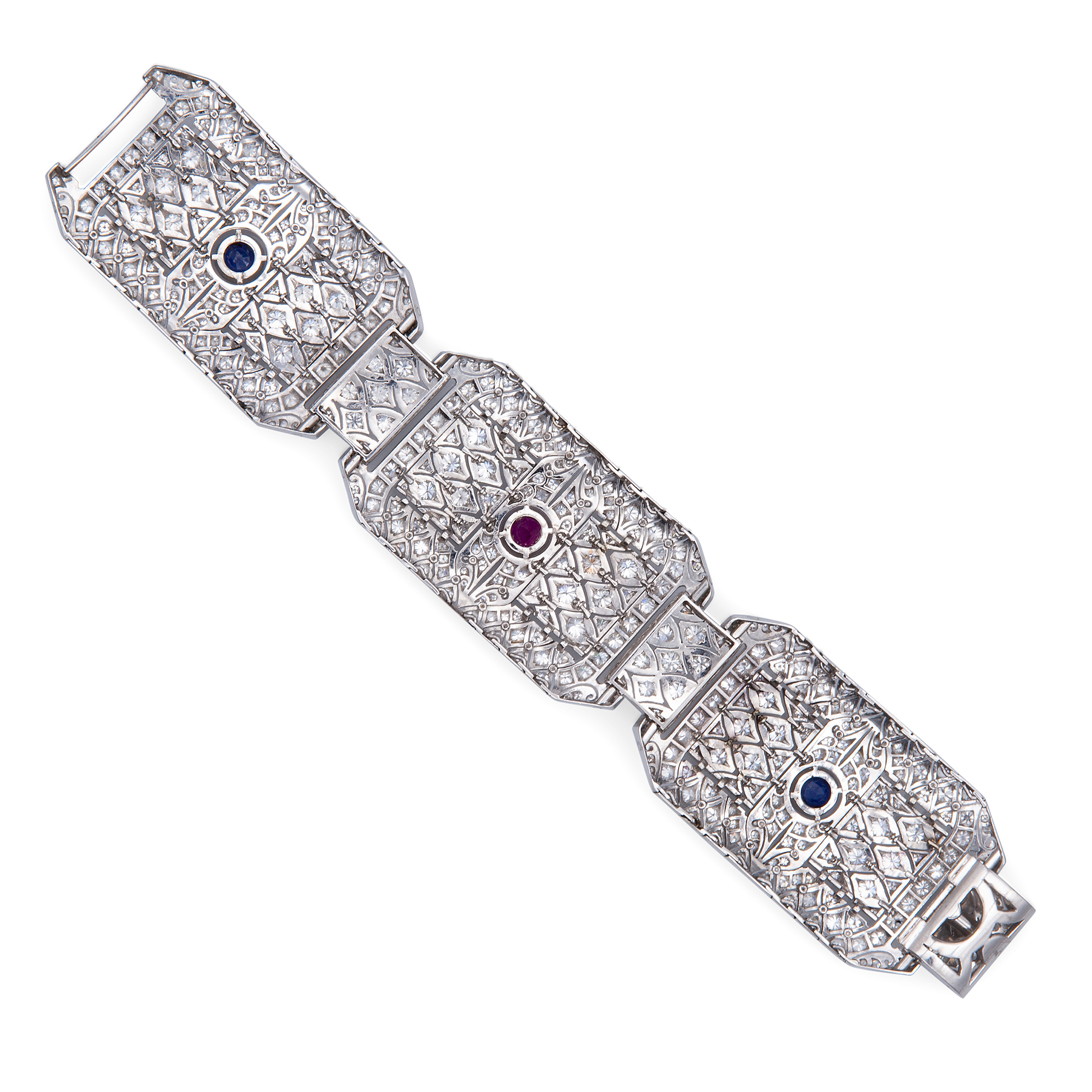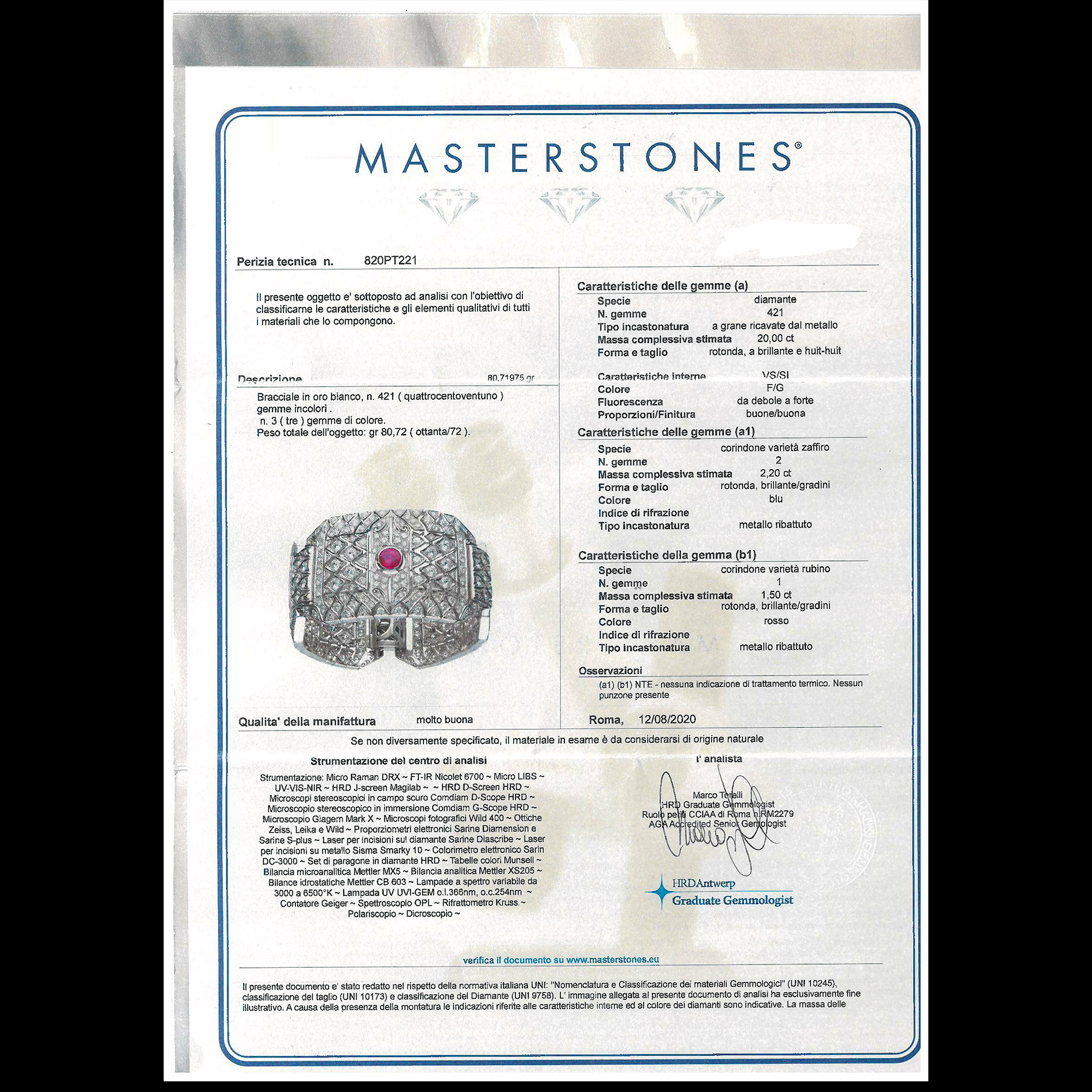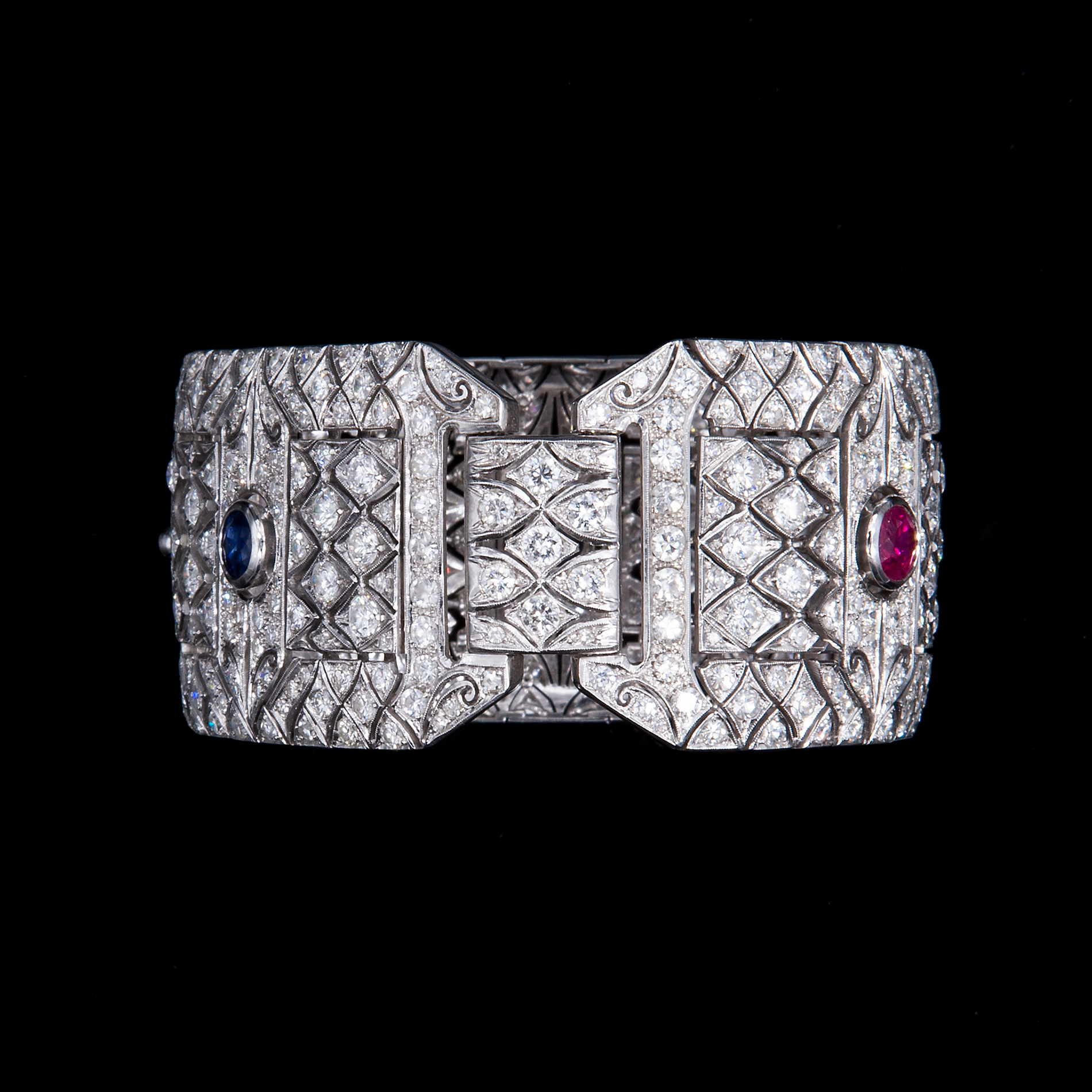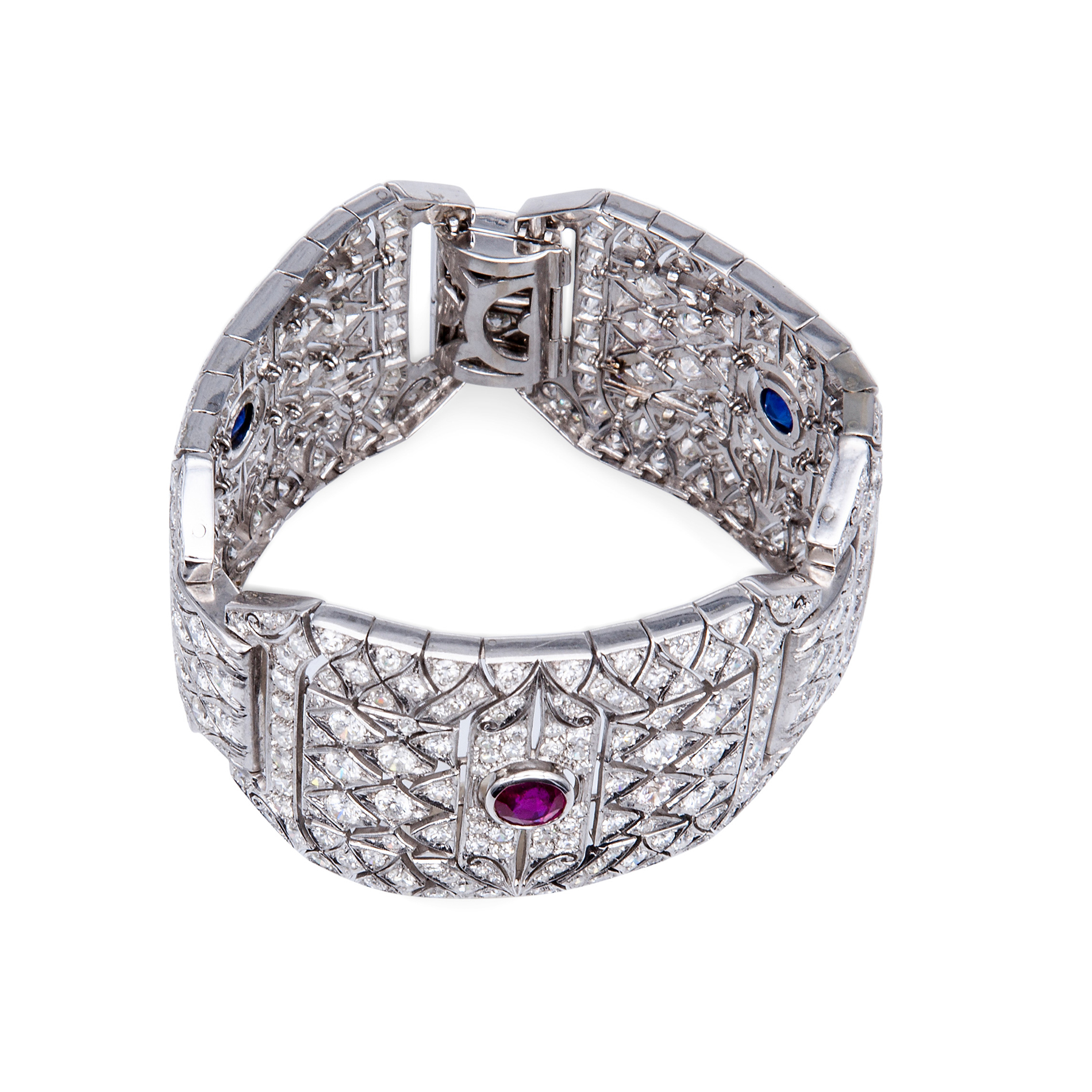 Bracciale in oro bianco, diamanti, due zaffiri e un rubino centrale Oro bianco 18 kt, decorato da 421 diamanti taglio brillante, per un peso stimato di 20 ct; due zaffiri per un peso stimato di 2 ct e un rubino di circa 1,50 ct. Peso complessivo gr. 80,
