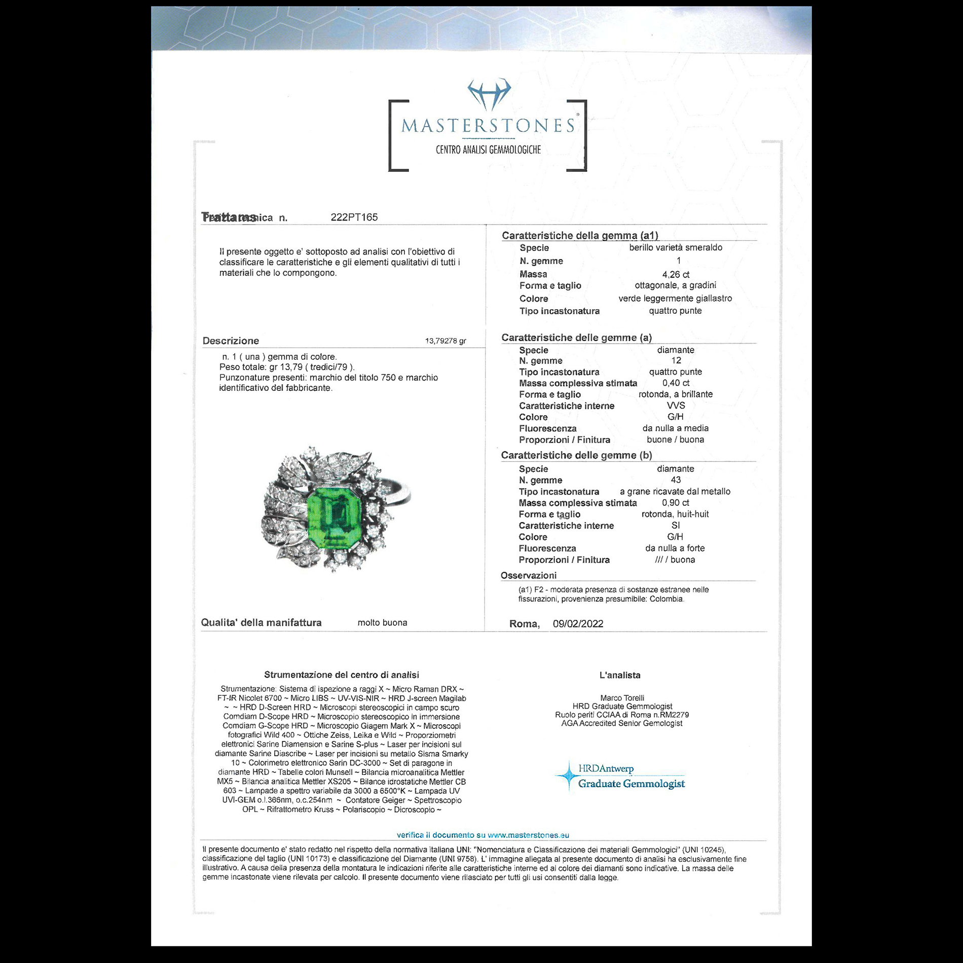Anello in oro bianco, diamanti e smeraldo centrale colombiano