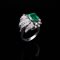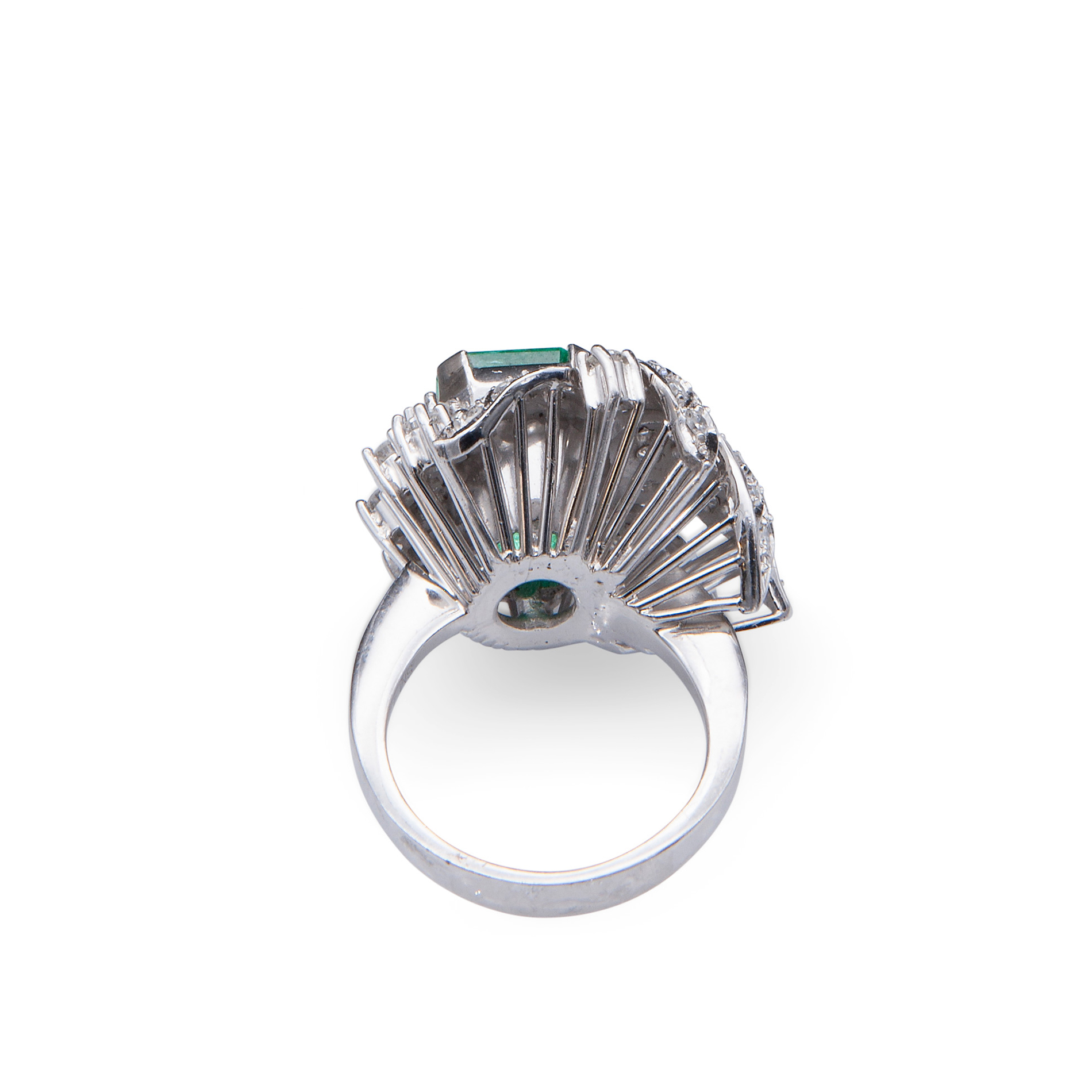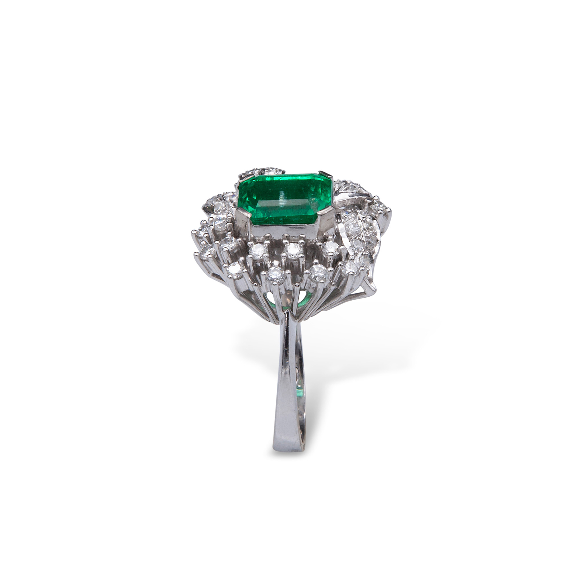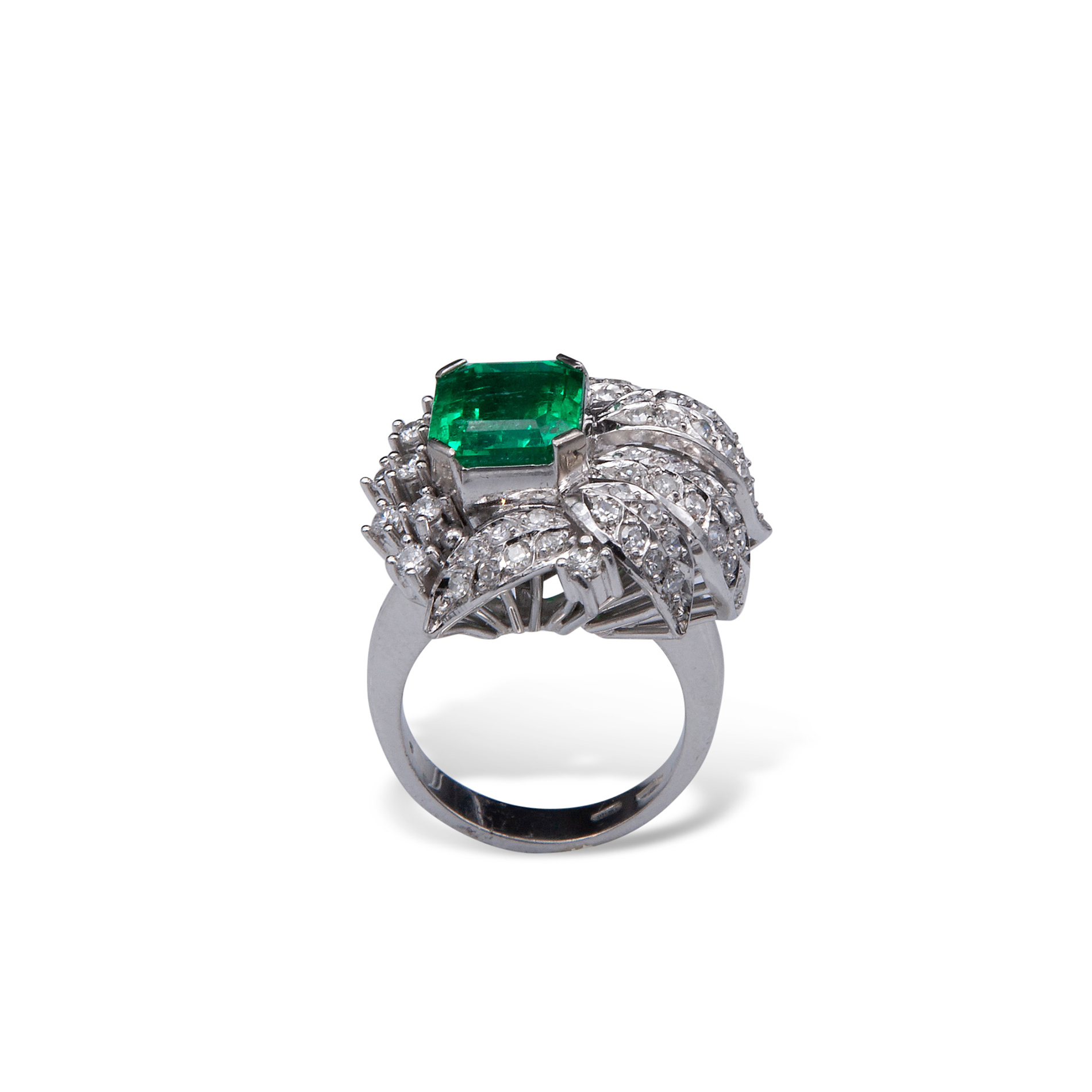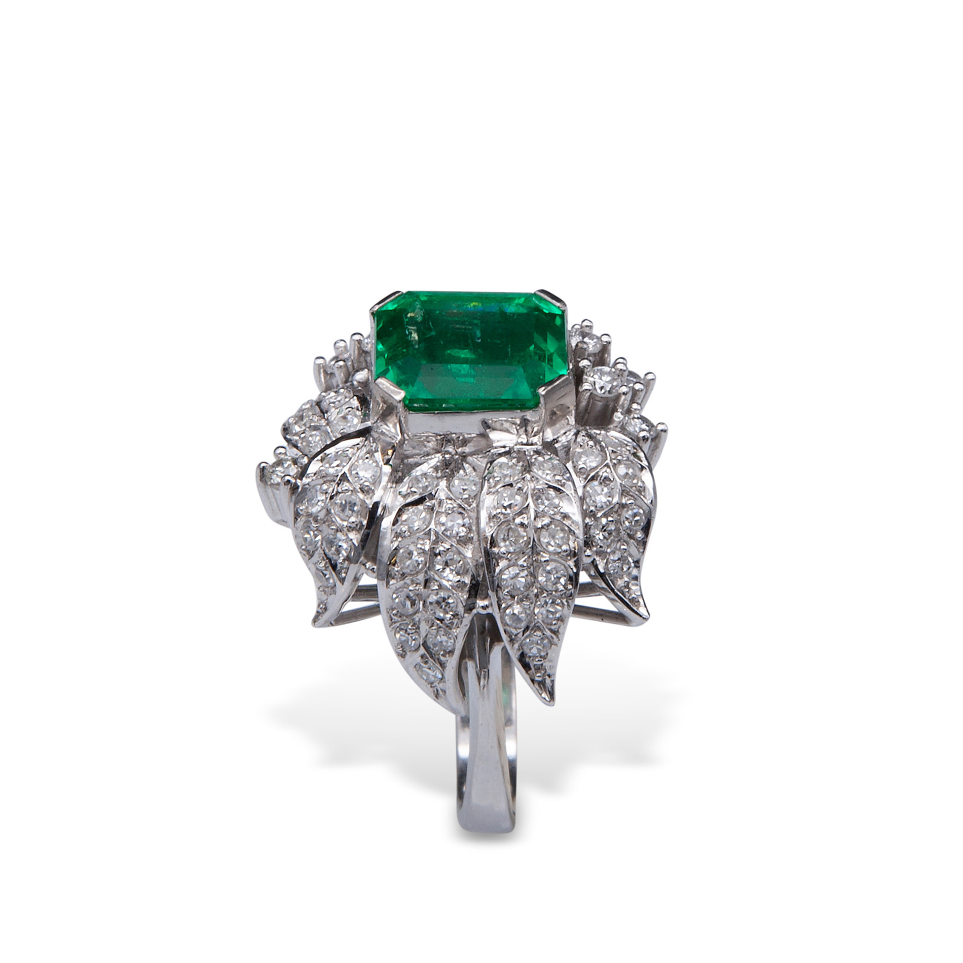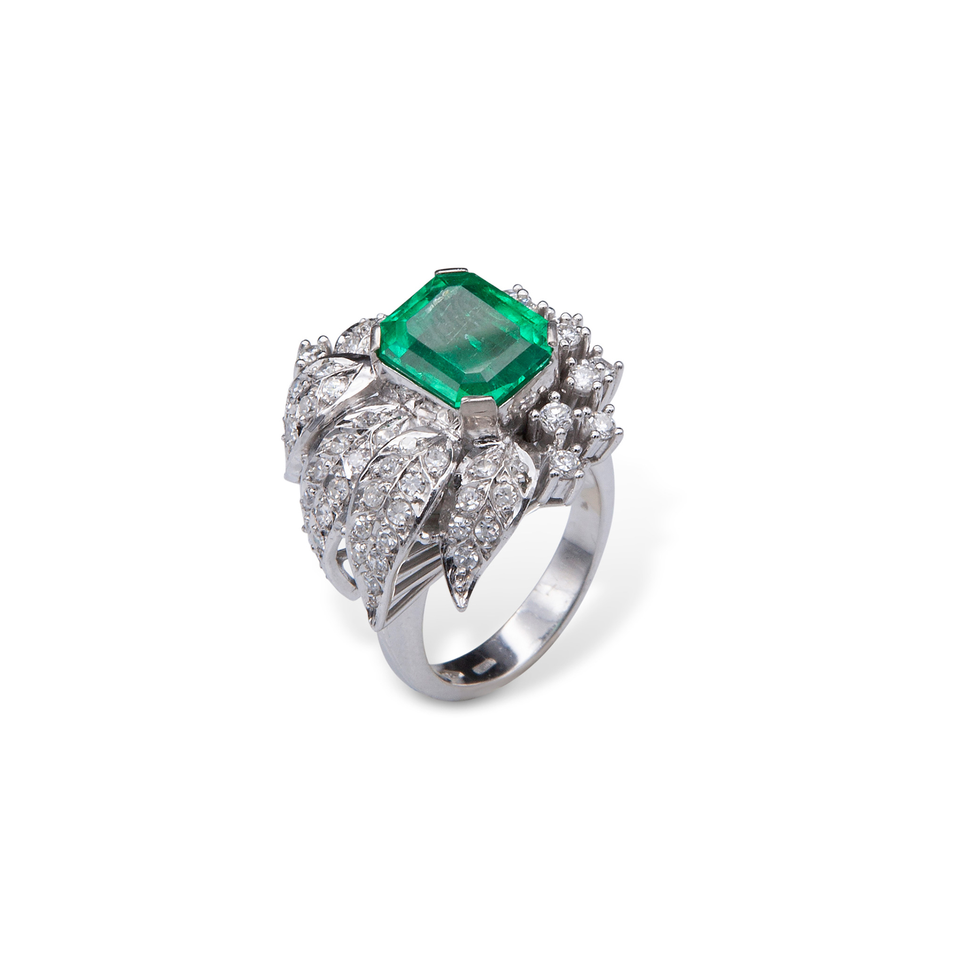 Anello in oro bianco, diamanti e smeraldo centrale colombiano Smeraldo centrale ottagonale a gradini, di un peso stimato di circa 4,26 ct, contornato da 'foglie' in oro bianco e 55 diamanti rotondi taglio brillante e huit-huit di circa 1,30 ct totali. P