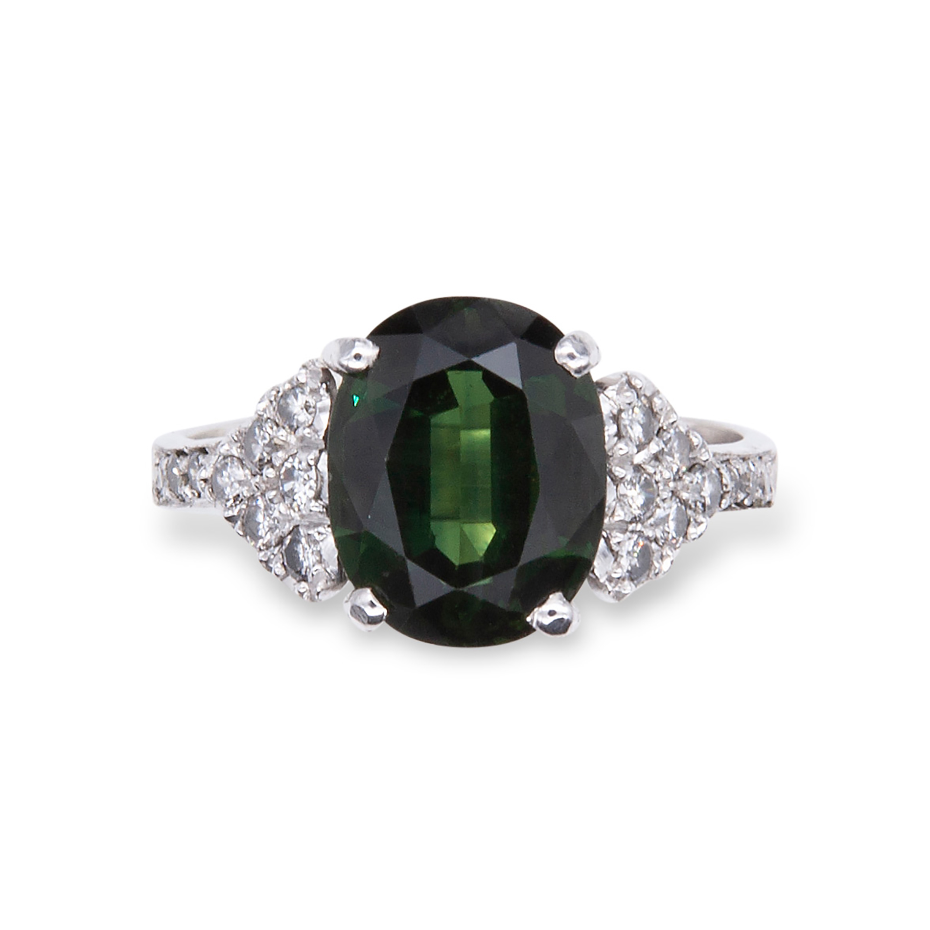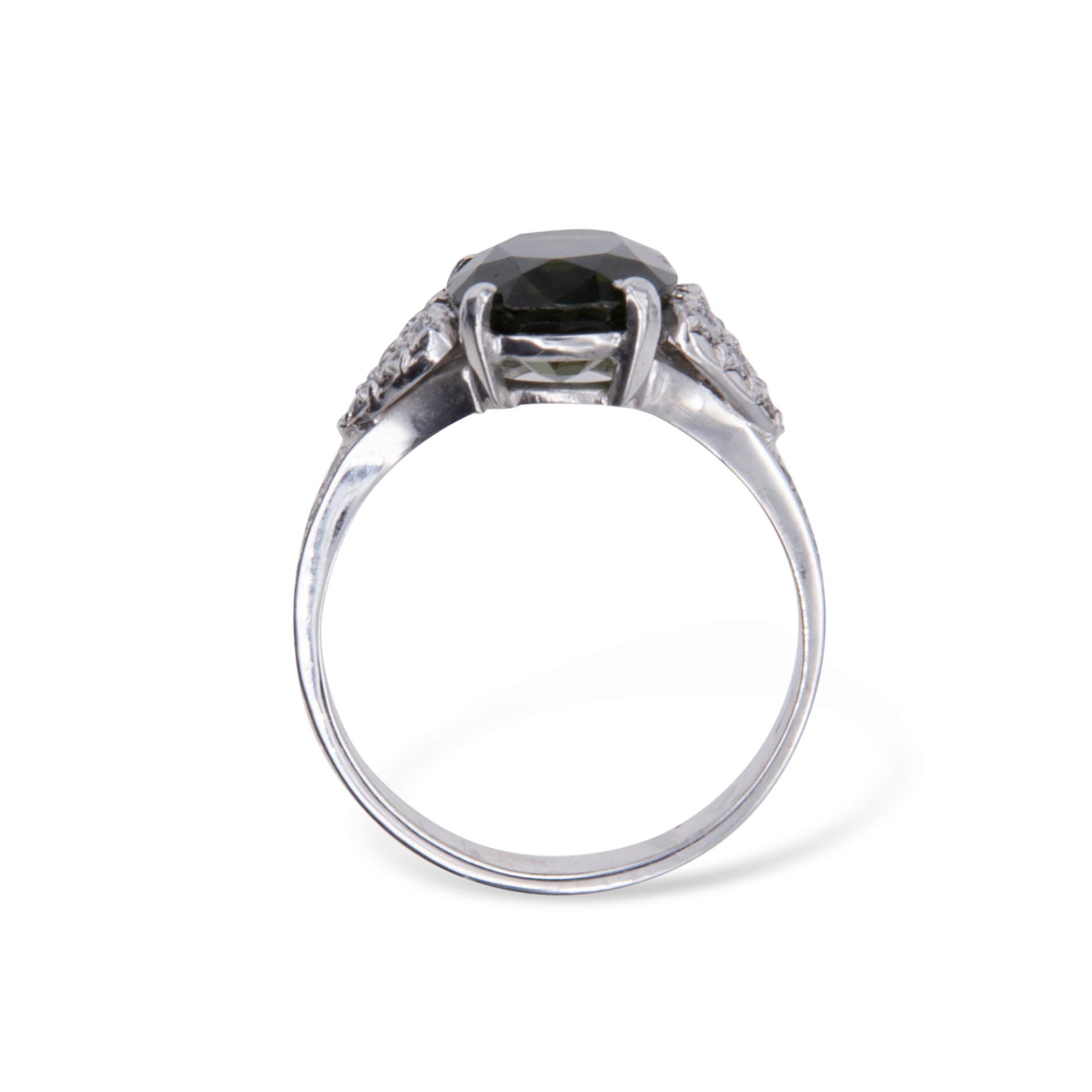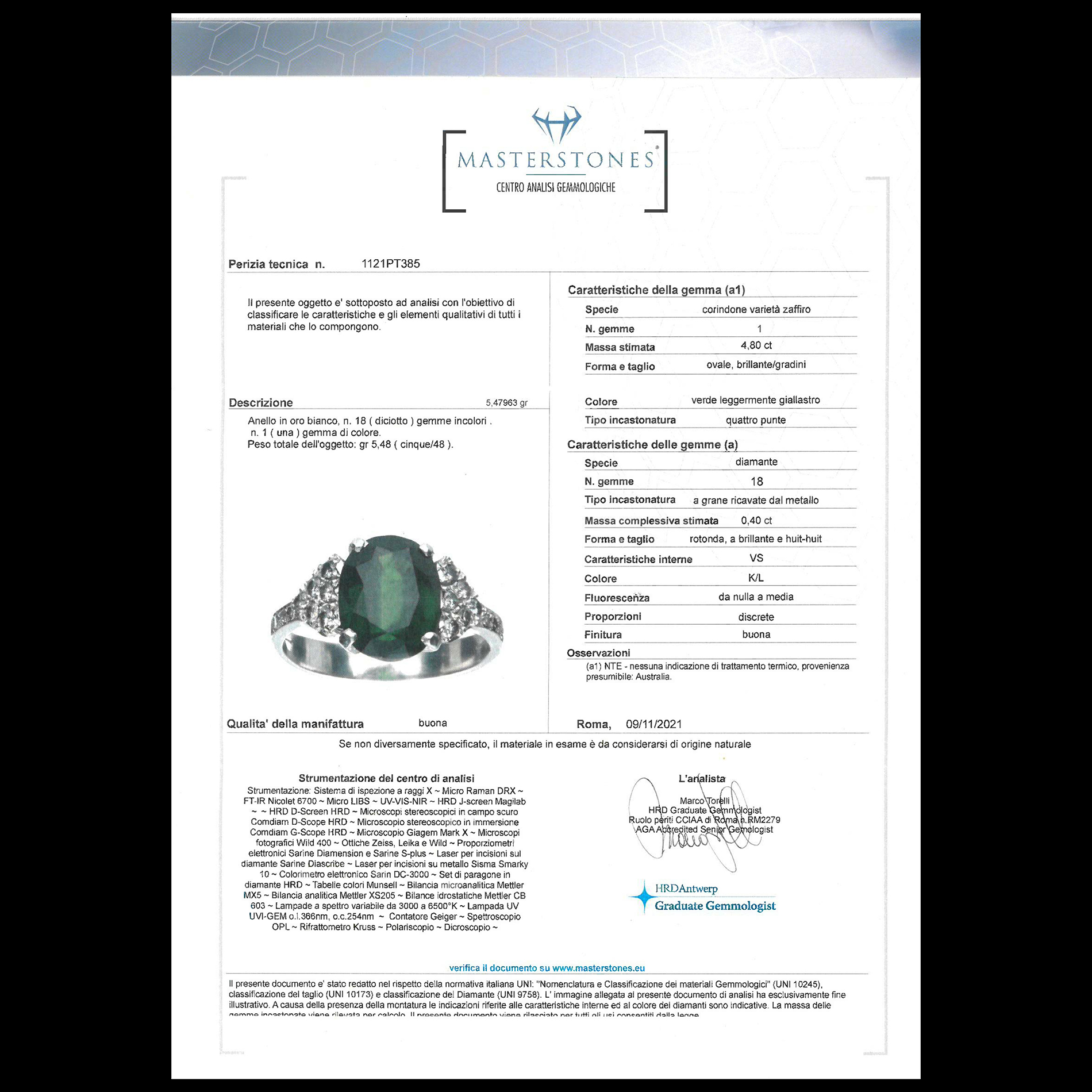 Anello in oro bianco, diamanti e zaffiro verde australiano Oro bianco 18 kt, grande zaffiro verde ovale taglio brillante/gradini di circa 4,80 ct, affiancato da 18 diamanti rotondi taglio brillante e huit huit, per un peso stimato di 0,40 ct. Peso compl