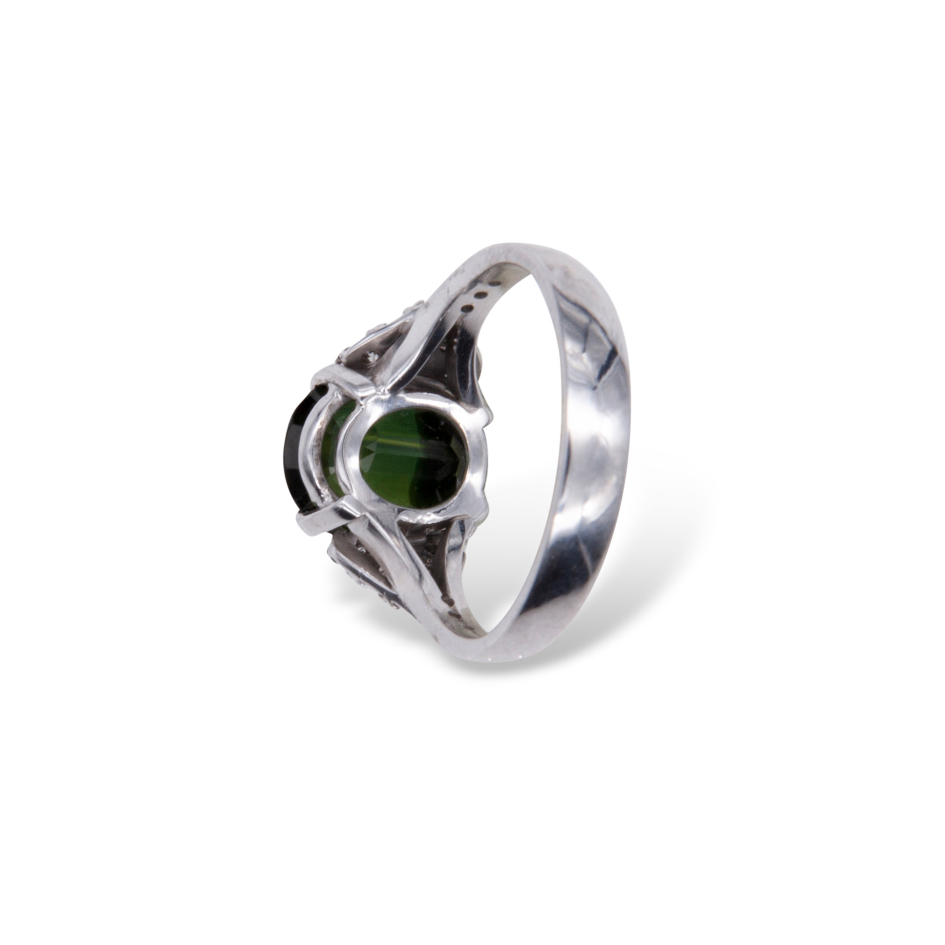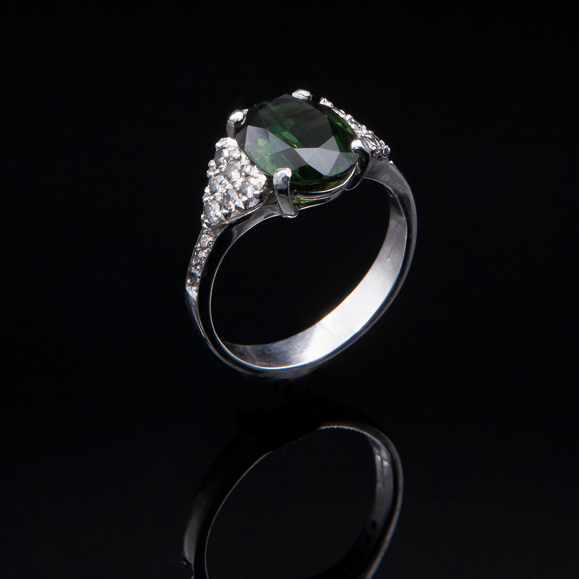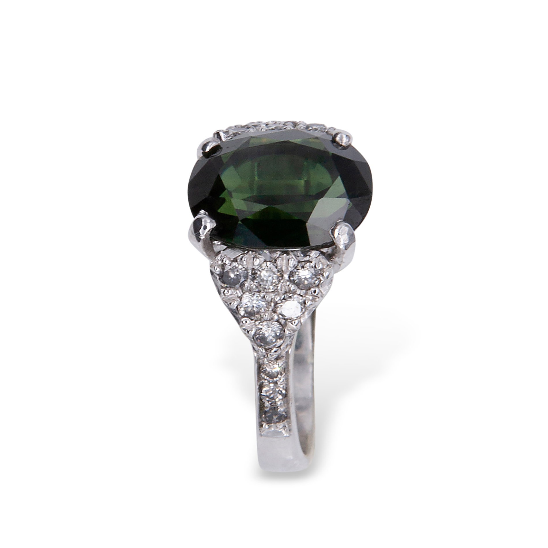 Anello in oro bianco, diamanti e zaffiro verde australiano