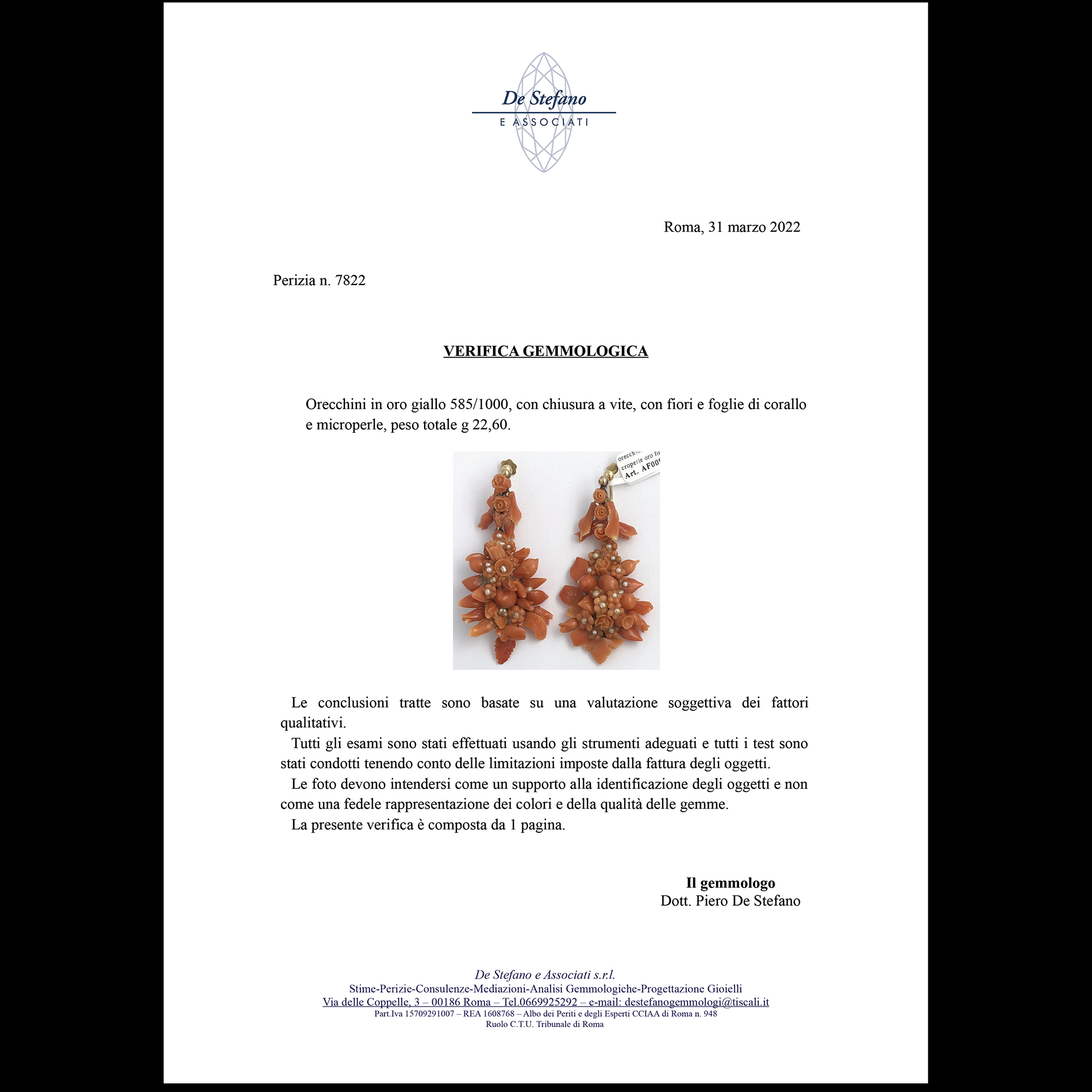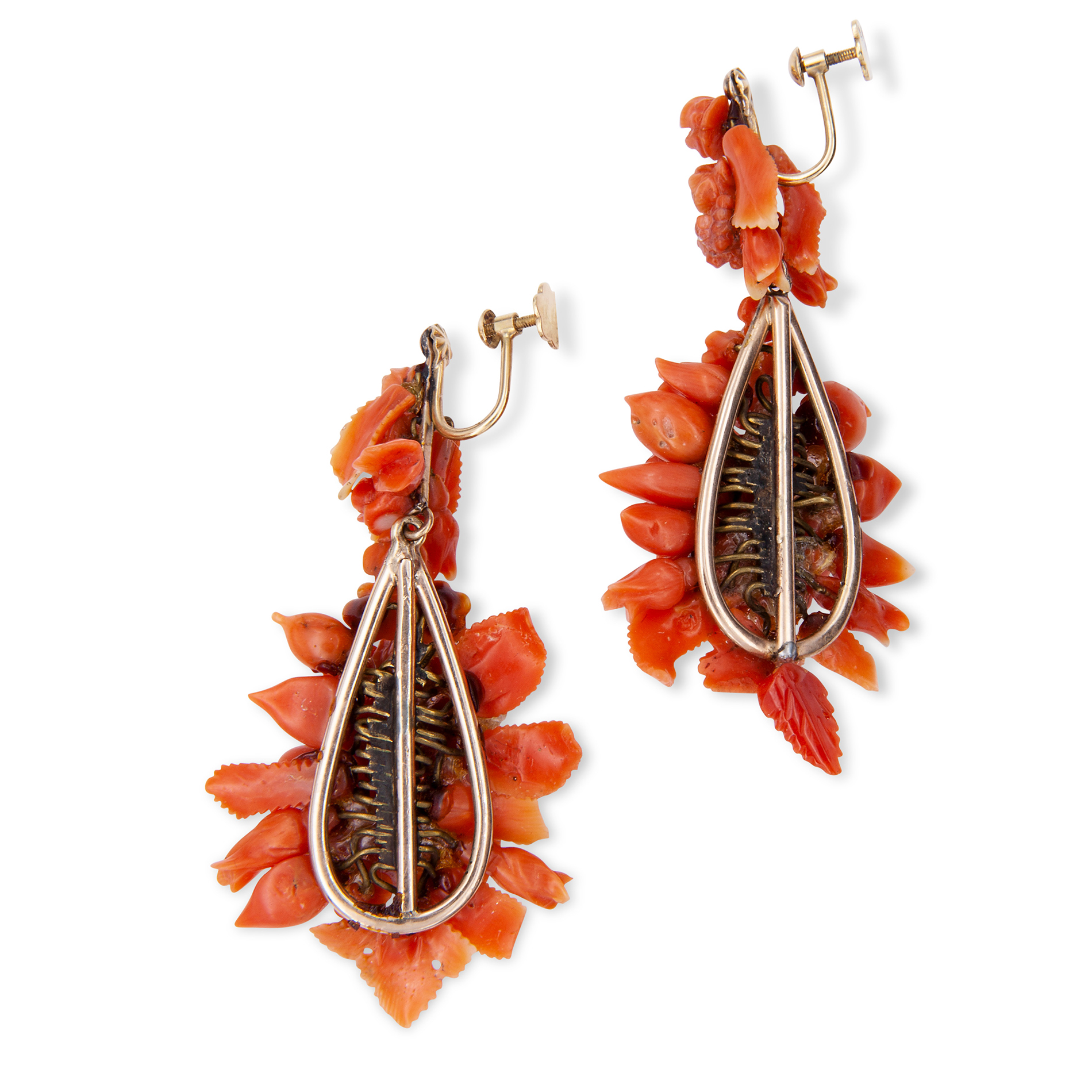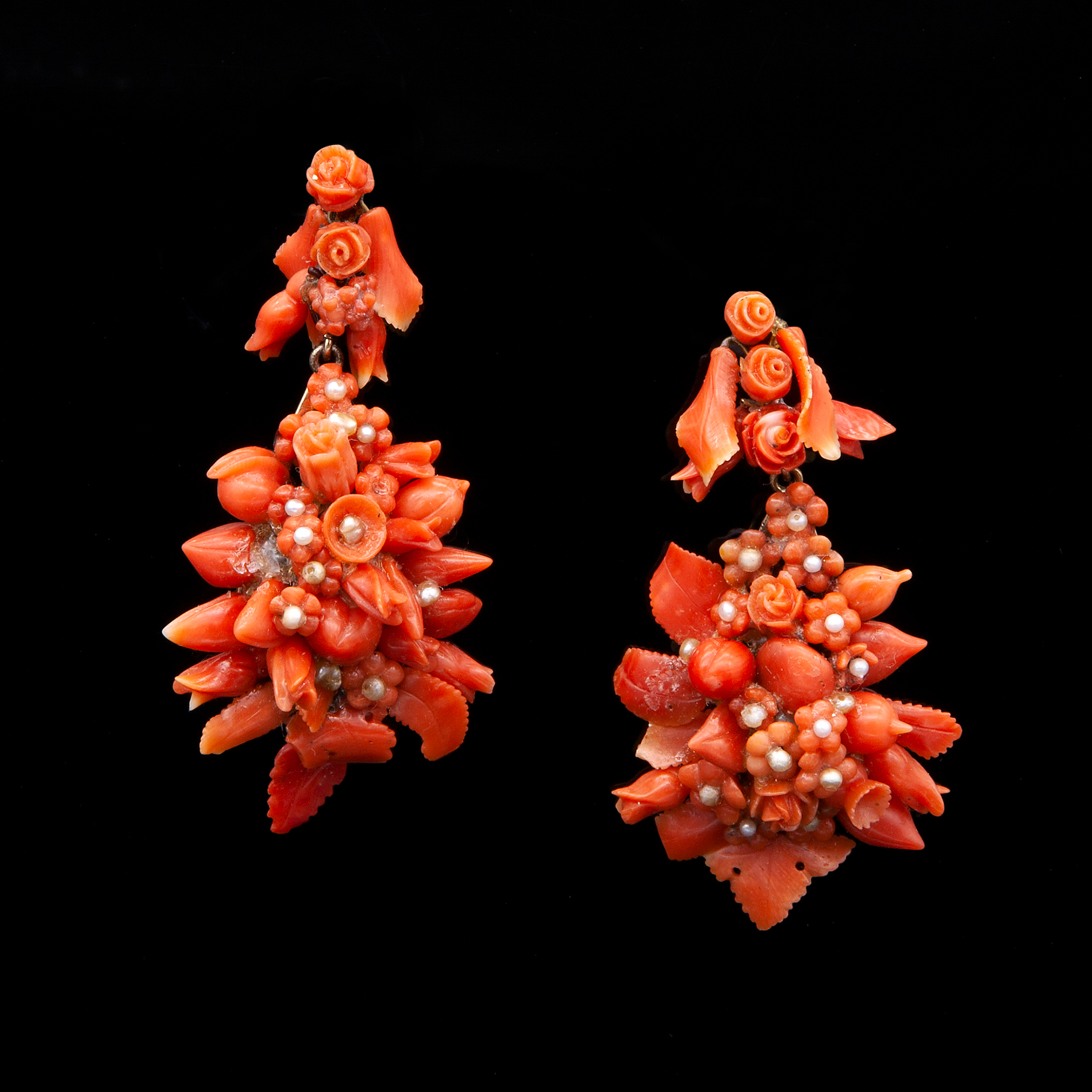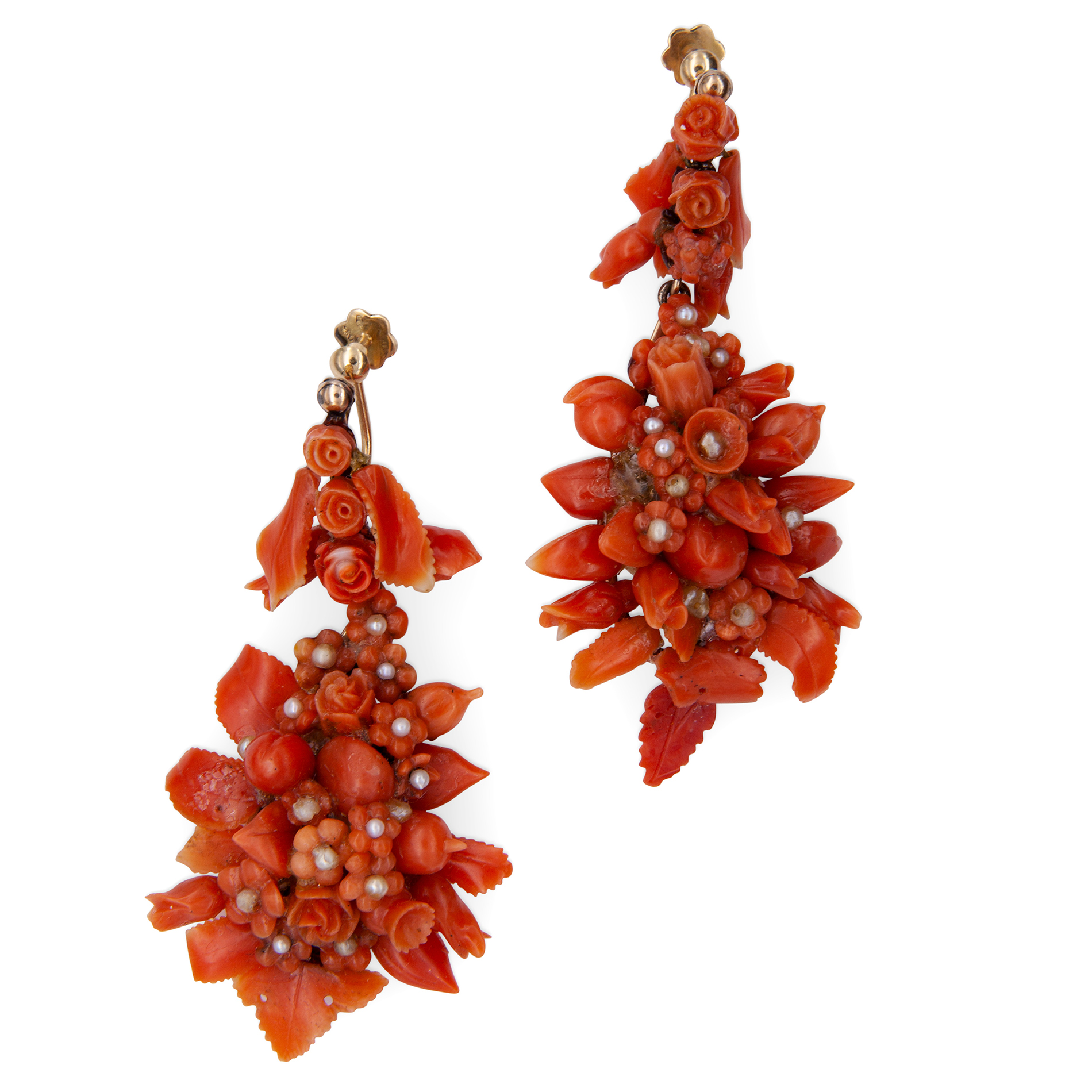 Antichi orecchini in oro giallo e microperle Oro giallo 14 kt con chiusura a vite, con fiori e foglie di corallo e microperle. Peso complessivo gr. 22,60