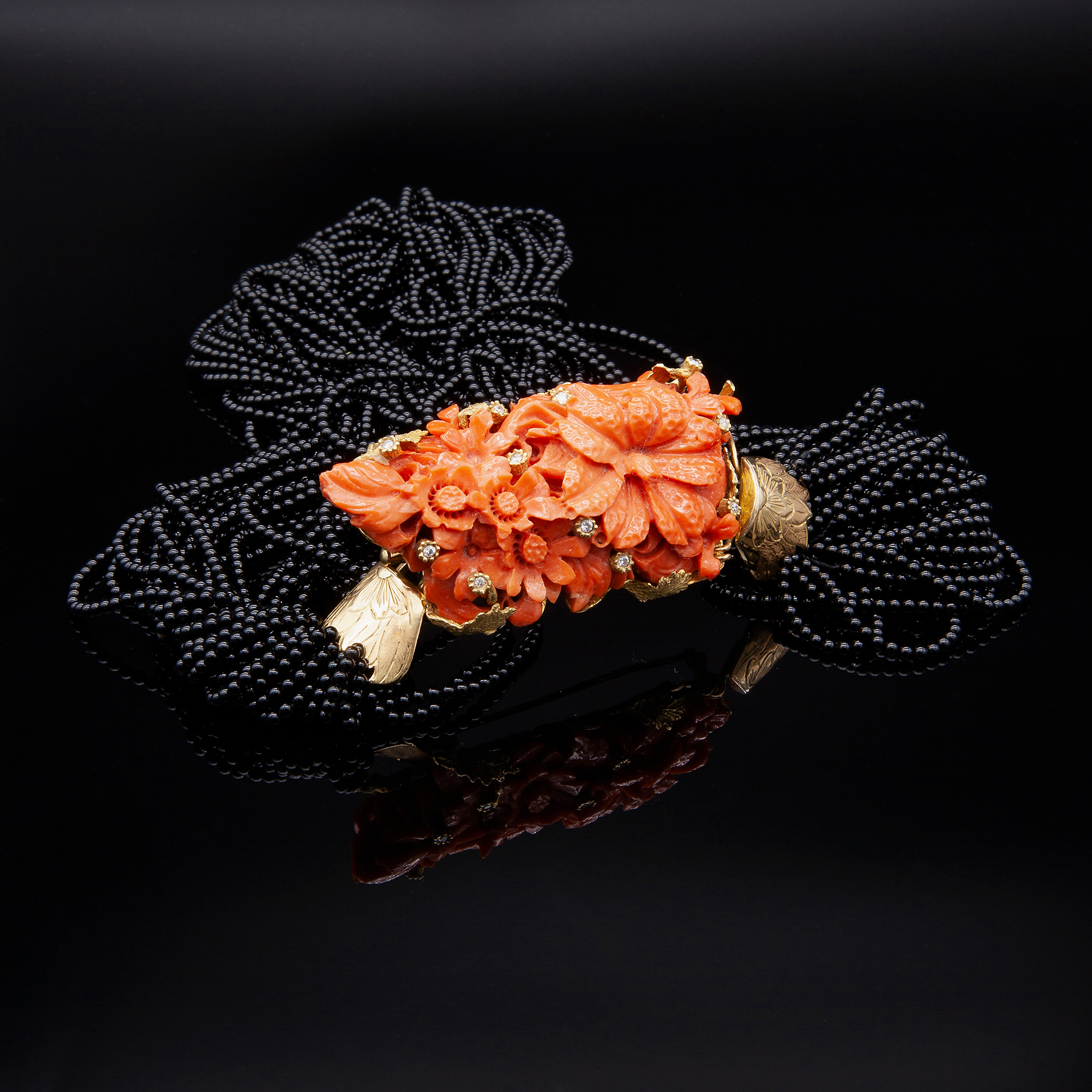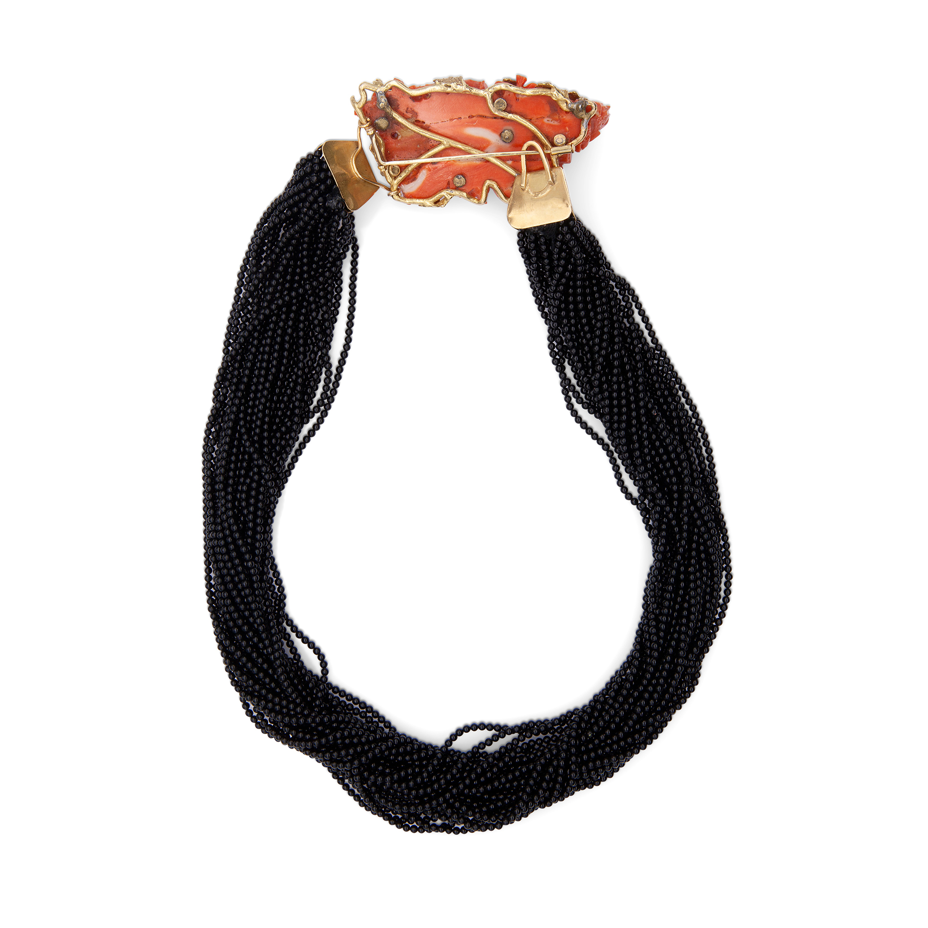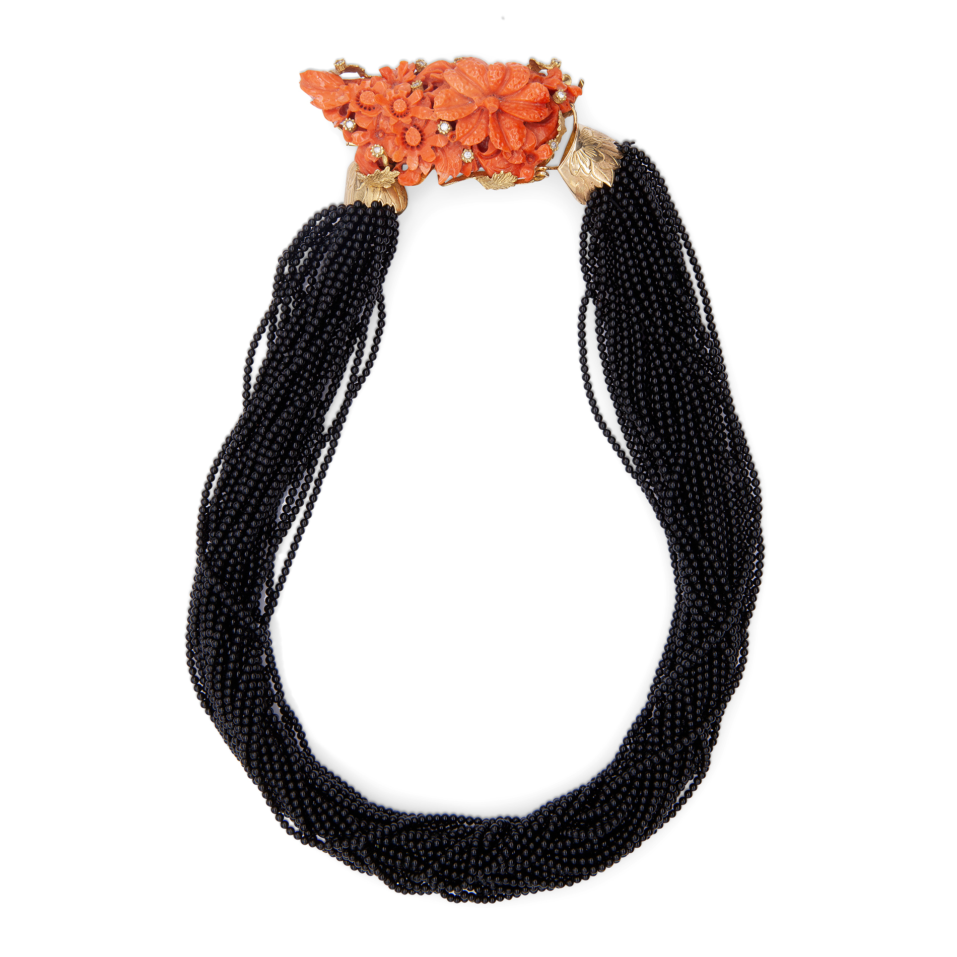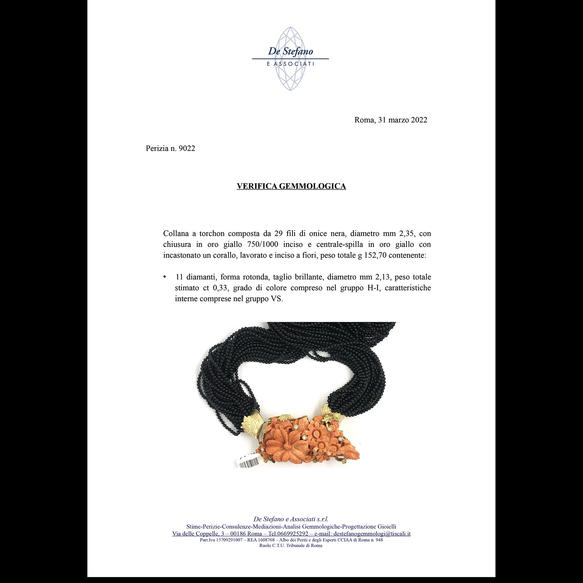 Collana a torchon in onice, oro giallo e corallo inciso Torchon composto da 29 fili di onice nera, chiusura e centrale-spilla in oro giallo 18 kt inciso con