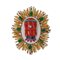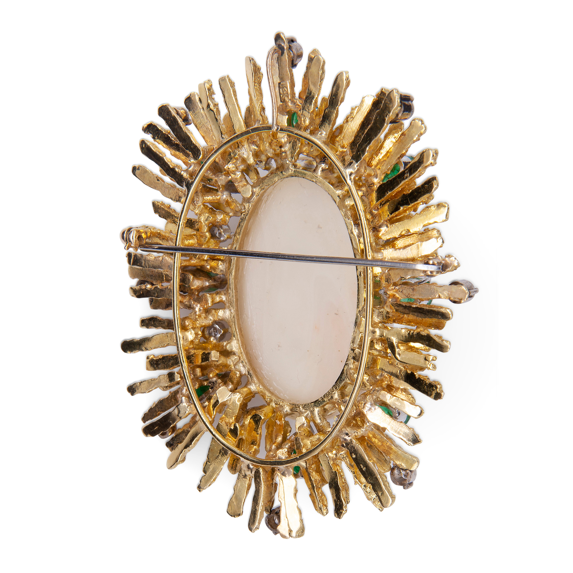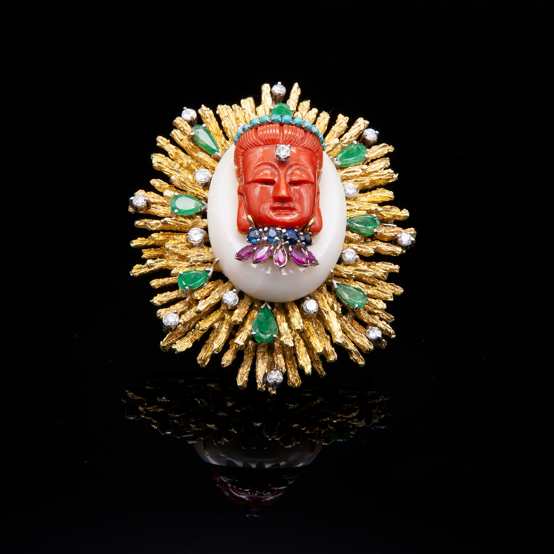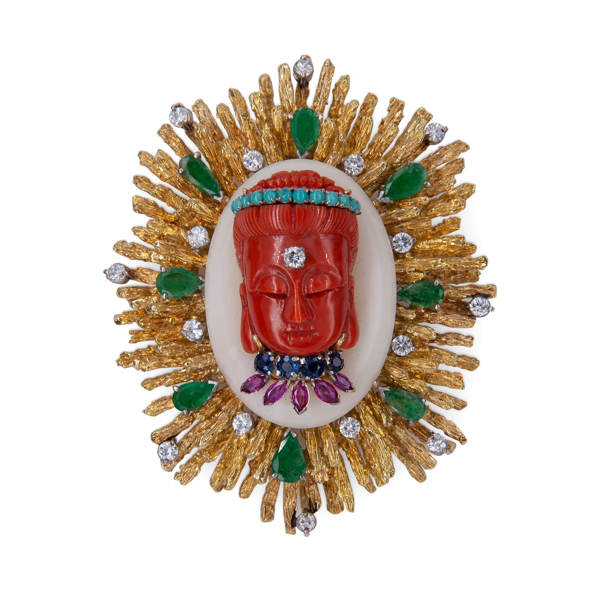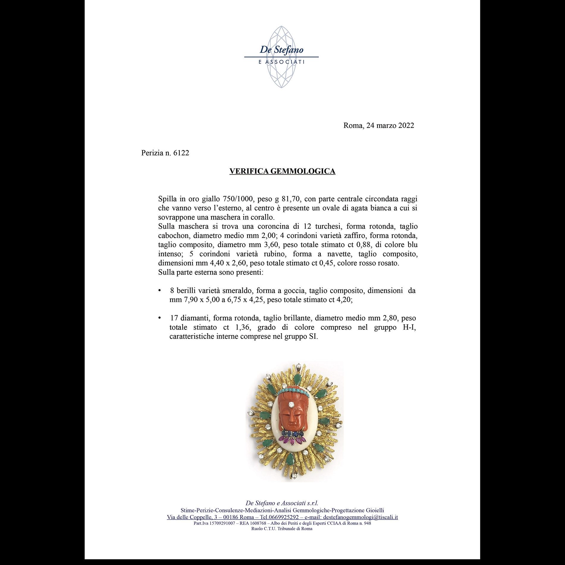 Spilla oro giallo, agata, corallo e pietre preziose Spilla in oro giallo 18 kt , con parte centrale circondata raggi che vanno verso l’esterno, al centro è presente un ovale di agata bianca a cui si sovrappone una maschera in corallo. Sulla maschera si