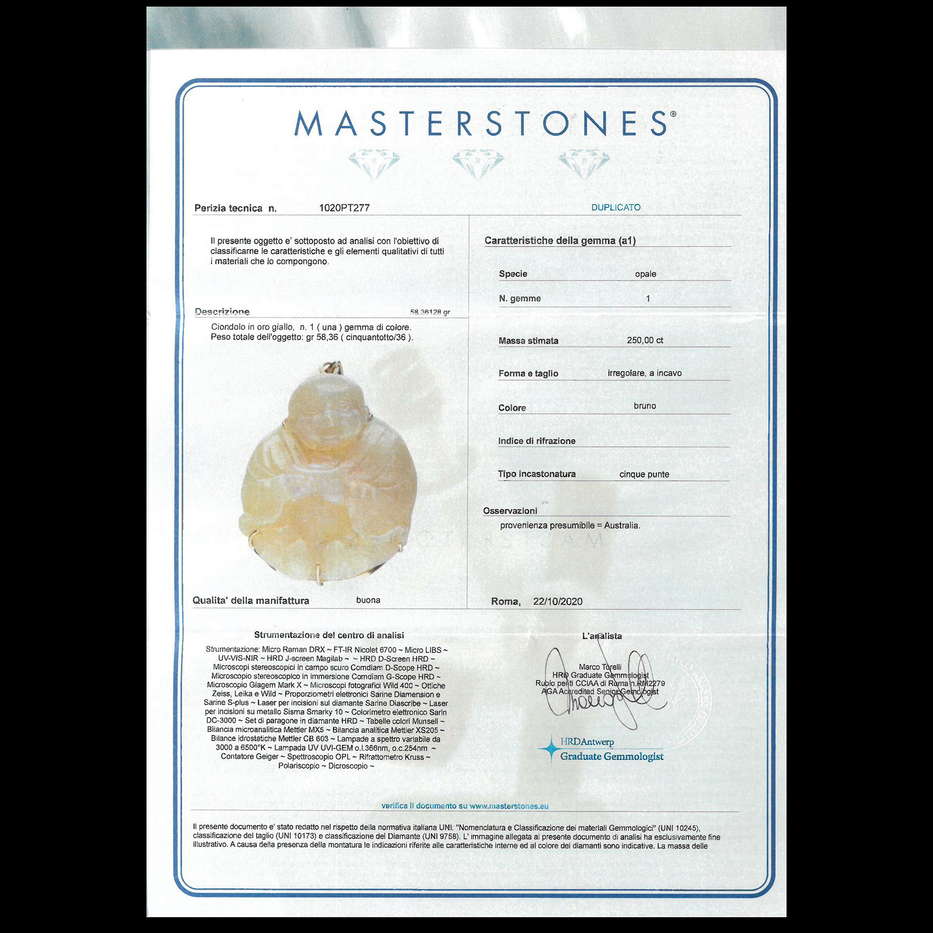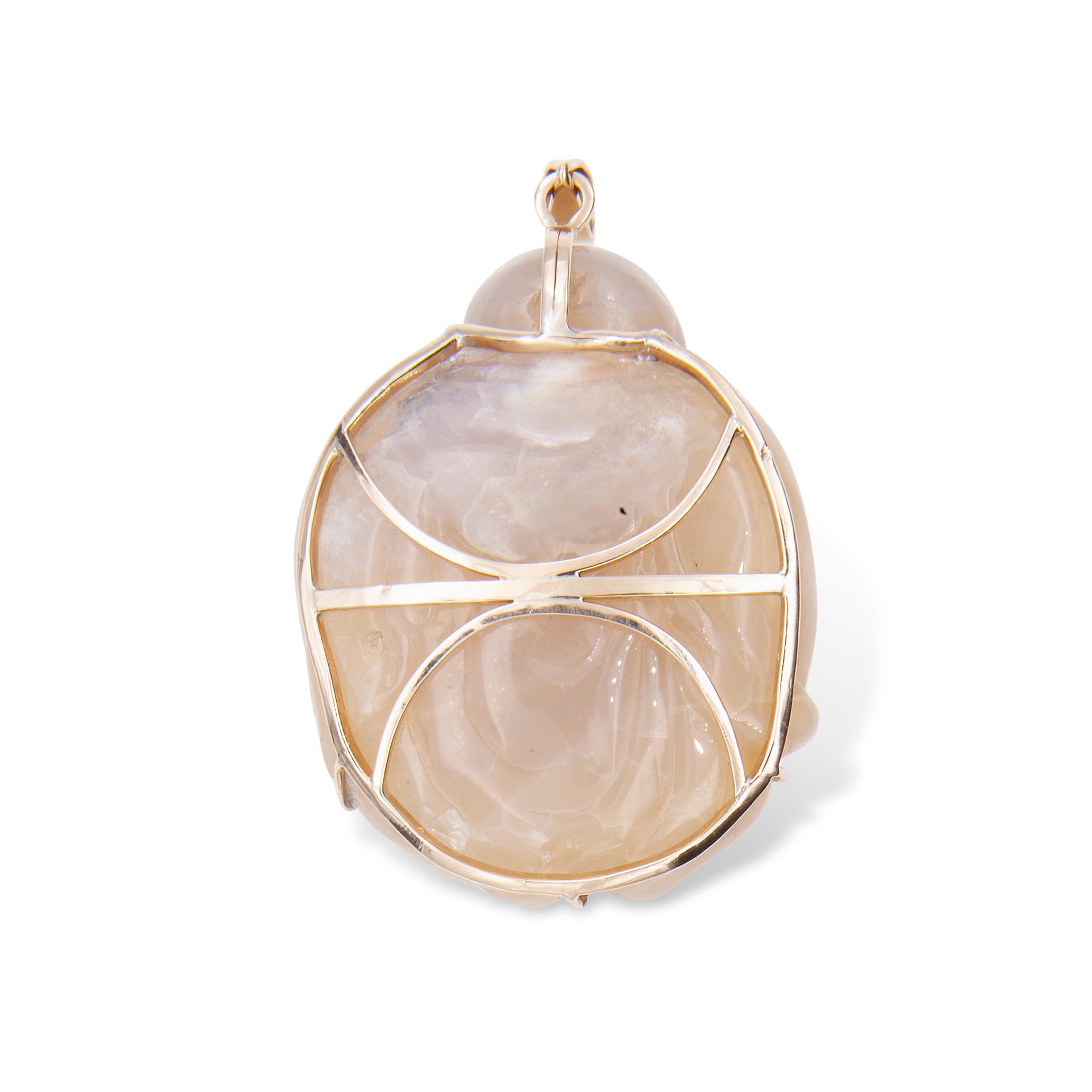 Ciondolo in oro giallo e opale nobile in figura di Buddha Oro giallo 9 kt, opale australiano di colore bruno di 250 ct circa, lavorato ad incavo. Peso complessivo gr. 58,36