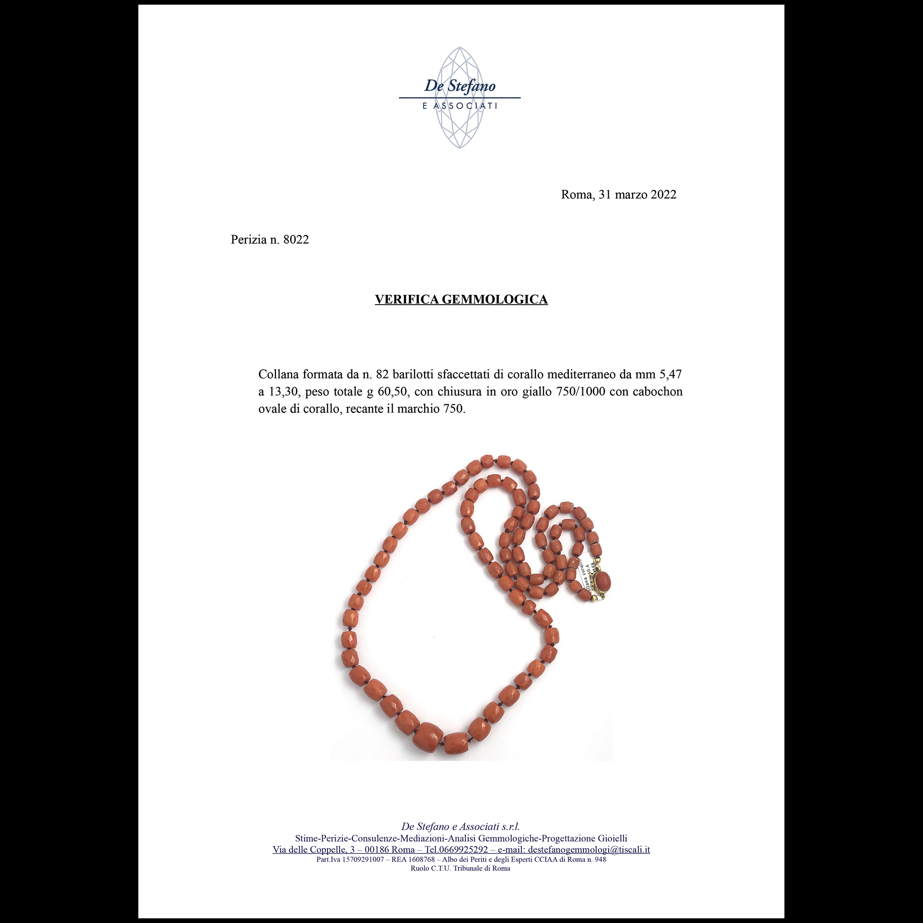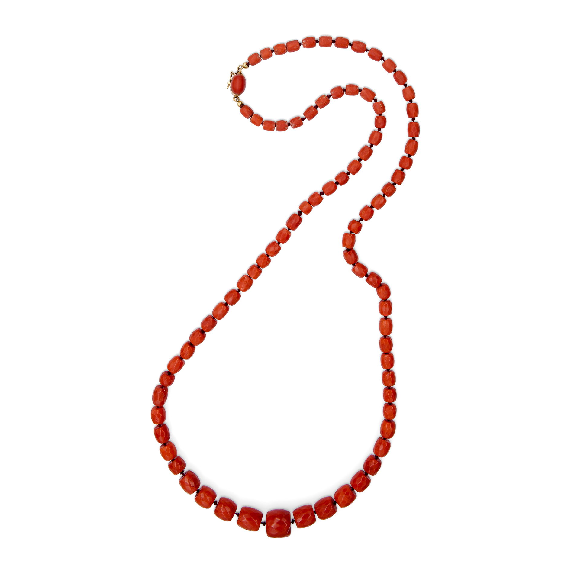 Collana in corallo mediterraneo a barilotto Collana formata da 82 barilotti sfaccettati di corallo mediterraneo, con chiusura in oro giallo 18 kt con cabochon ovale di corallo. Peso complessivo gr. 60,50, recante timbro titolo 18 kt