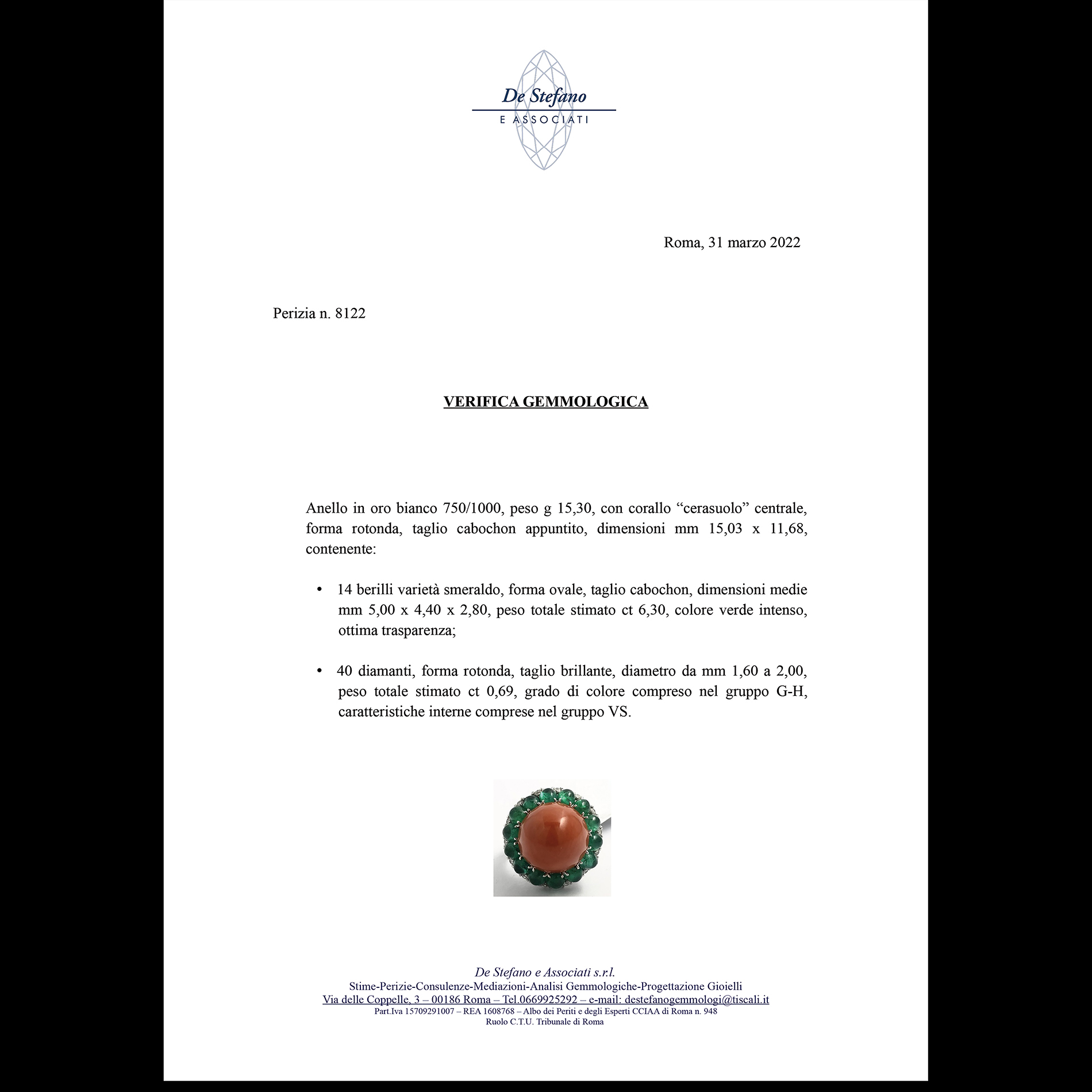 Lotto 112 | Anello in oro bianco, corallo, diamanti e smeraldo