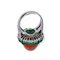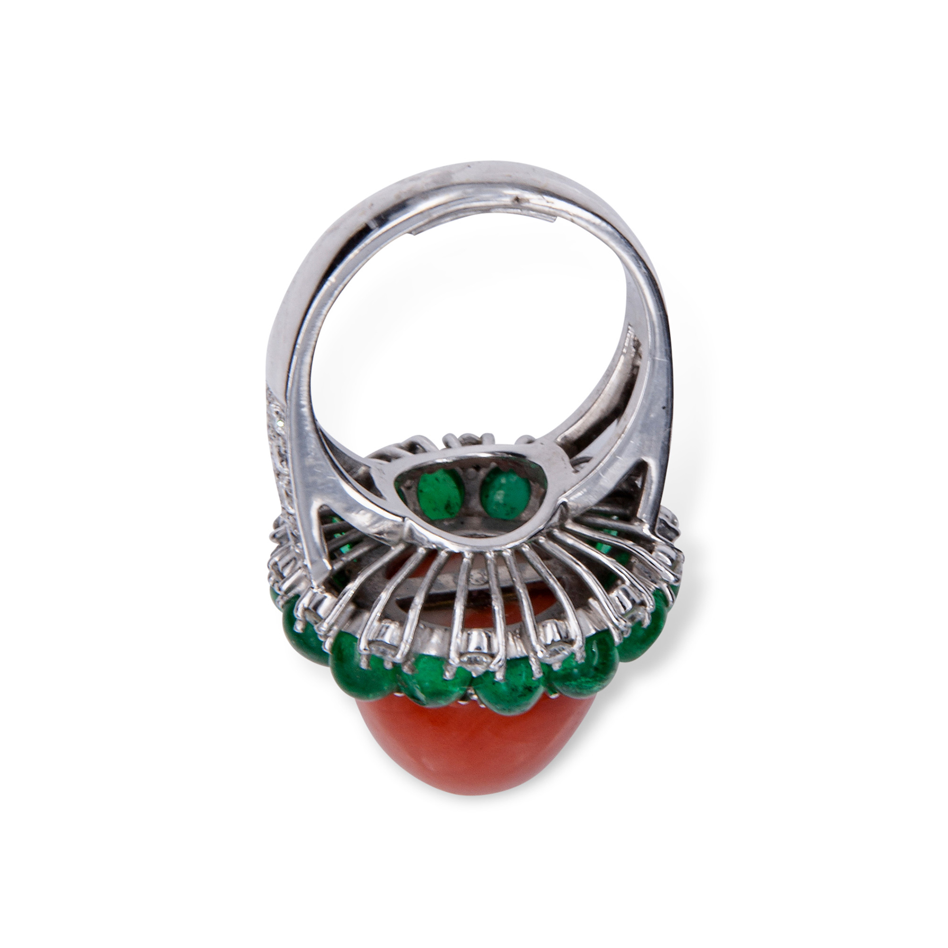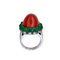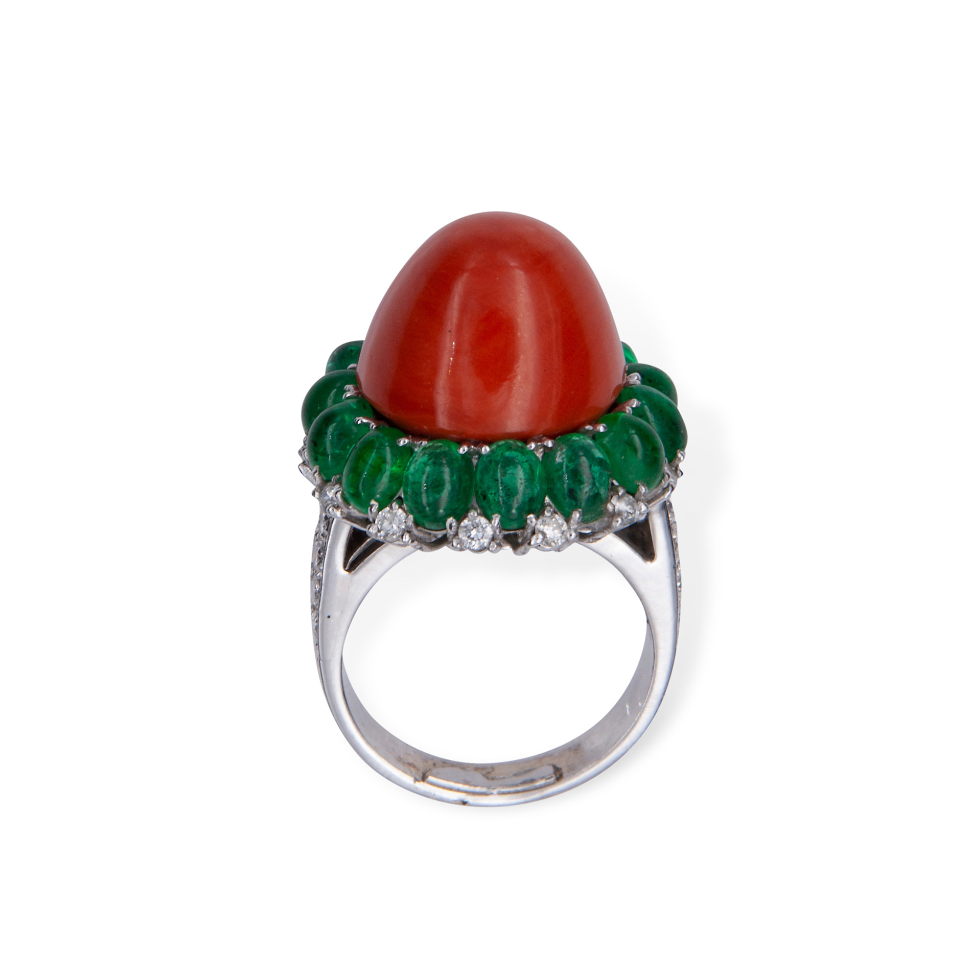 Anello in oro bianco, corallo, diamanti e smeraldo Oro bianco 18 kt, corallo cerasuolo centrale rotondo taglio cabochon appuntito; 14 smeraldi ovale taglio cabochon, peso totale stimato 6,30 ct. 40 diamanti rotondi taglio brillante, peso totale stimato