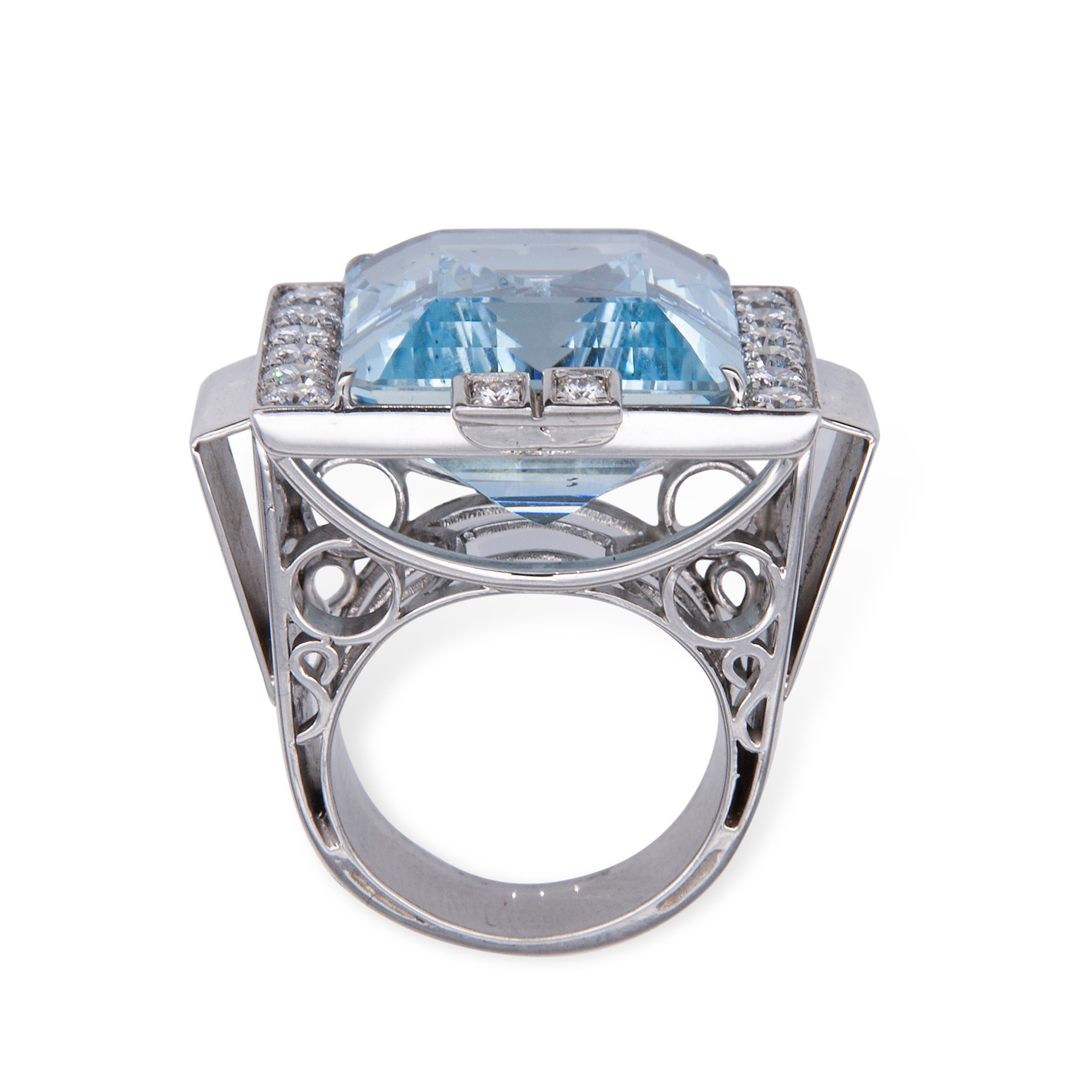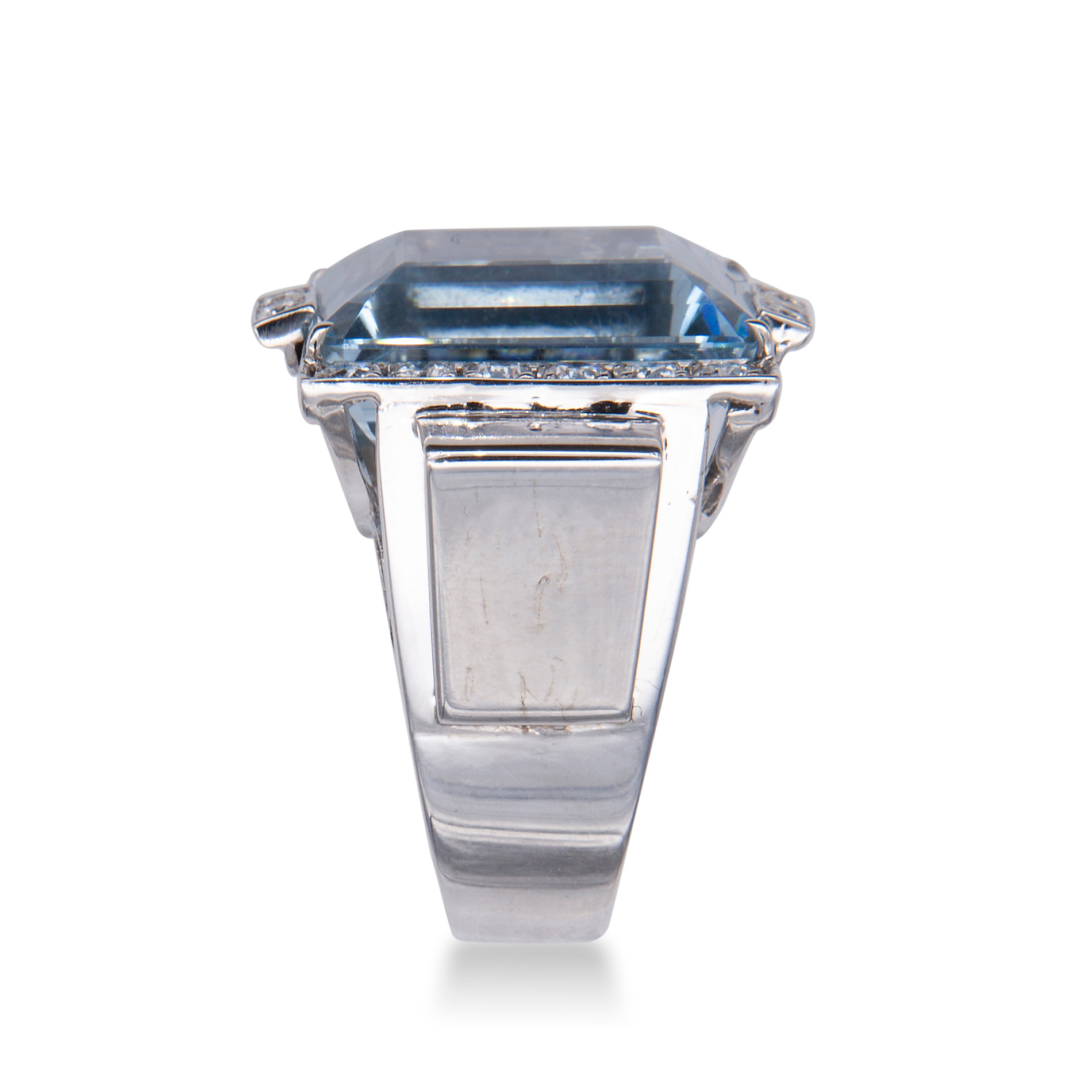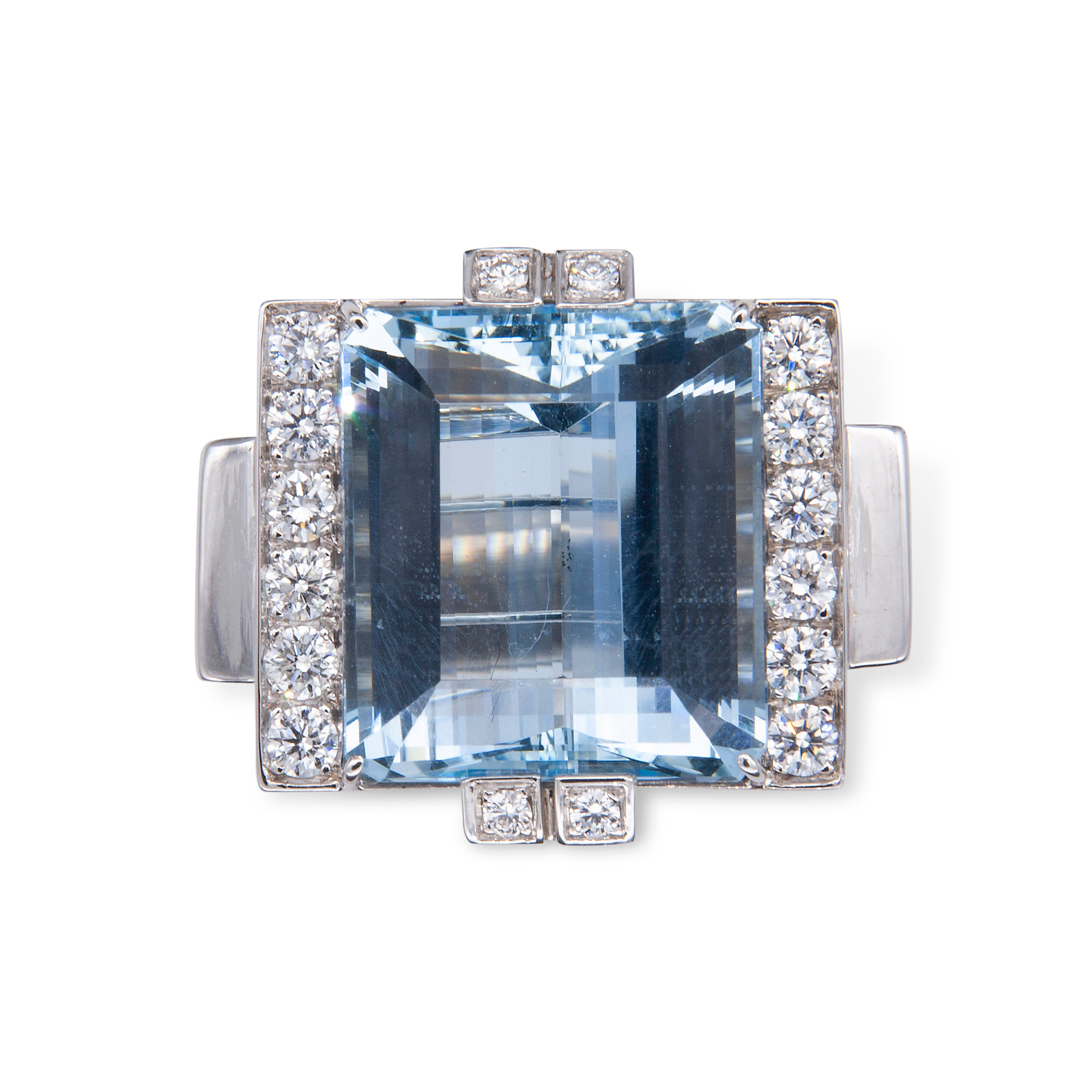 Anello in oro e acquamarina Oro bianco 18 kt, 18 diamanti rotondi taglio brillante; 1 acquamarina rettangolare taglio a gradini, peso stimato 28 ct