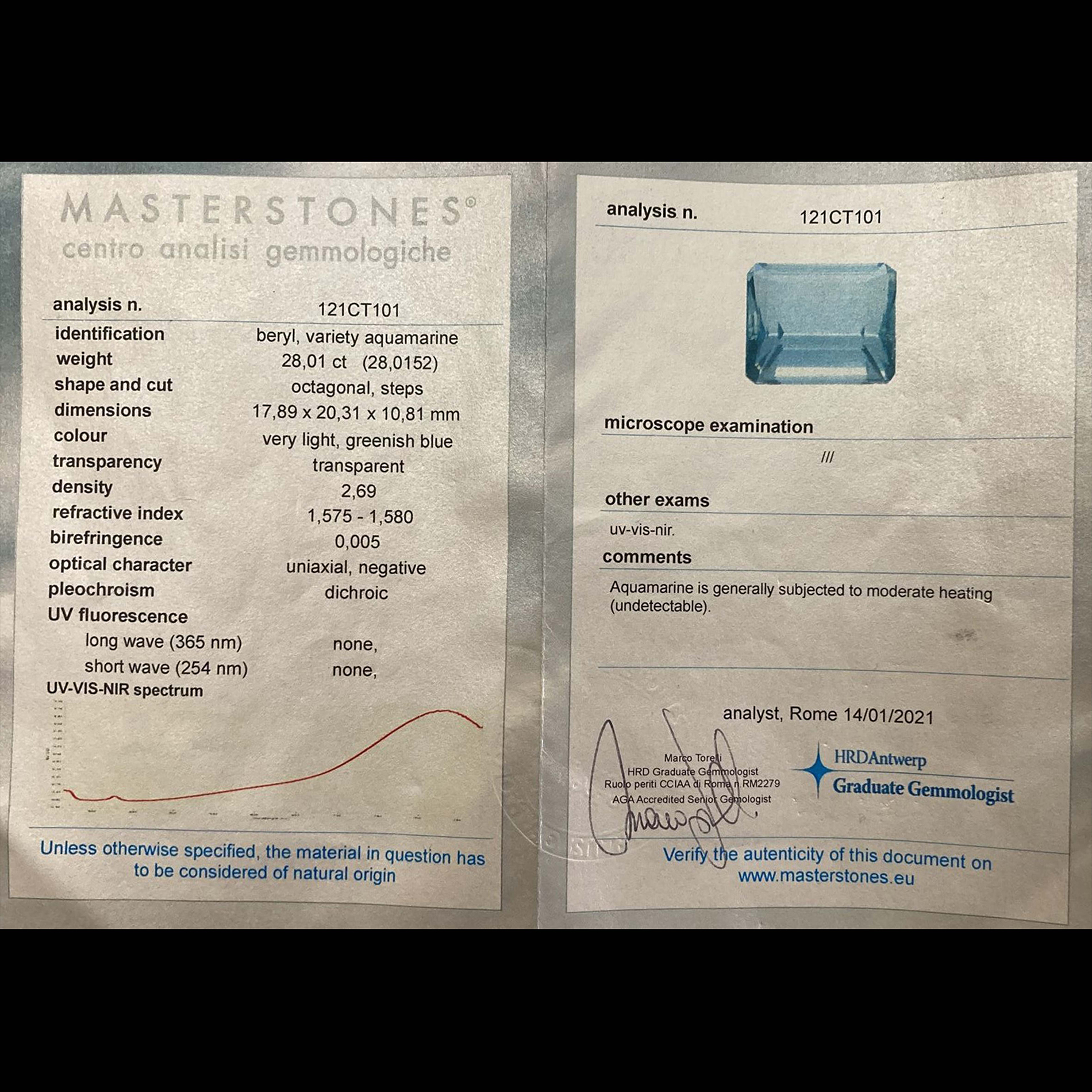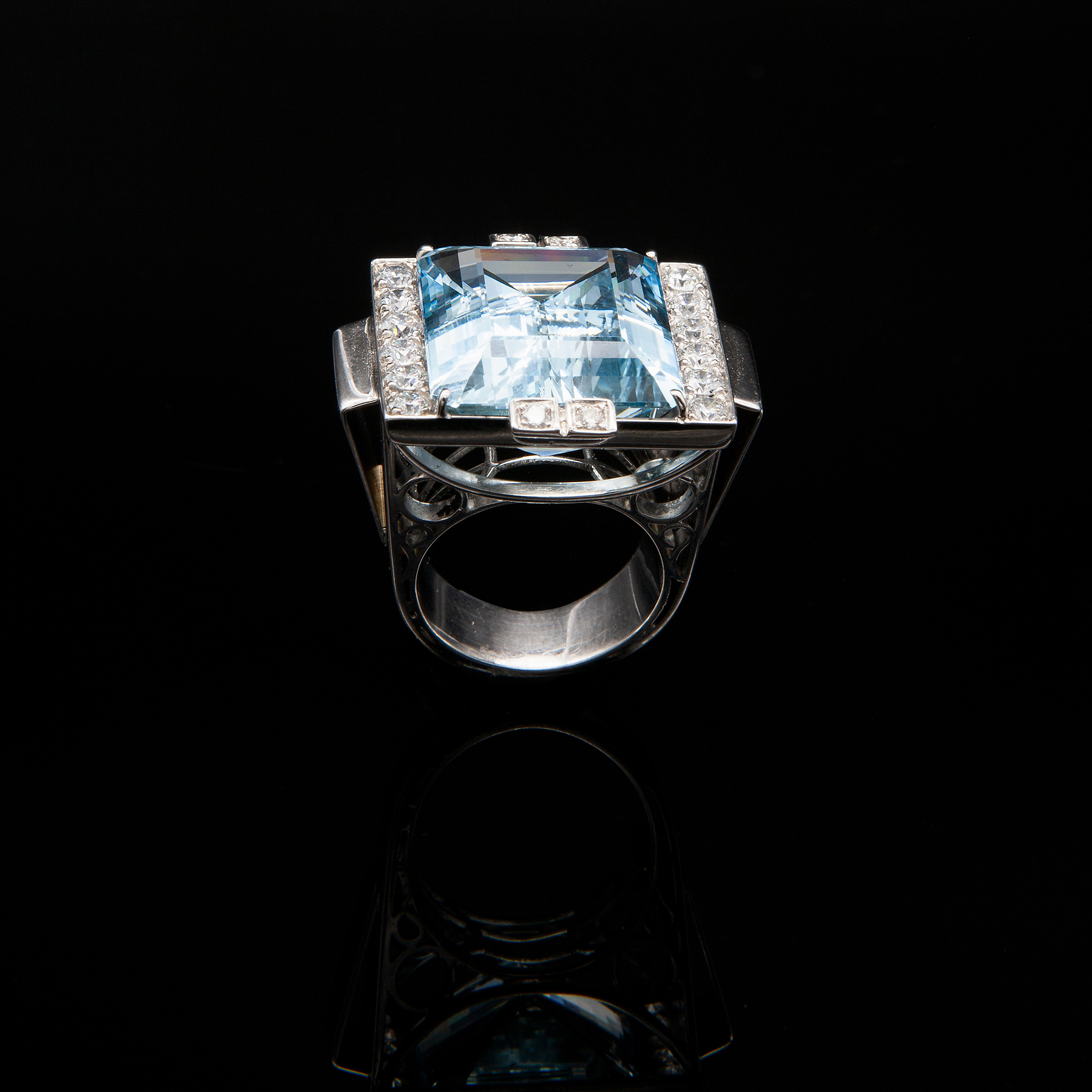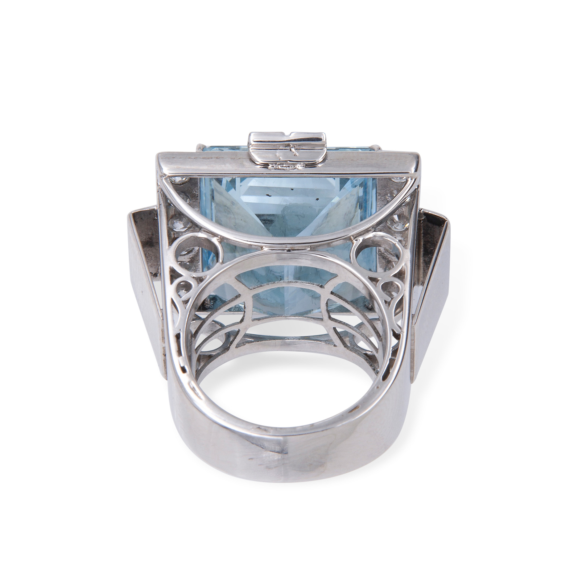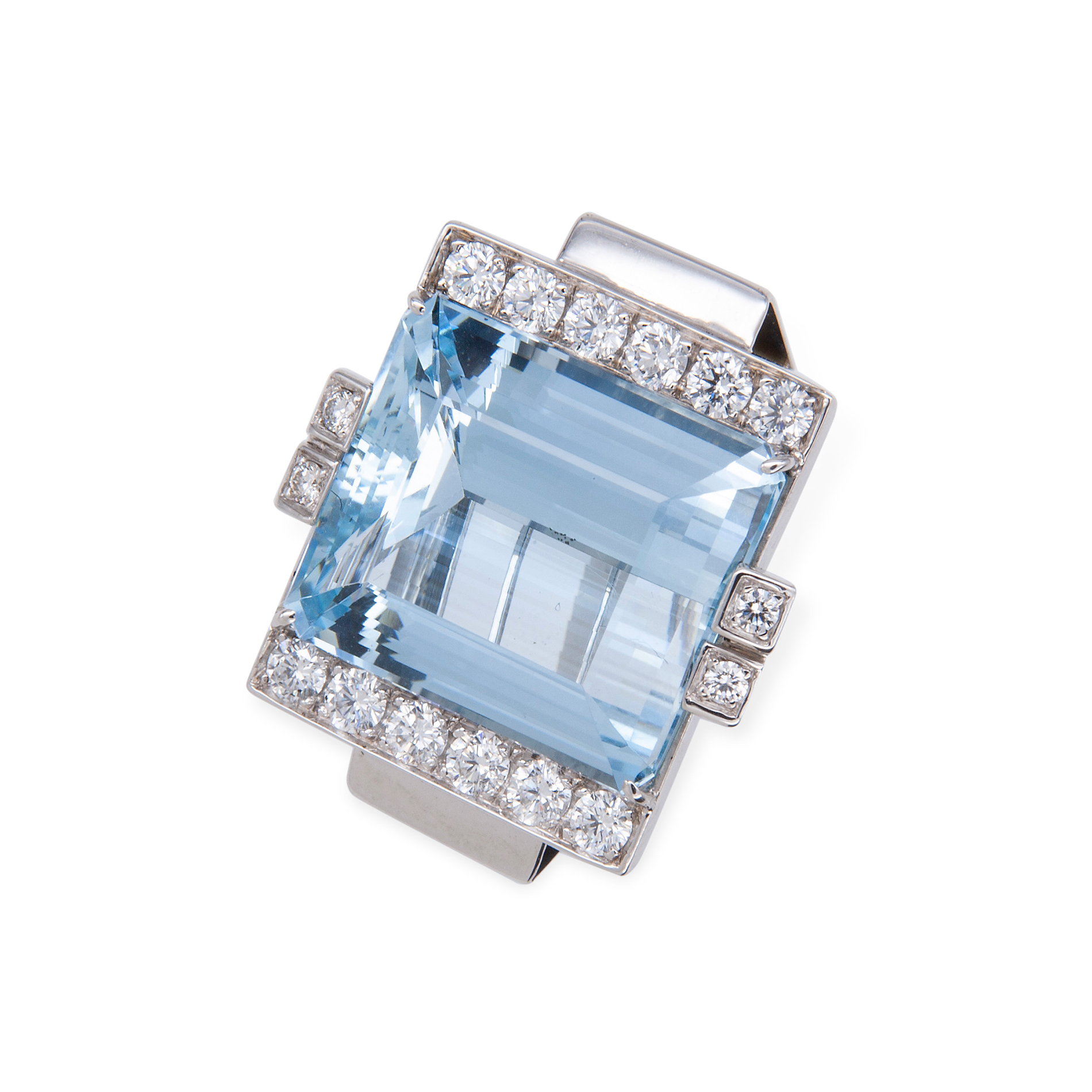 Anello in oro e acquamarina Oro bianco 18 kt, 18 diamanti rotondi taglio brillante; 1 acquamarina rettangolare taglio a gradini, peso stimato 28 ct