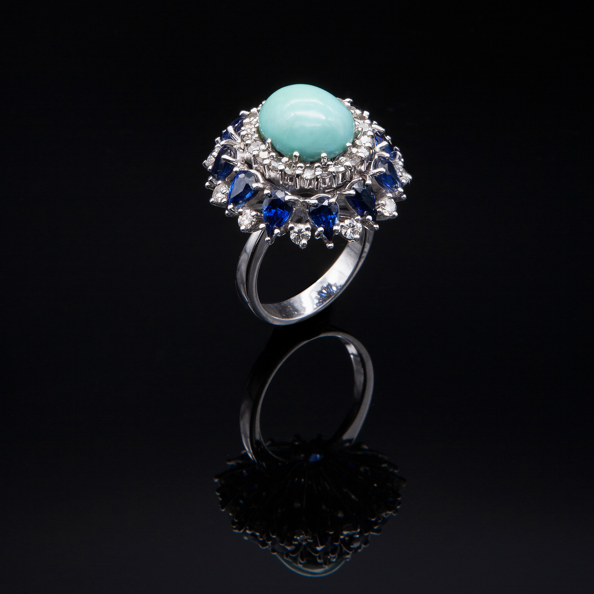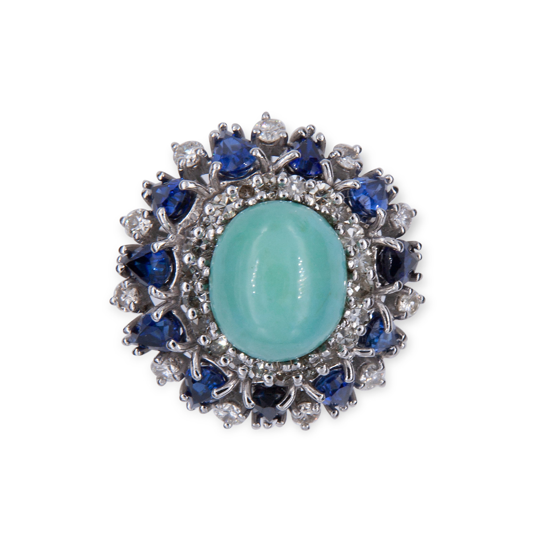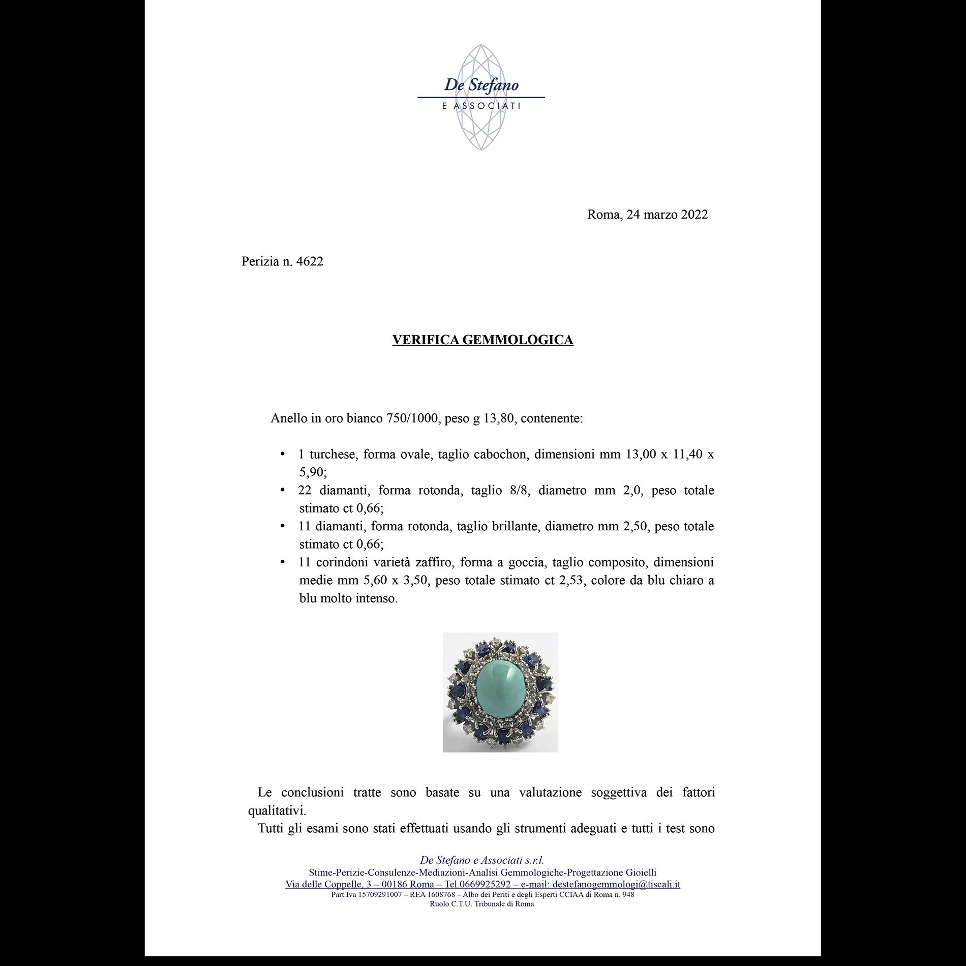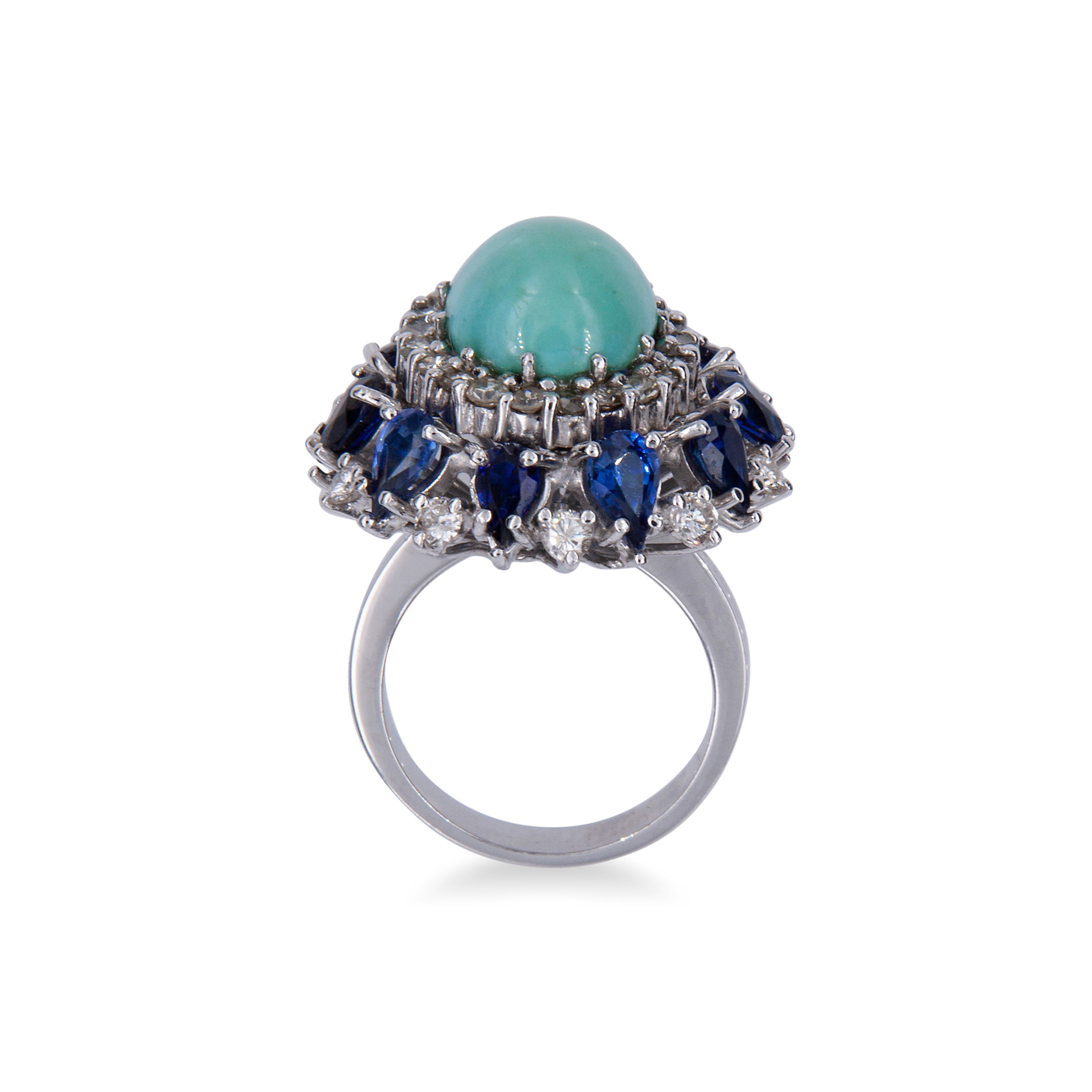 Anello in oro bianco, turchese, diamanti e zaffiri Oro bianco 18 kt, 1 turchese ovale taglio cabochon, 33 diamanti rotondi taglio brillante e 8/8, peso totale stimato1,32 ct; 11 zaffiri a goccia taglio composito, peso totale stimato 2,53 ct. Peso comple