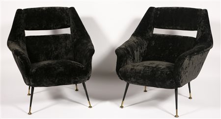 MANIFATTURA ITALIANA DEL XX SECOLO Coppia di poltrone. Metallo e tessuto. Cm 73,00 x 78,00 x 80,00. Anni '50.